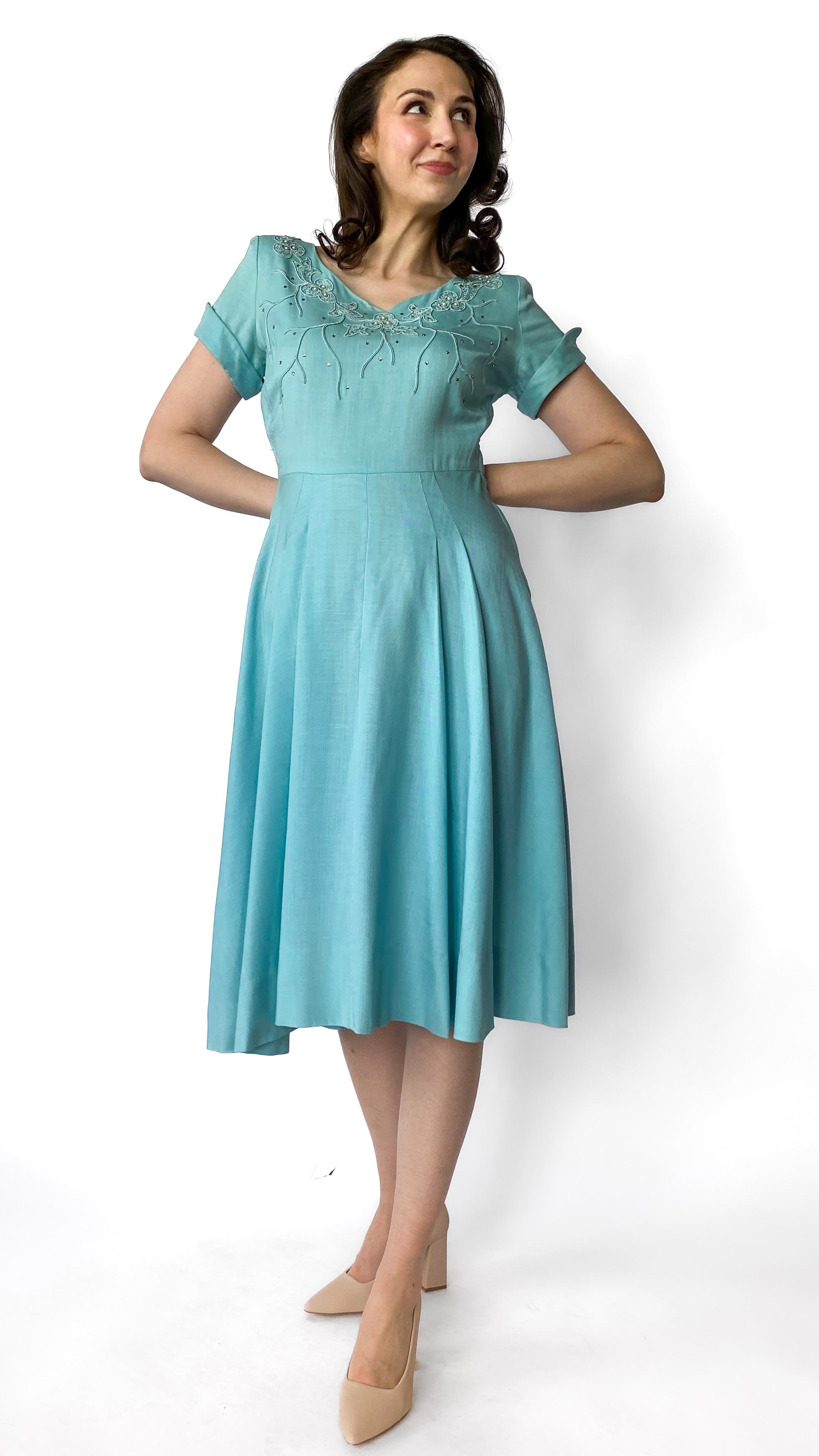 1950s Light Blue Jeweled Fit and Flare Dress, sz. S/M