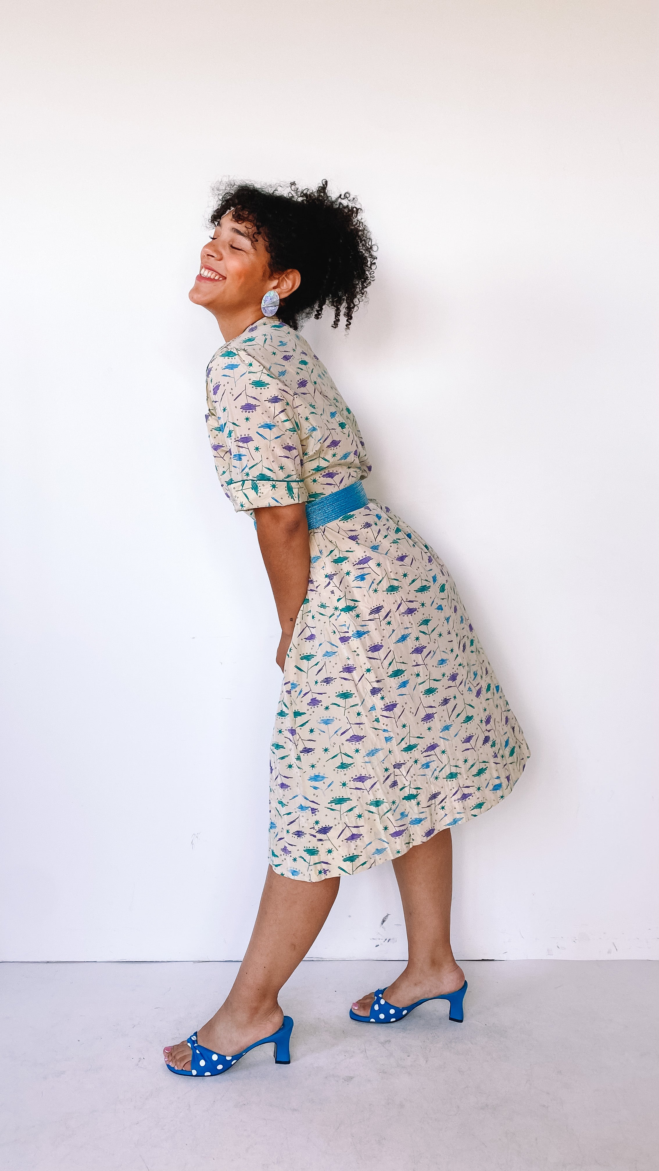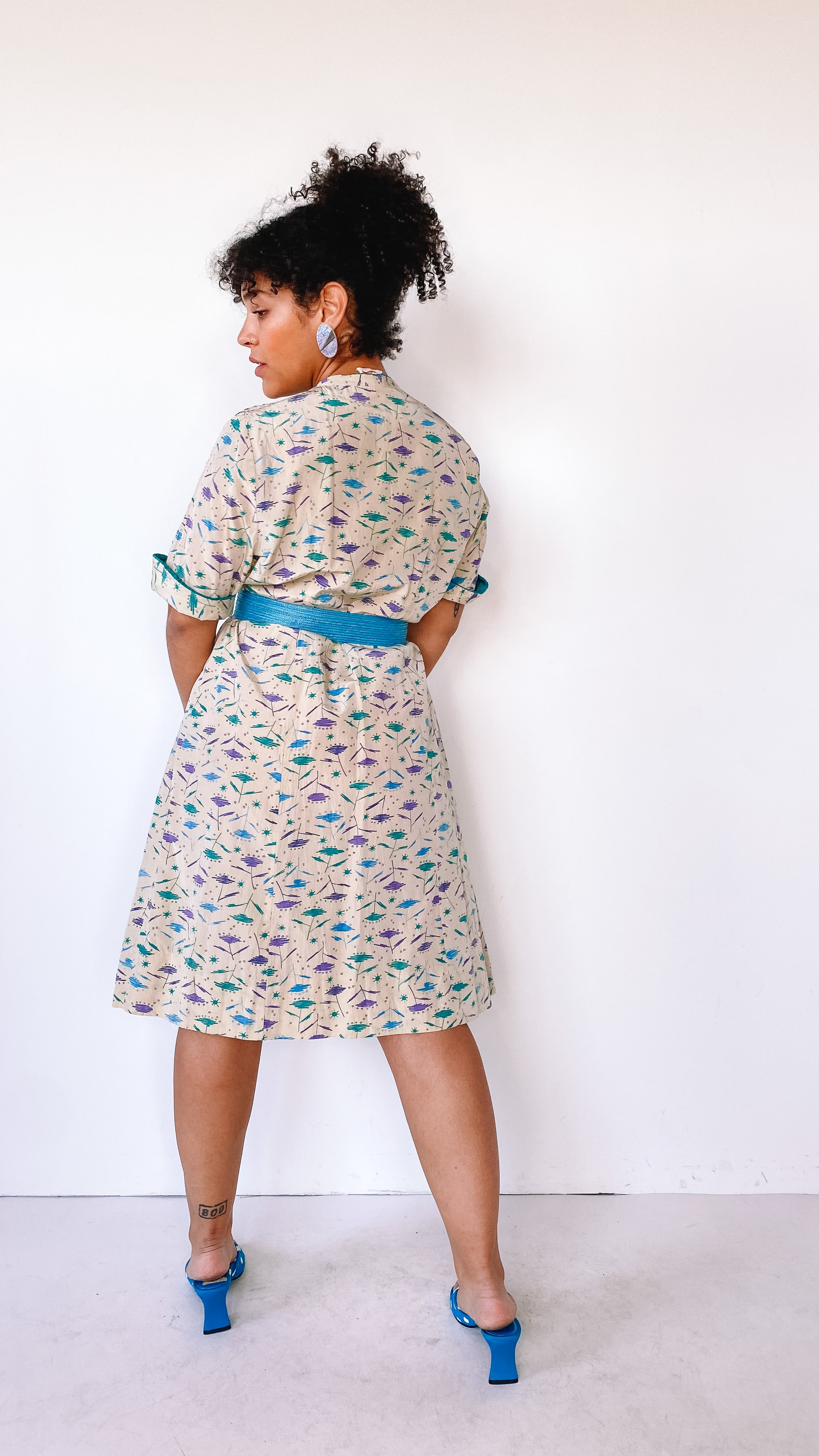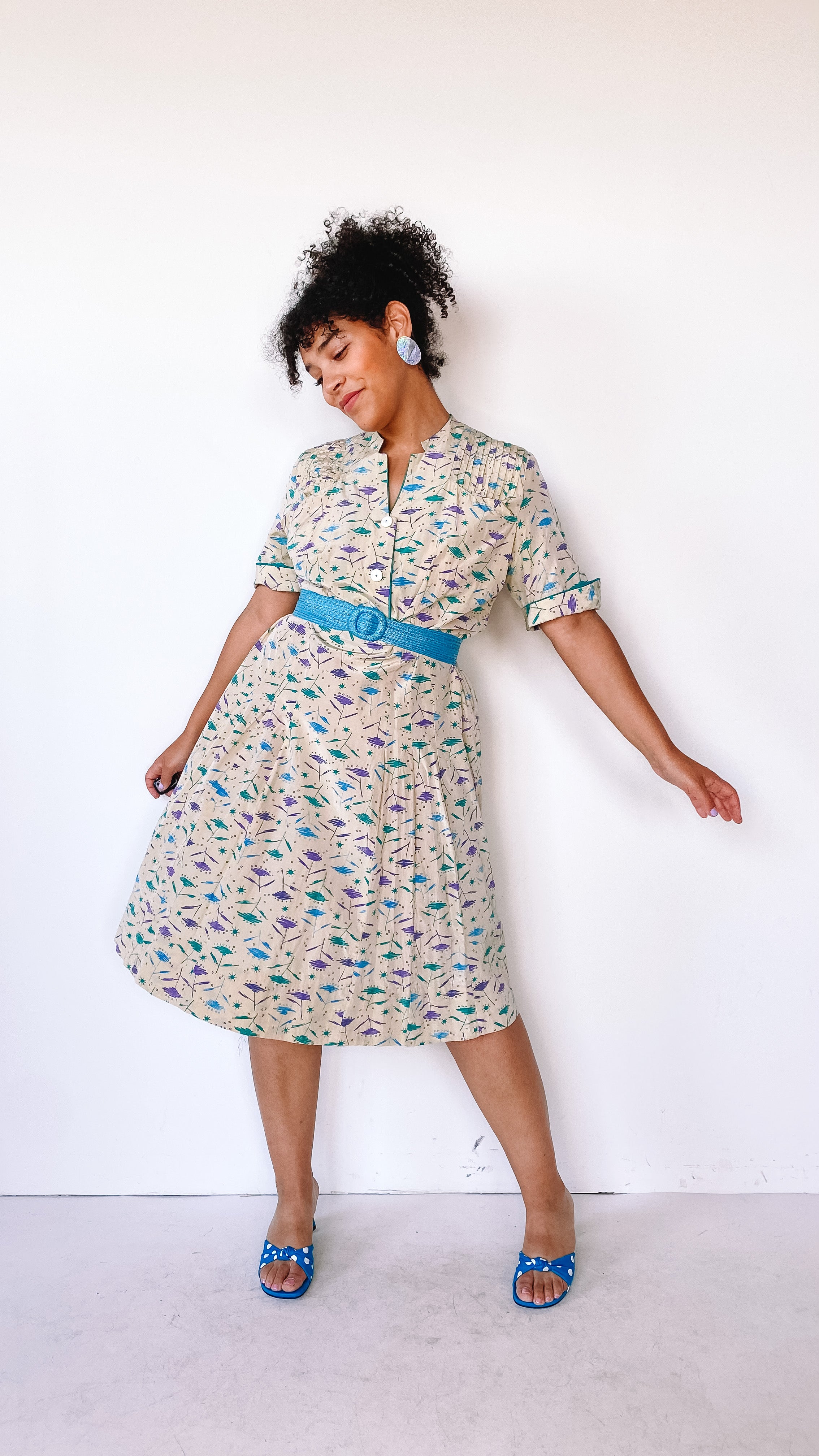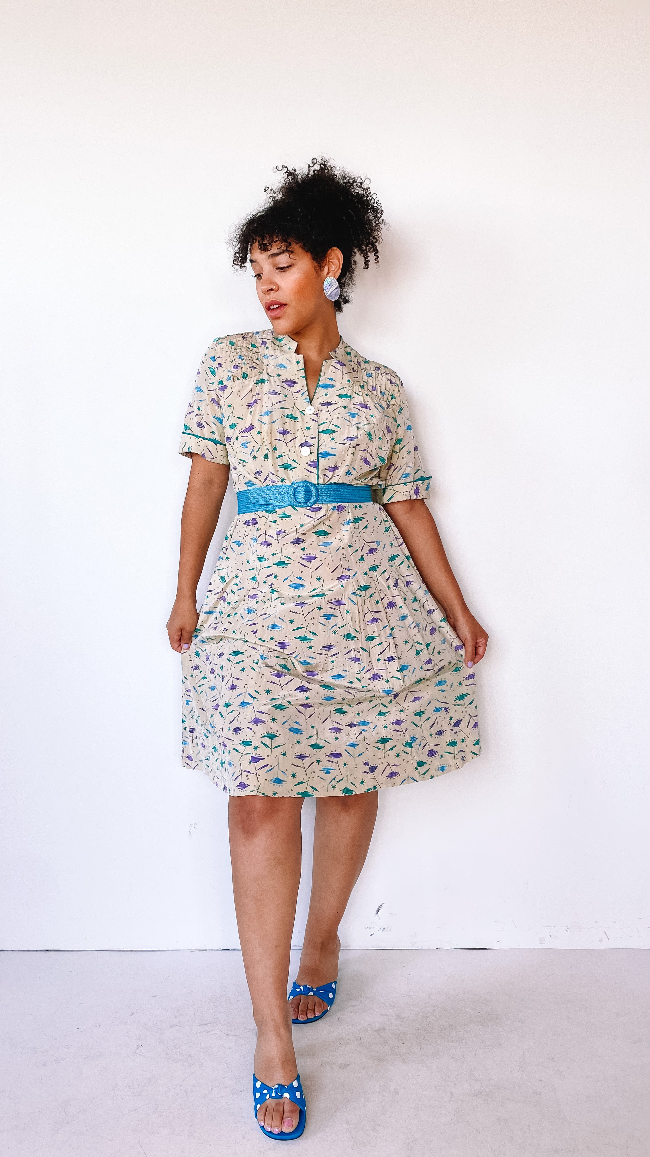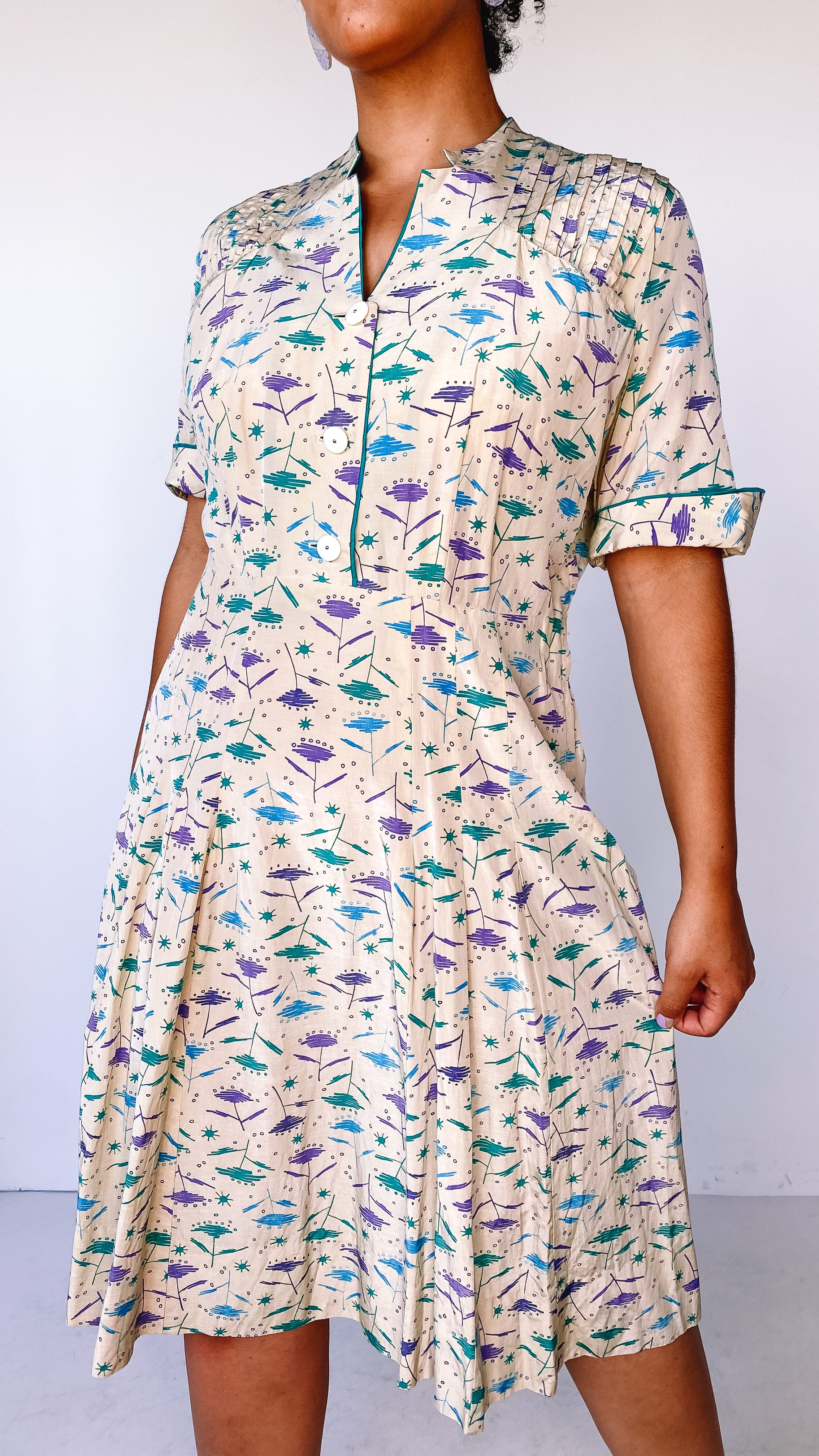 Mid-length dress with short sleeves and buttons on the top portion of it. Green, blue, and purple abstract, googie design throughout. Darts in the waist and pleats towards the bottom on the front of the dress. Dart/line detailing on both shoulders. Two symmetrical pockets on the upper chest area on both sides in the front. Cuffed short sleeves. Three buttons to button-up the top of the dress. Zipper on the left side seam of the dress.