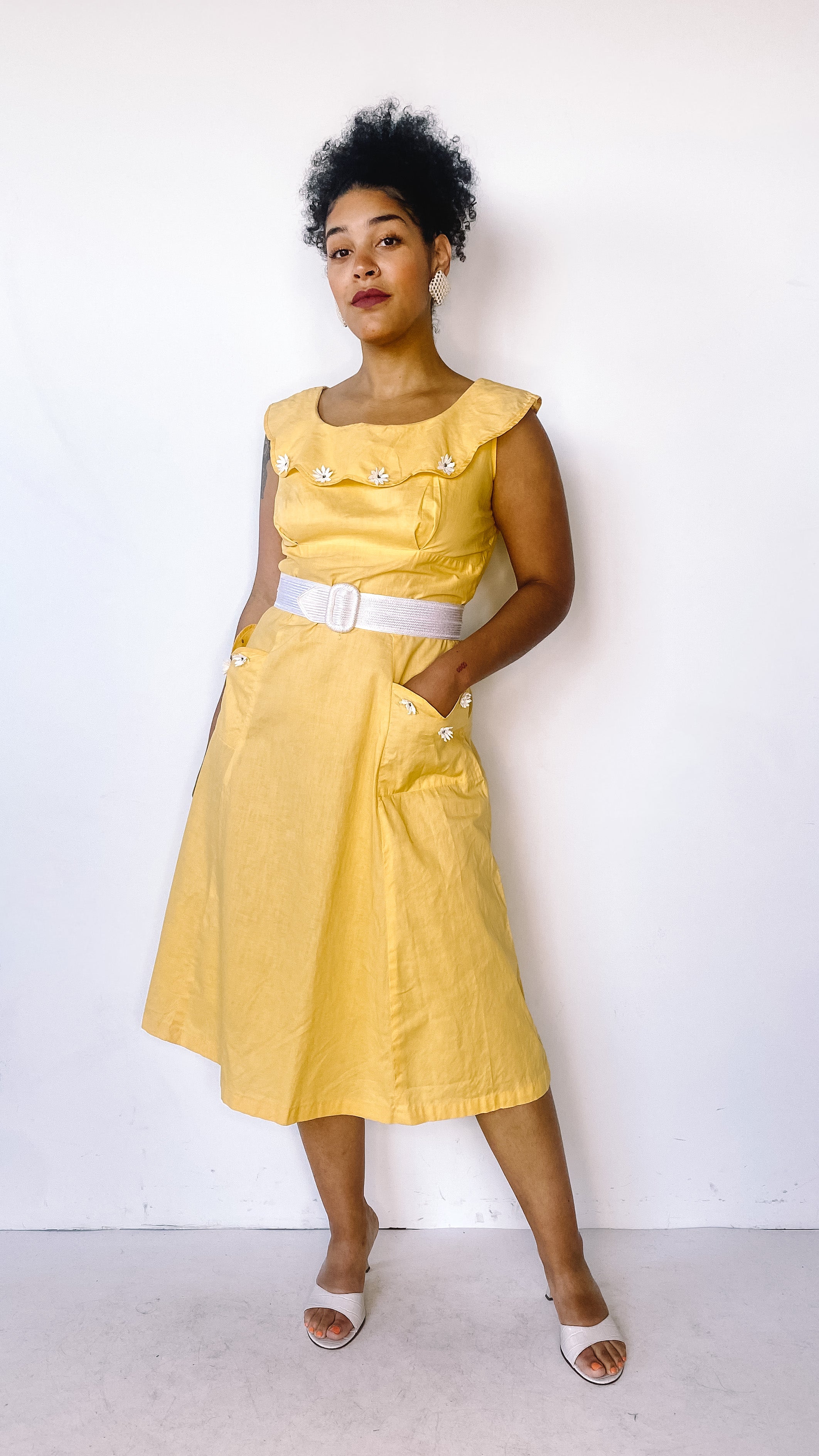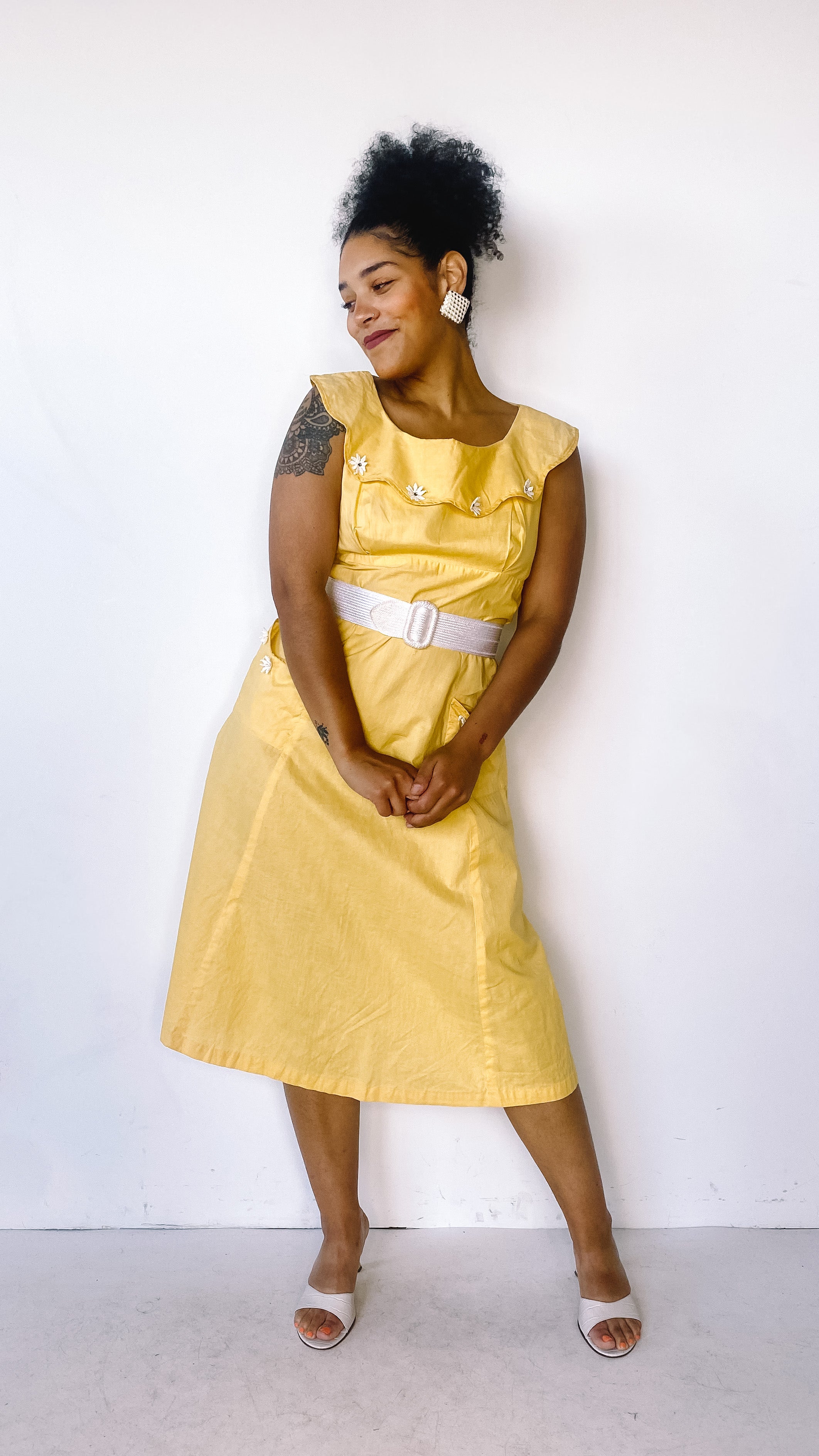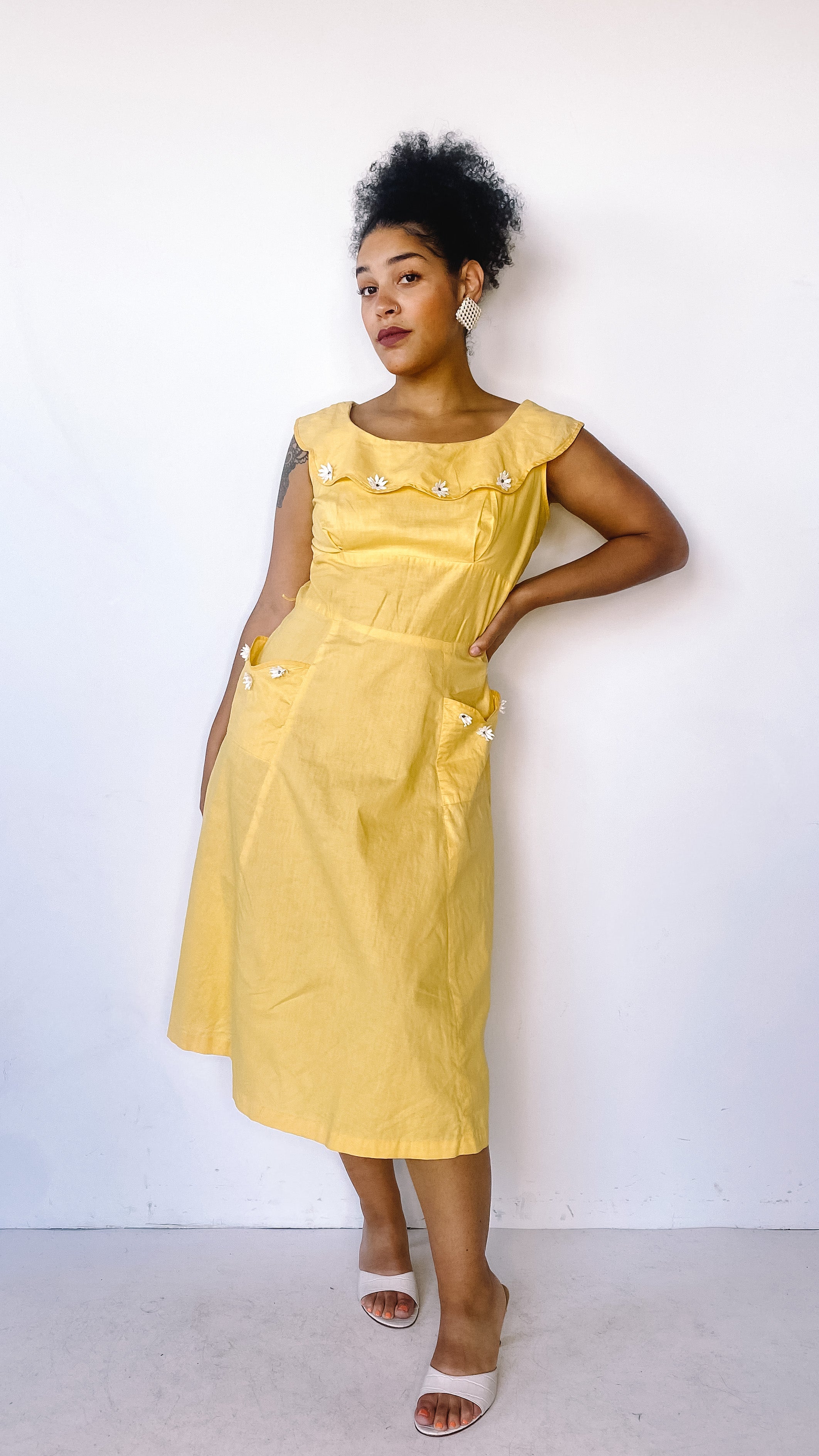 Sleeveless yellow dress with embroidered daisy embellishments on the collar and front pockets. Buttons on the left waist to close. Good vintage condition - slight discoloration on waistband, some minor spots. Priced as-is.