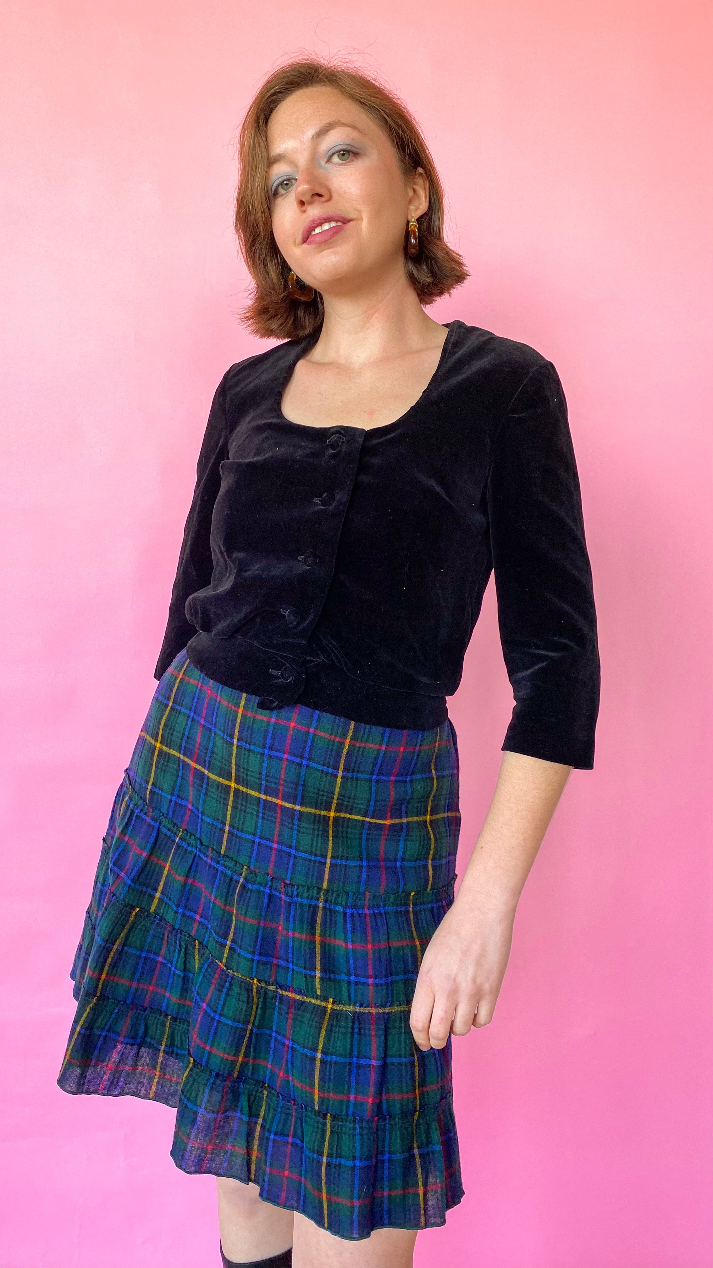 Black velvet cropped jacket. Buttons up the front. Lined. Could be worn as a blouse by itself.