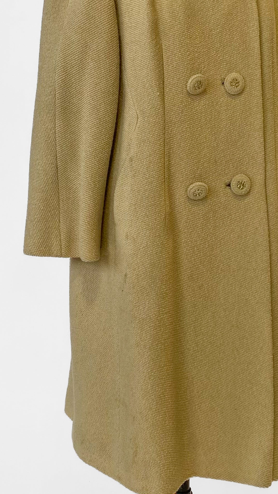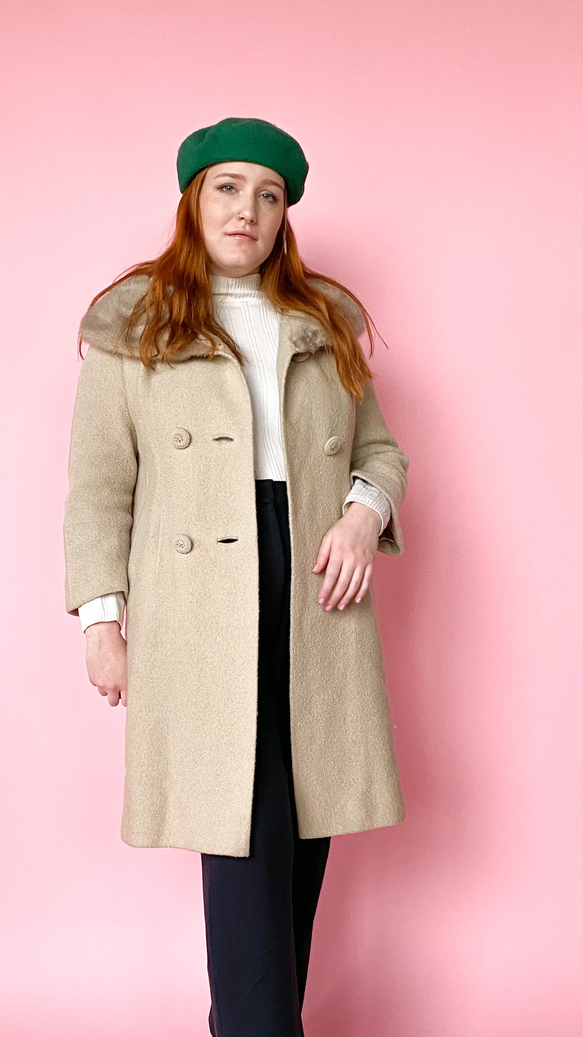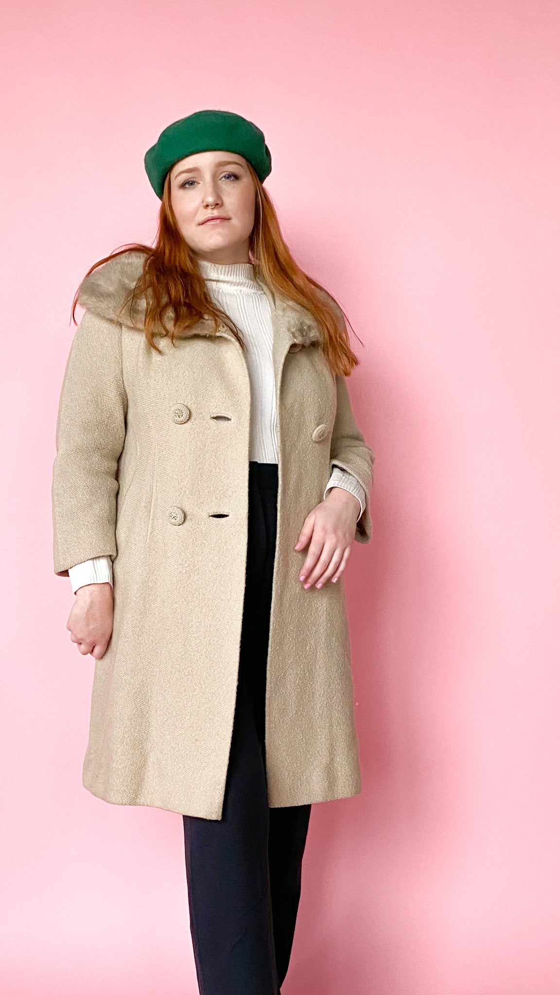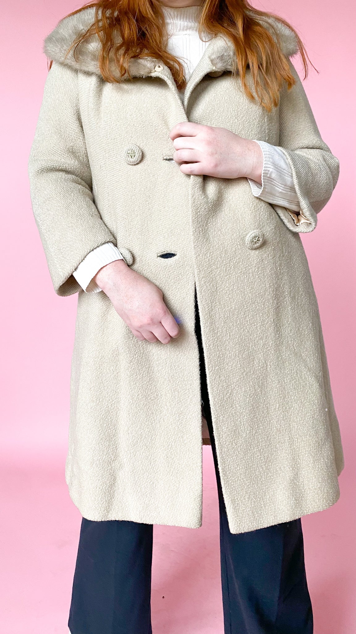 Description: Cream double breasted coat with a fur collar. Buttons up the front. Pockets. Lined. Brand: Sears Fashion