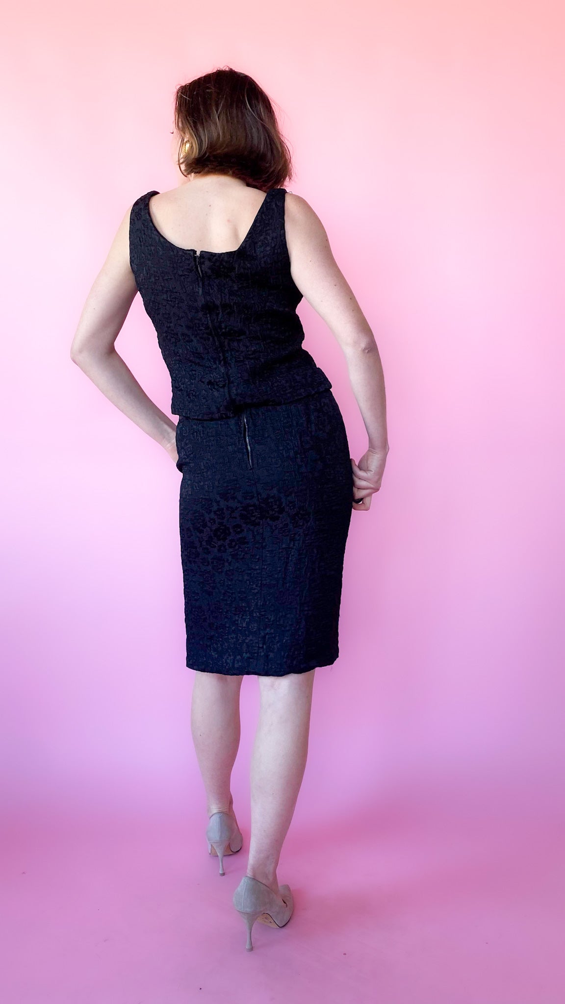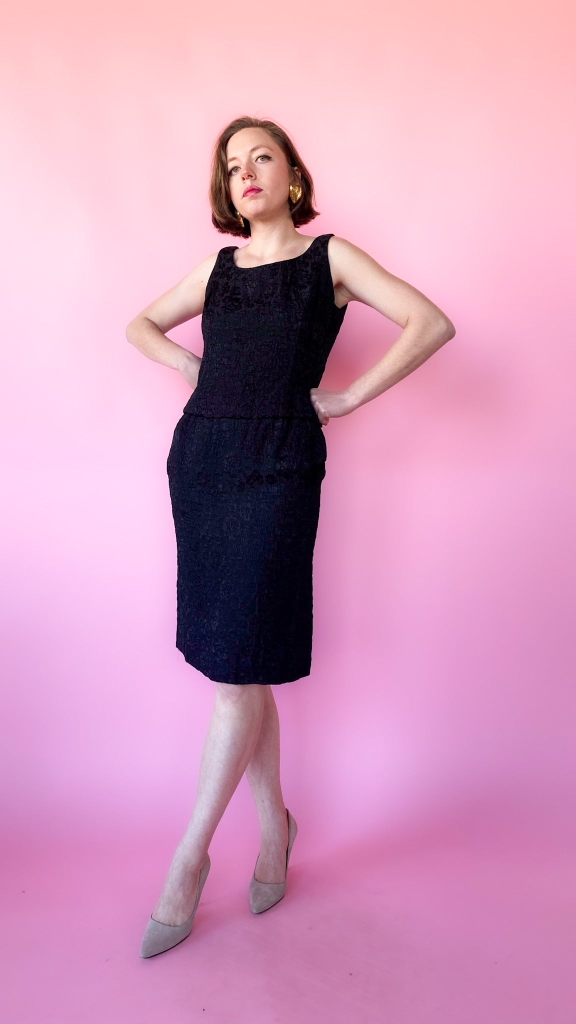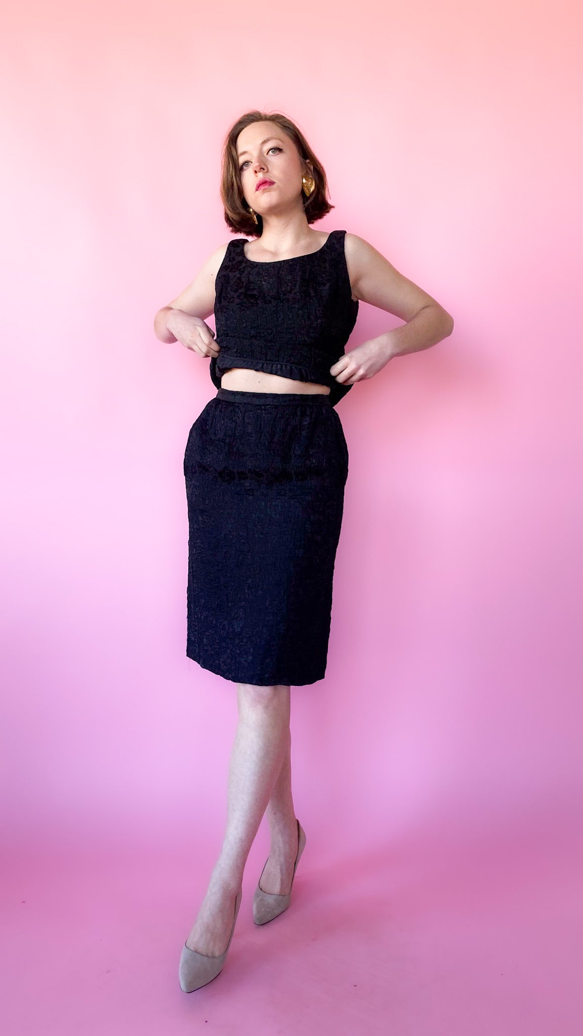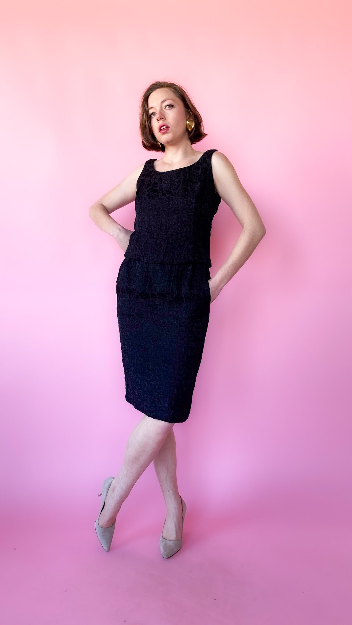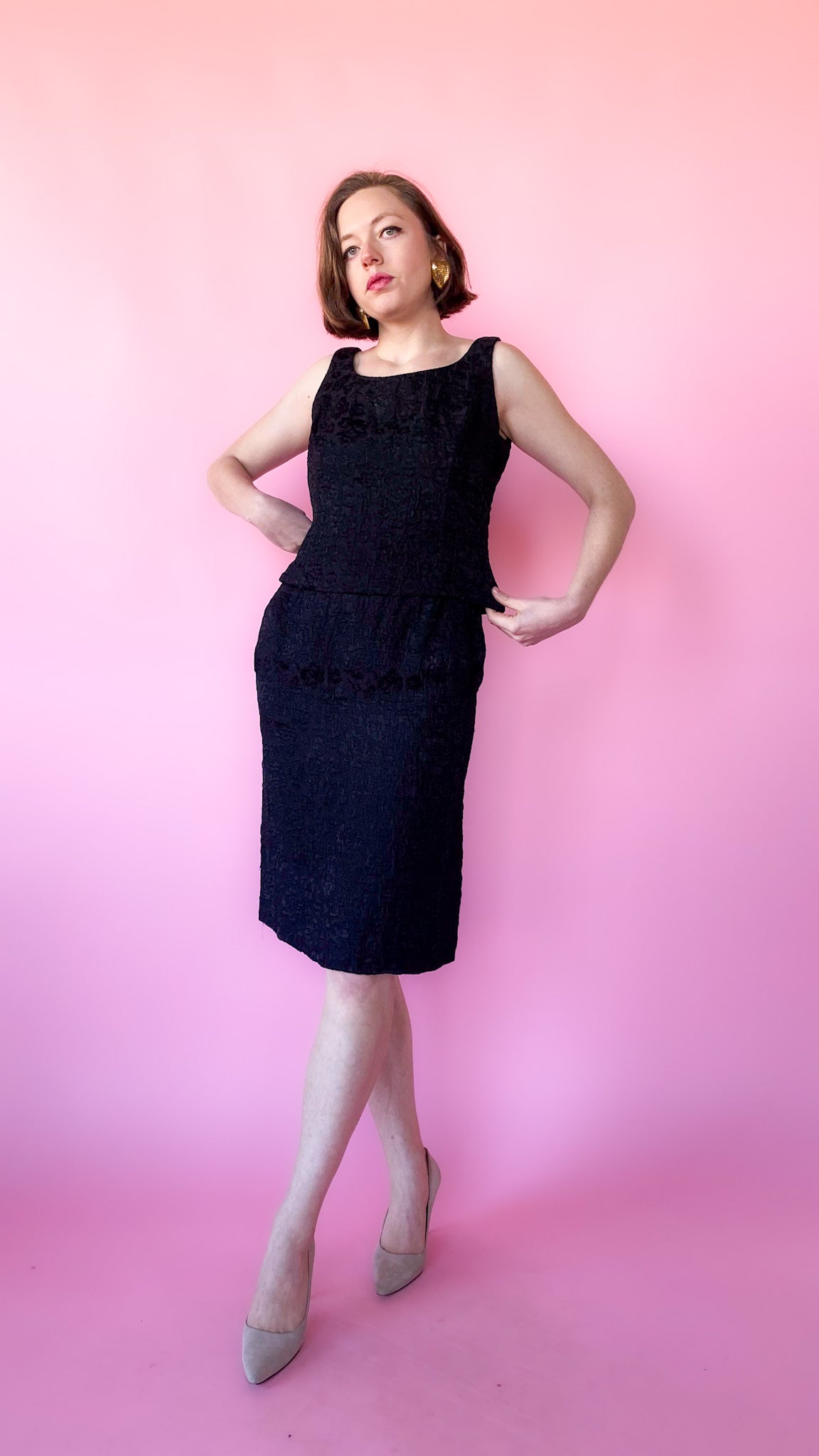 Description: Skirt and top set. Heavy, quilted black material. Zips up the back. Lined. Looks like a dress when worn together.