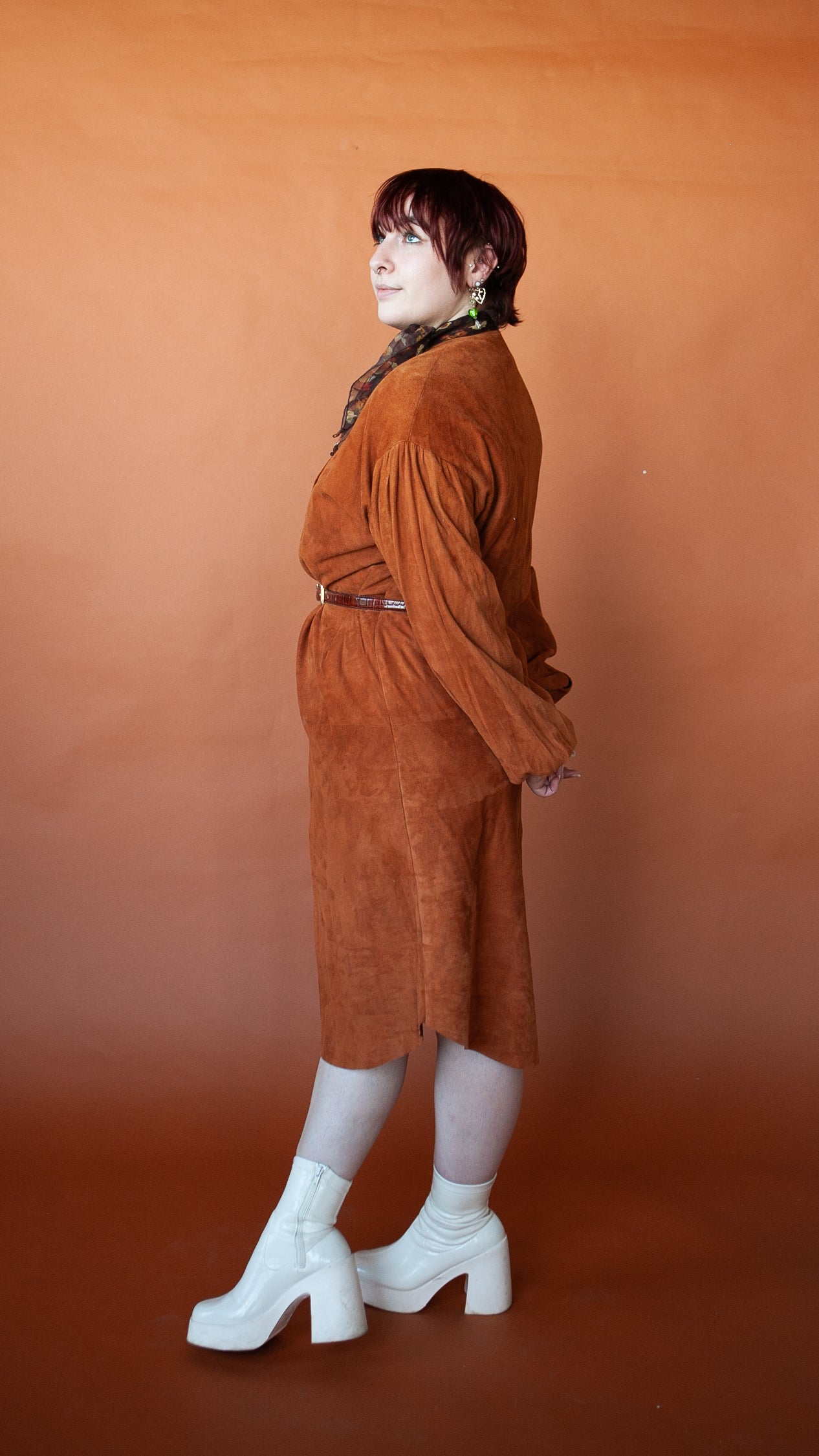 70s brown leather suede dress that hits just at the knee. Button opening on the front. Lined on the body not the sleeves. Long sleeved with button cuffs. No collar.
