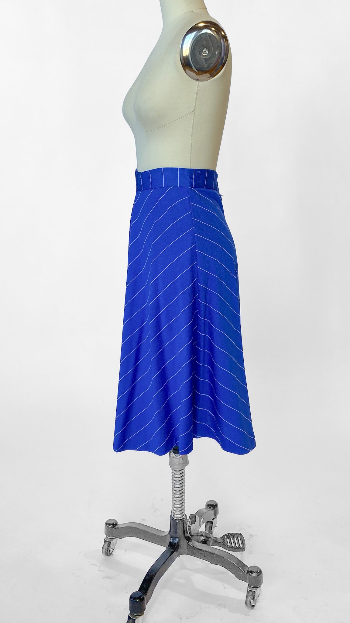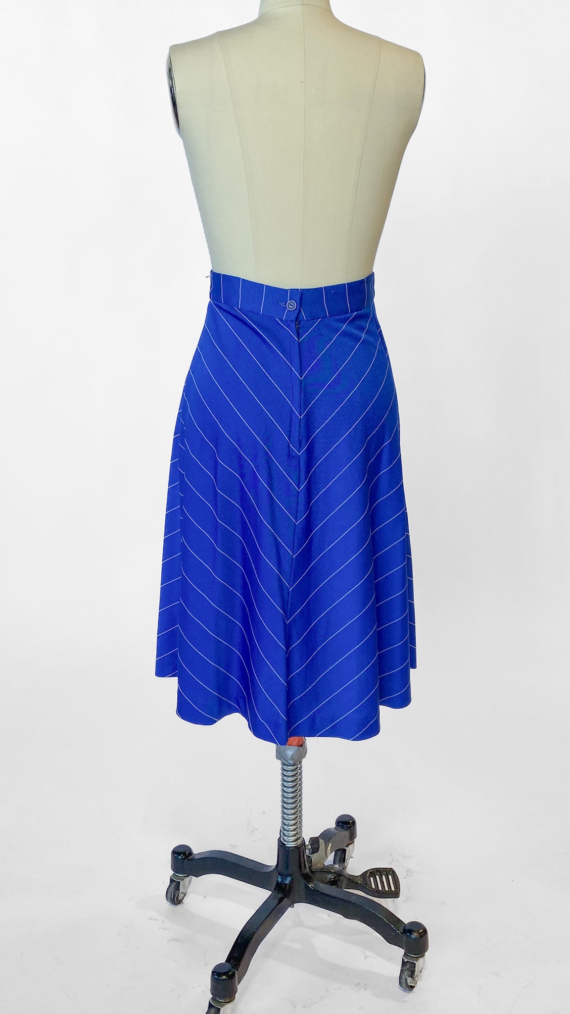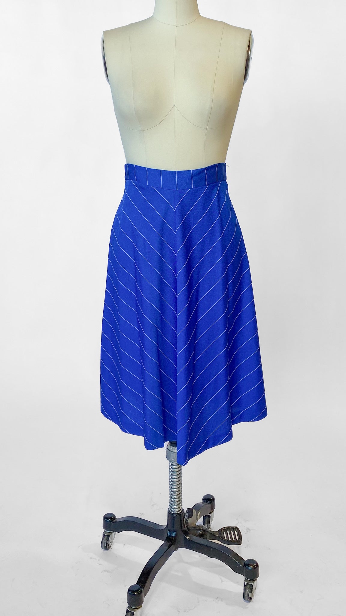 Cobalt blue a-line midi skirt with thin white chevron stripes. Has zipper closure down center back, and button closure at waistband.