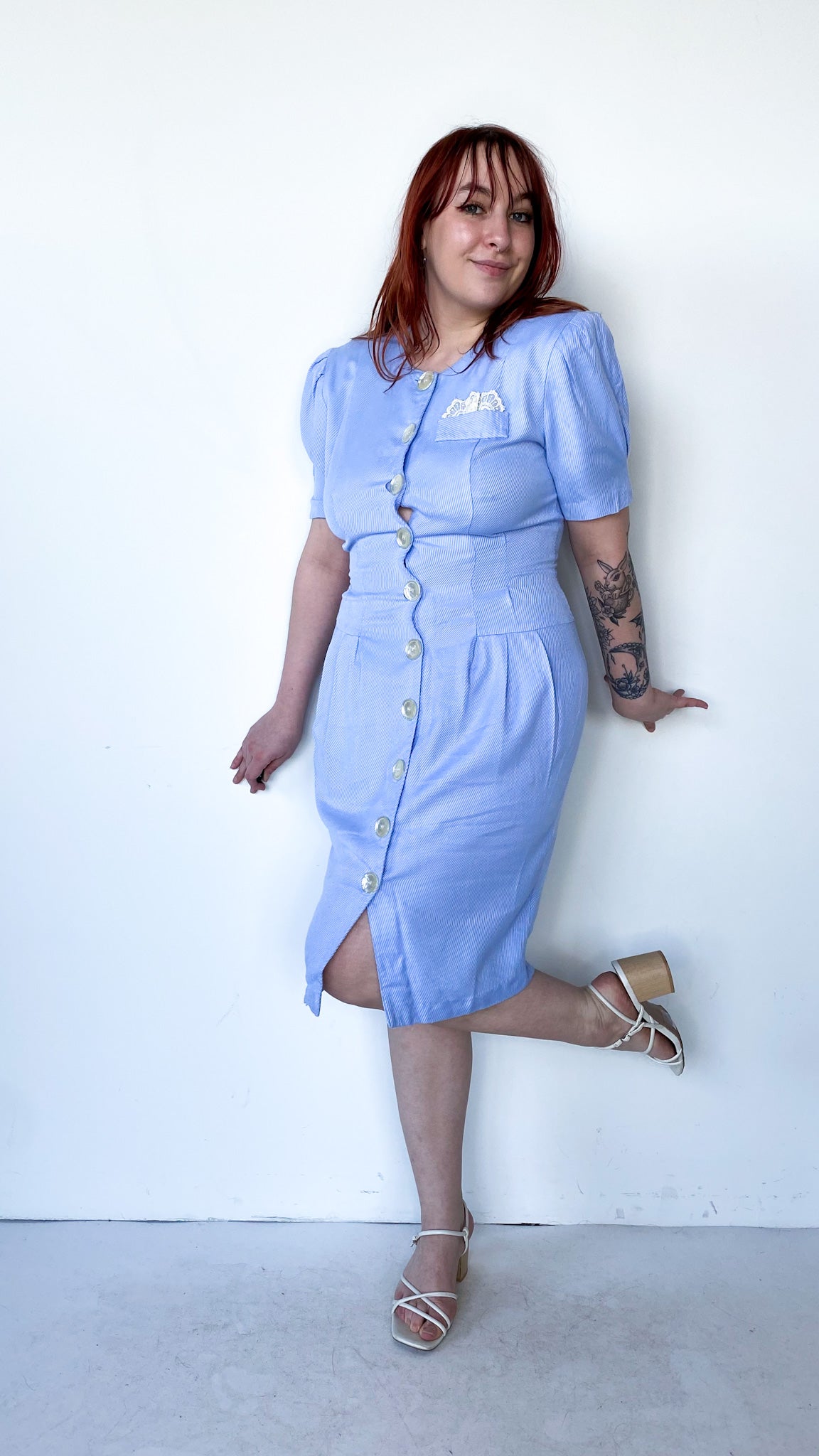 1980s baby blue short sleeve dress with large buttons going up the whole front. Non-functional pocket on the left chest with lace detail peeking out the top. Pleated skirt. Good vintage condition- no visible flaws.