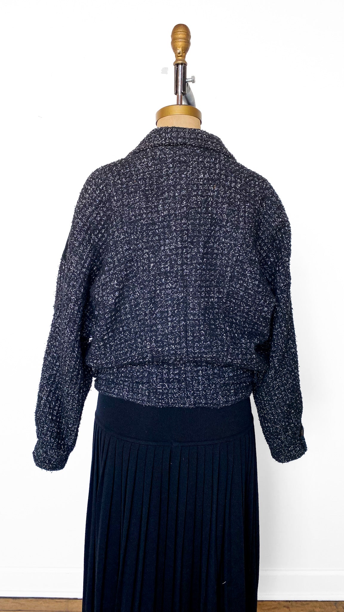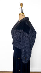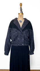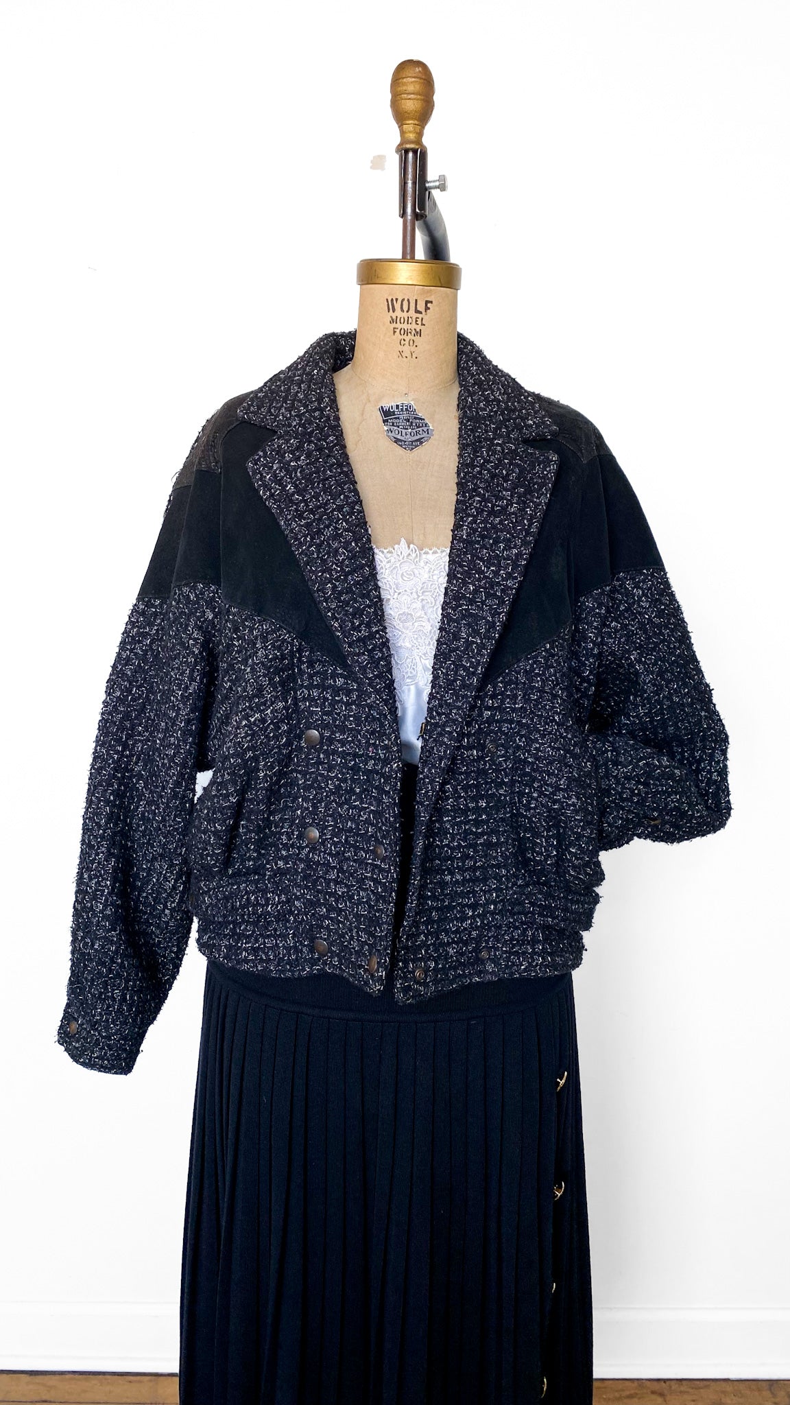Black and white tweed double breasted jacket with black leather detailing on chest. Metal snap buttons, welt pockets, bat wing sleeves.