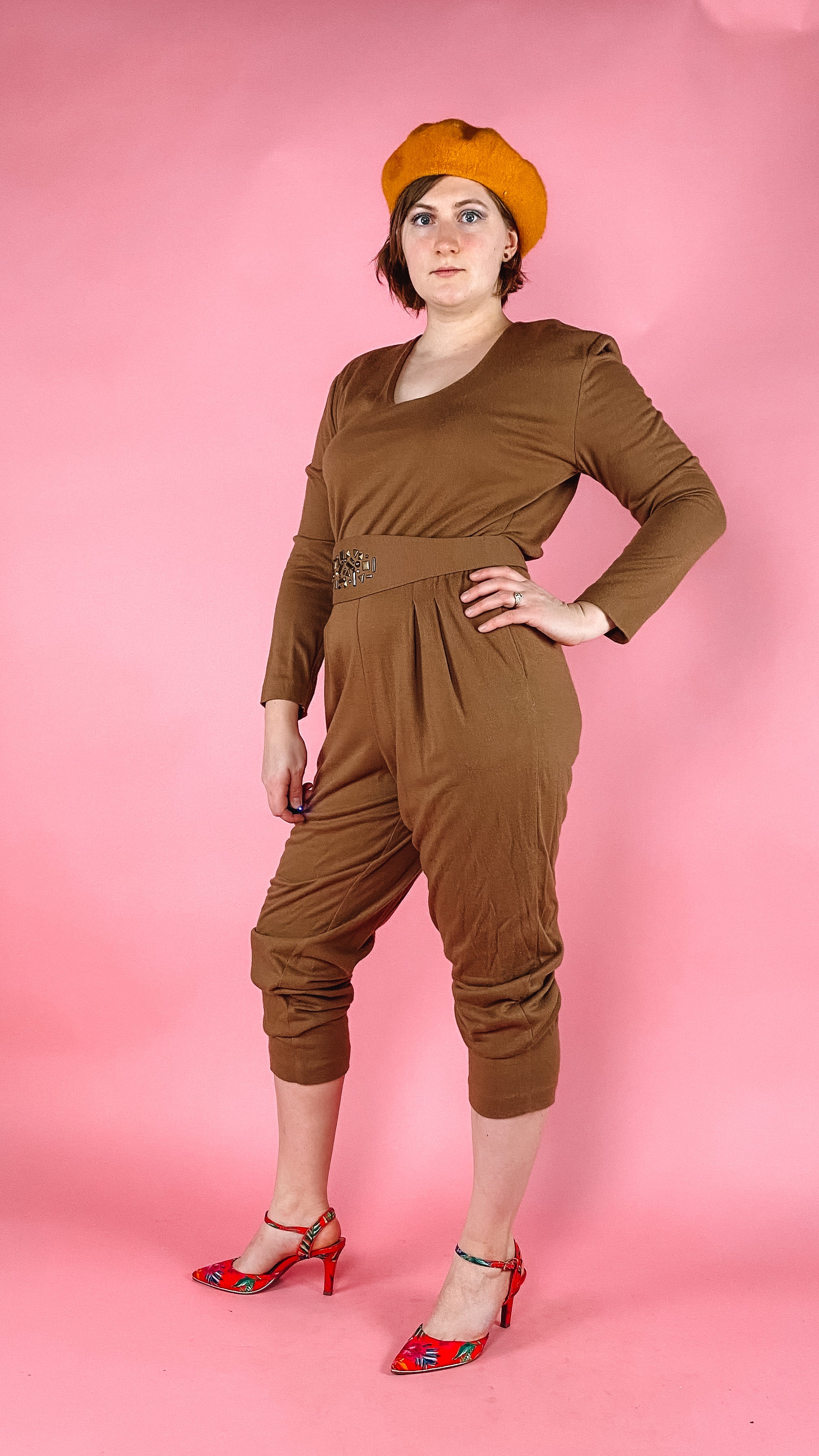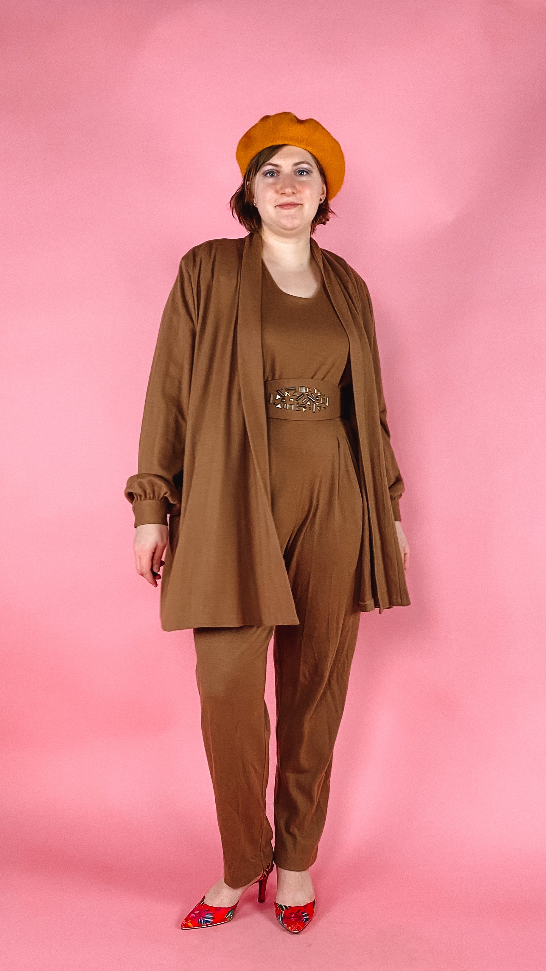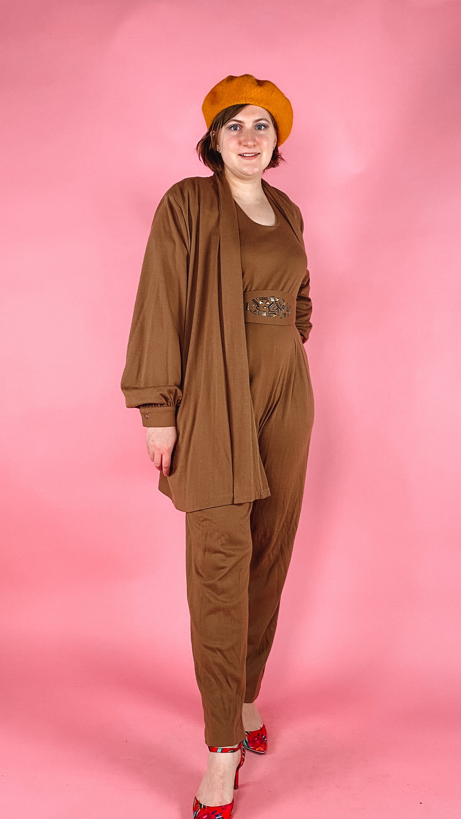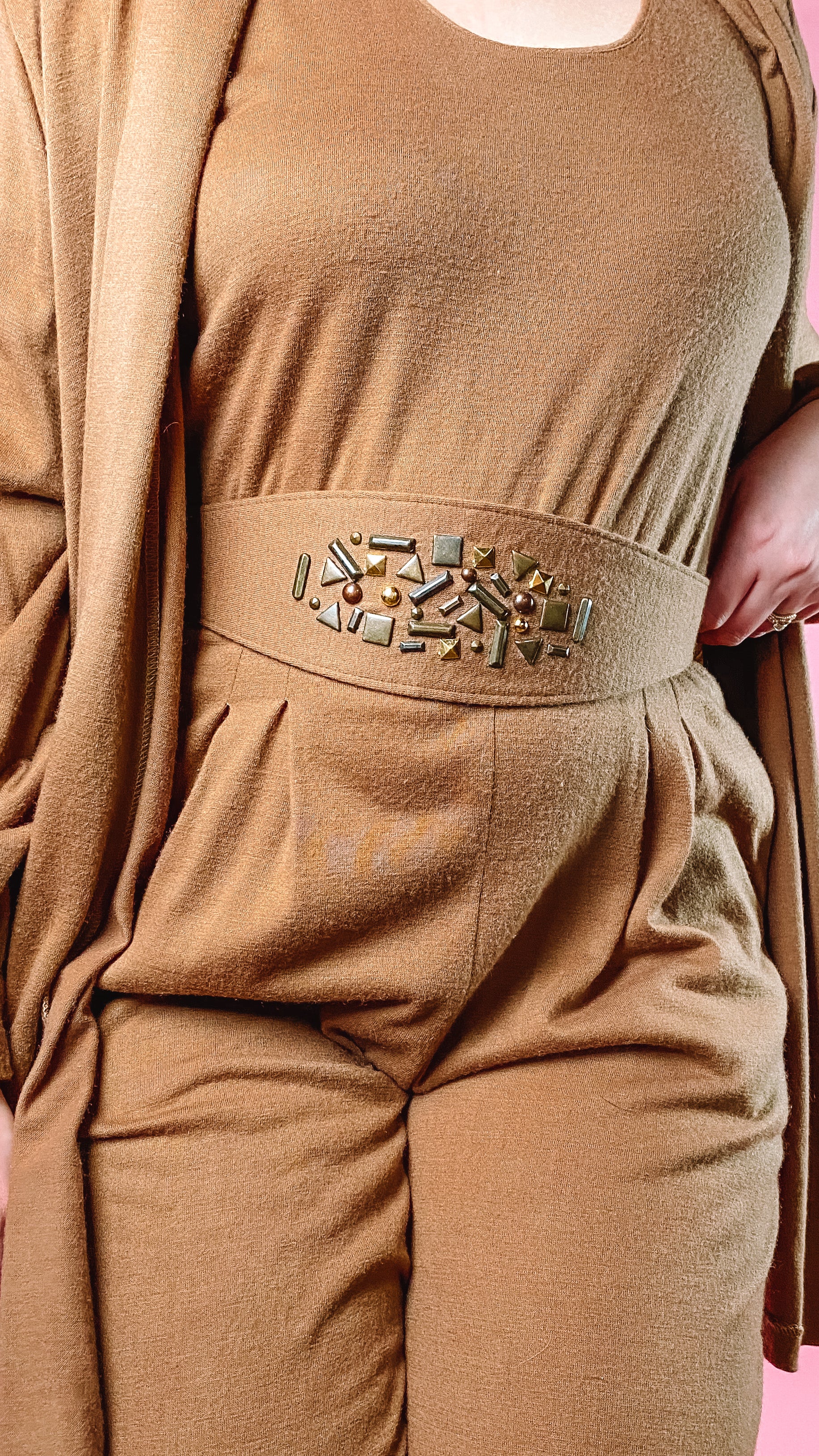 Coffee colored long sleeve jumpsuit and matching cardigan. Wide waist belt with silver and gold studs on the front. Jumpsuit has an elastic waist with pockets. Straight leg pants. Good vintage condition - no visible flaws.