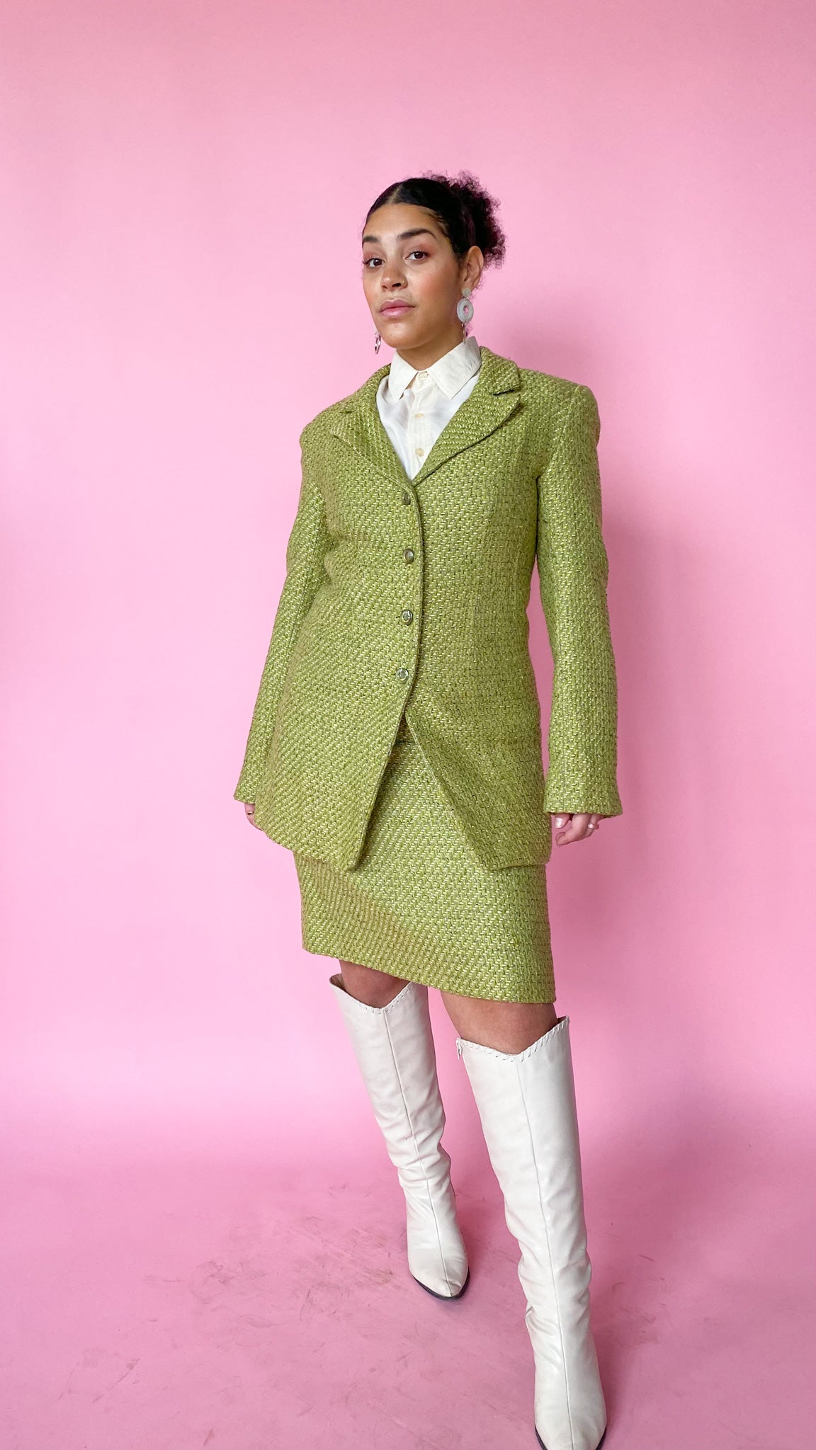 Bright chartreuse green with metallic fibers knit into tweed texture. Green and gold ornate buttons down front. Shoulder pads. Simple matching pencil skirt with side zipper and button closure.