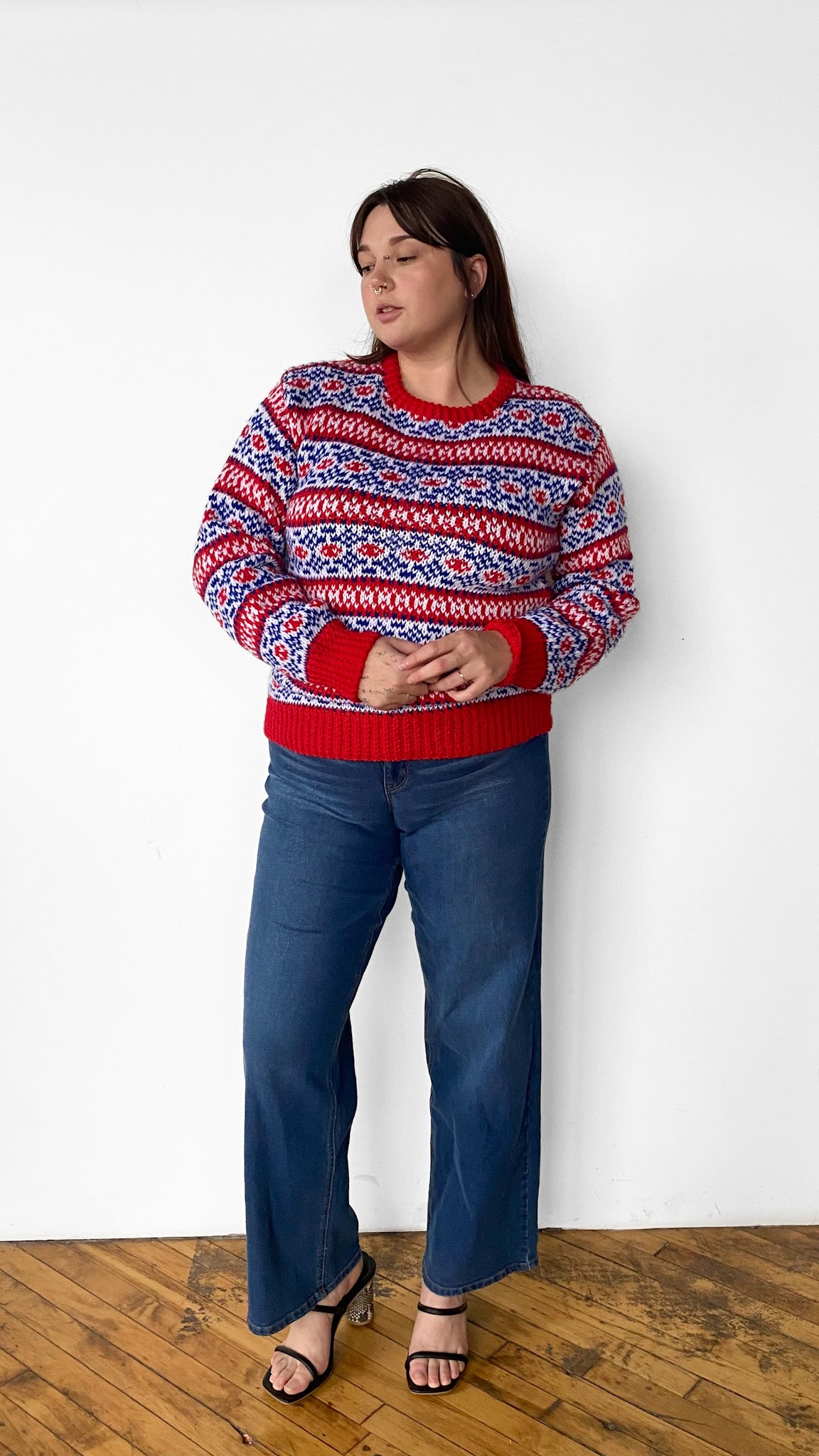Red white and blue knit sweater with long sleeves and thick red stripe at hem.
