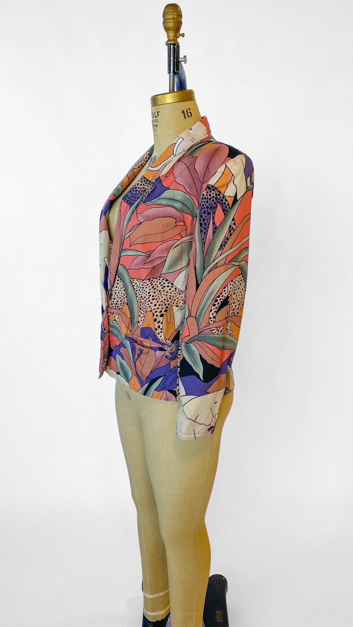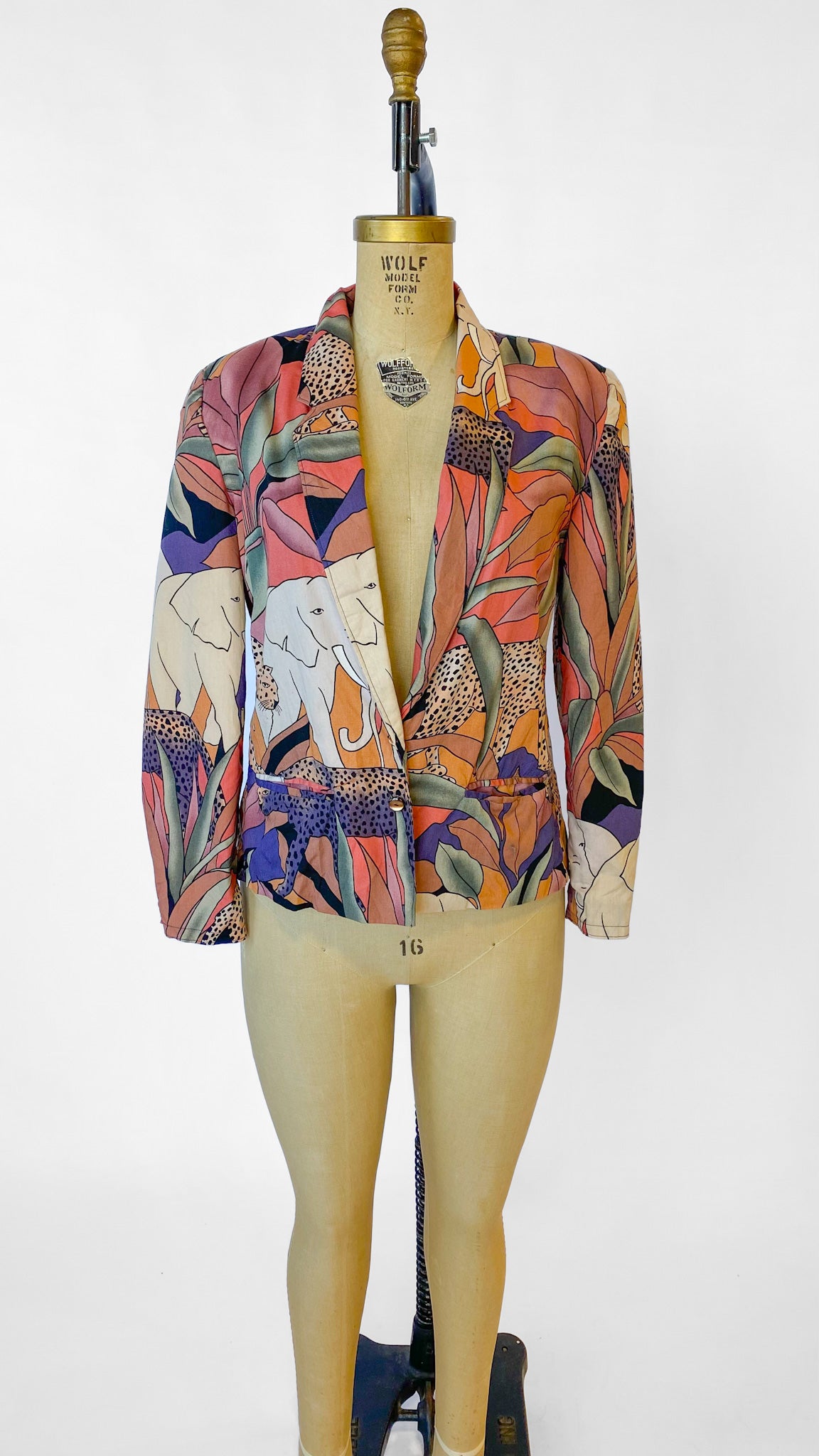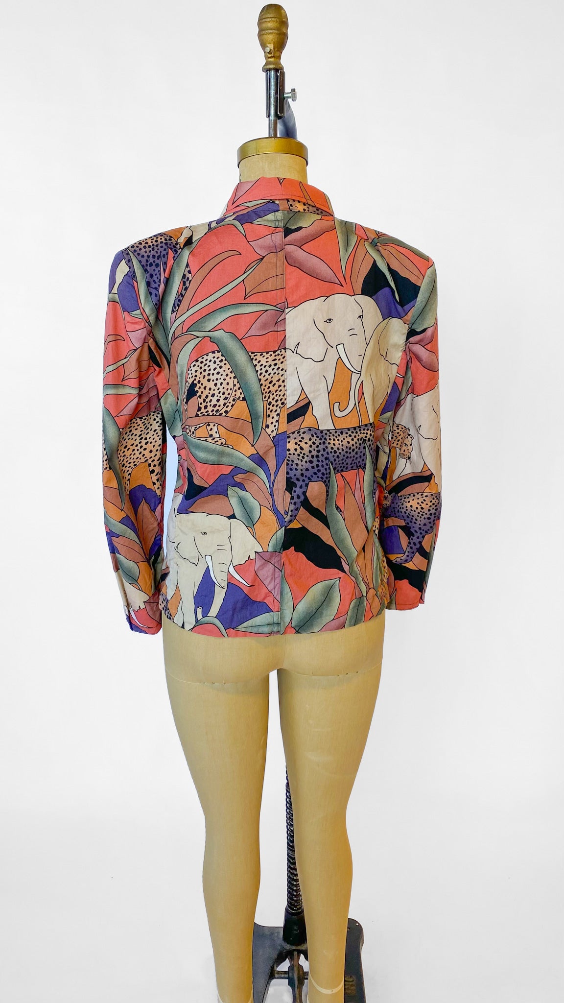 Colorful printed blazer depicting animals found on a Safari. Has shoulder pads sewn in, and is unlined. Has button closure. Tight sleeves, best for size small/medium.