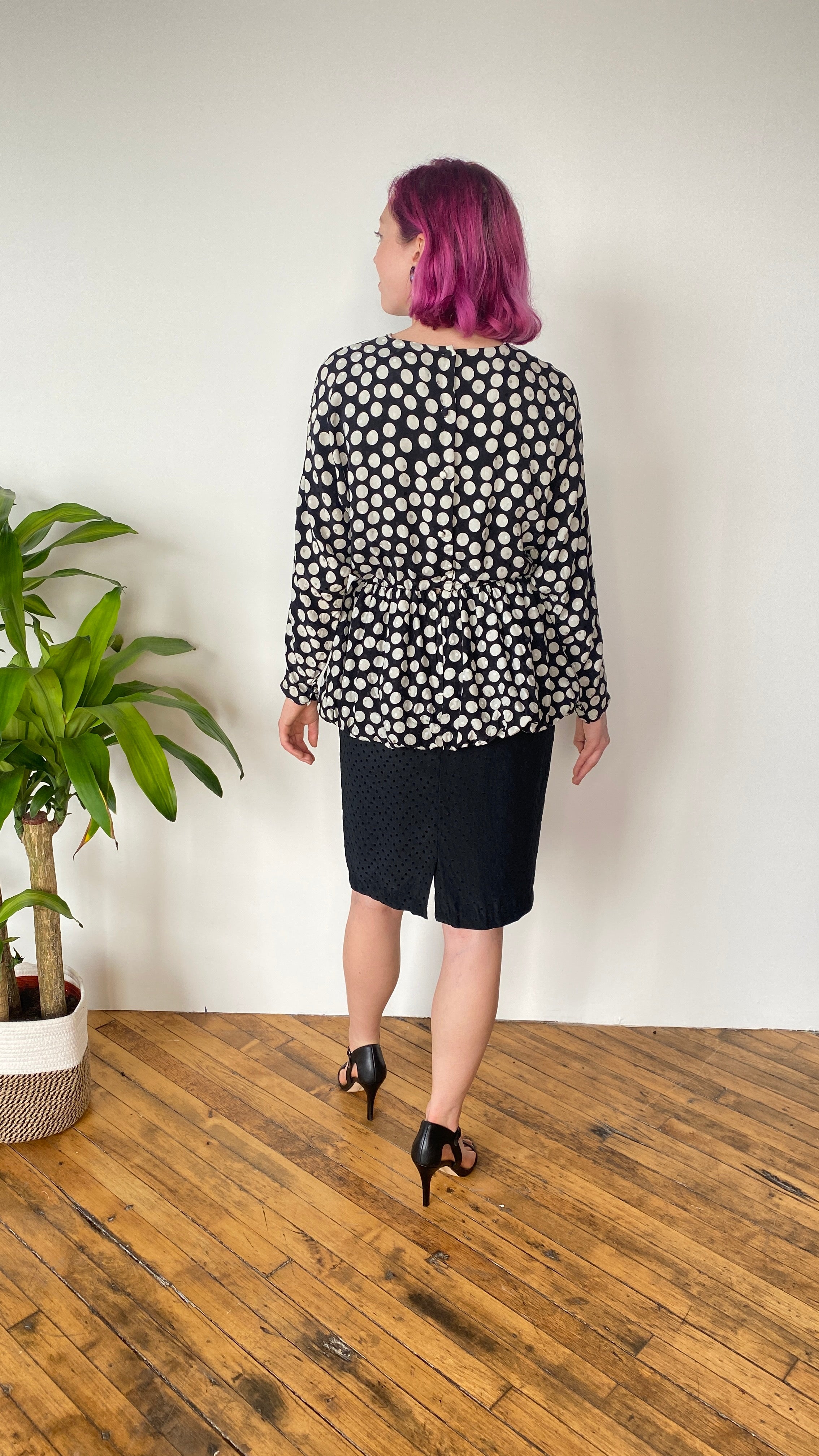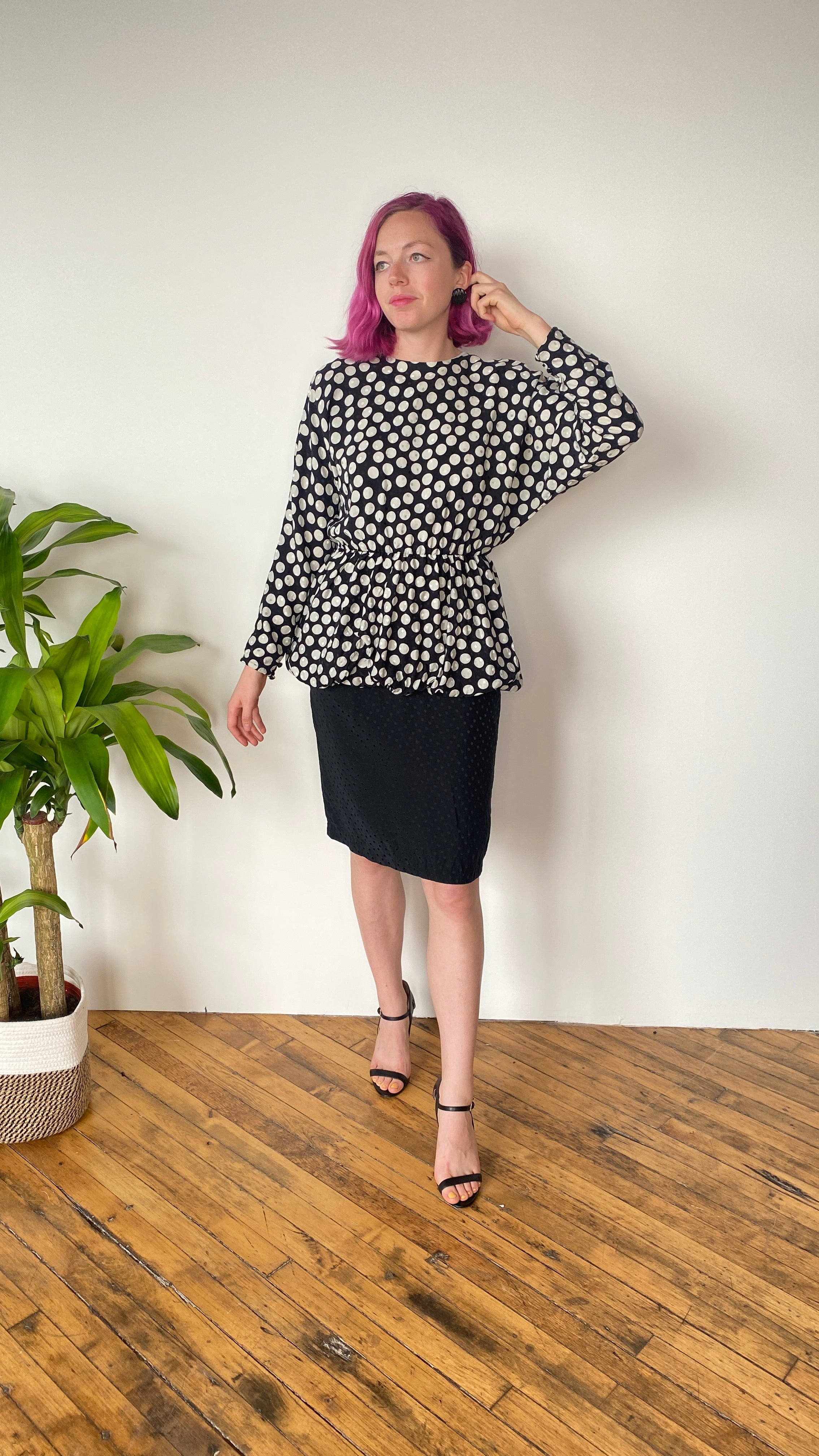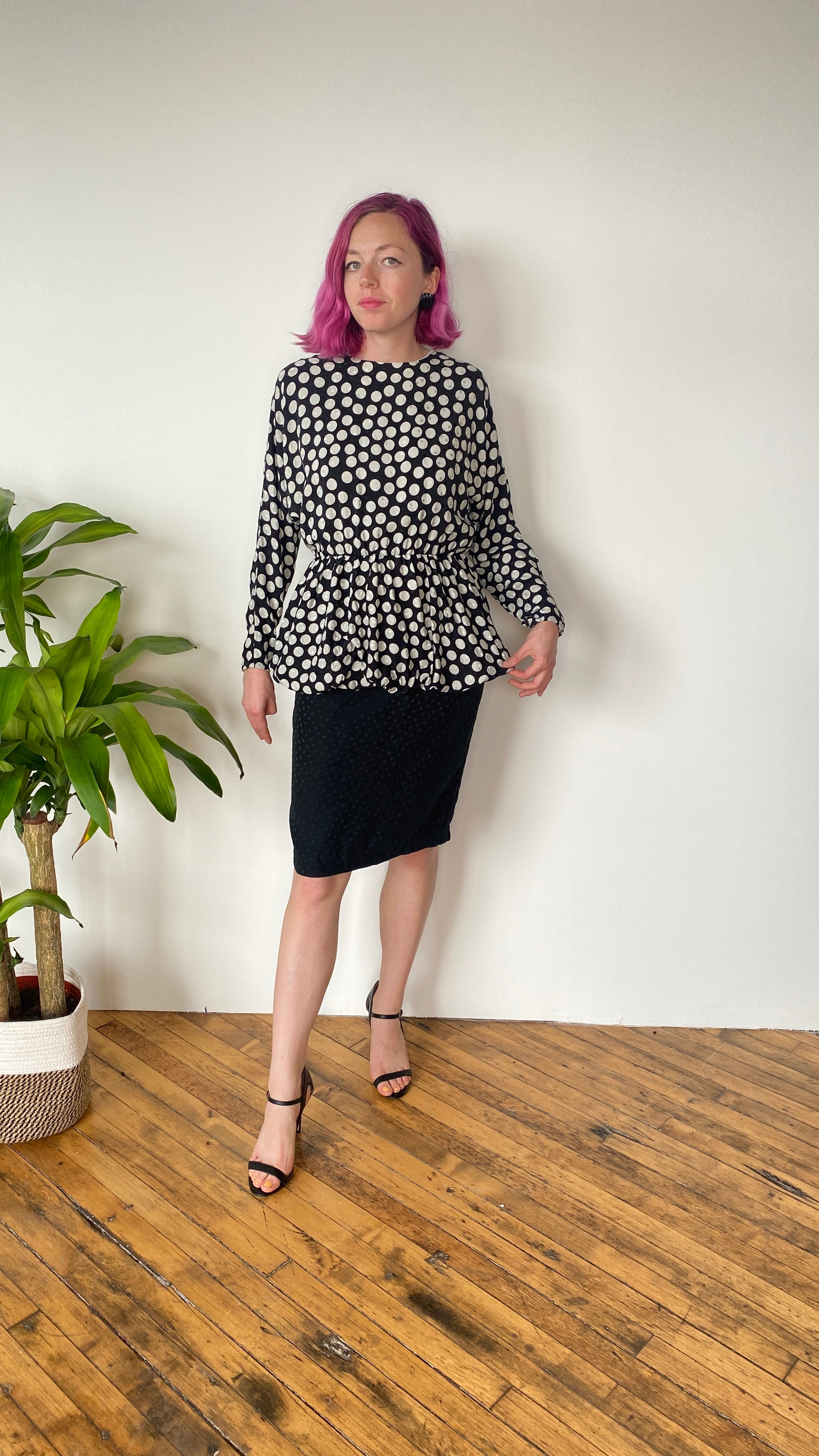 This long-sleeve dress is black with white polkadots on its top and solid black skirt. Silk fabric has a subtle dot pattern throughout (double the polkadot, double the fun!). Button up back and half zipper at the waist.