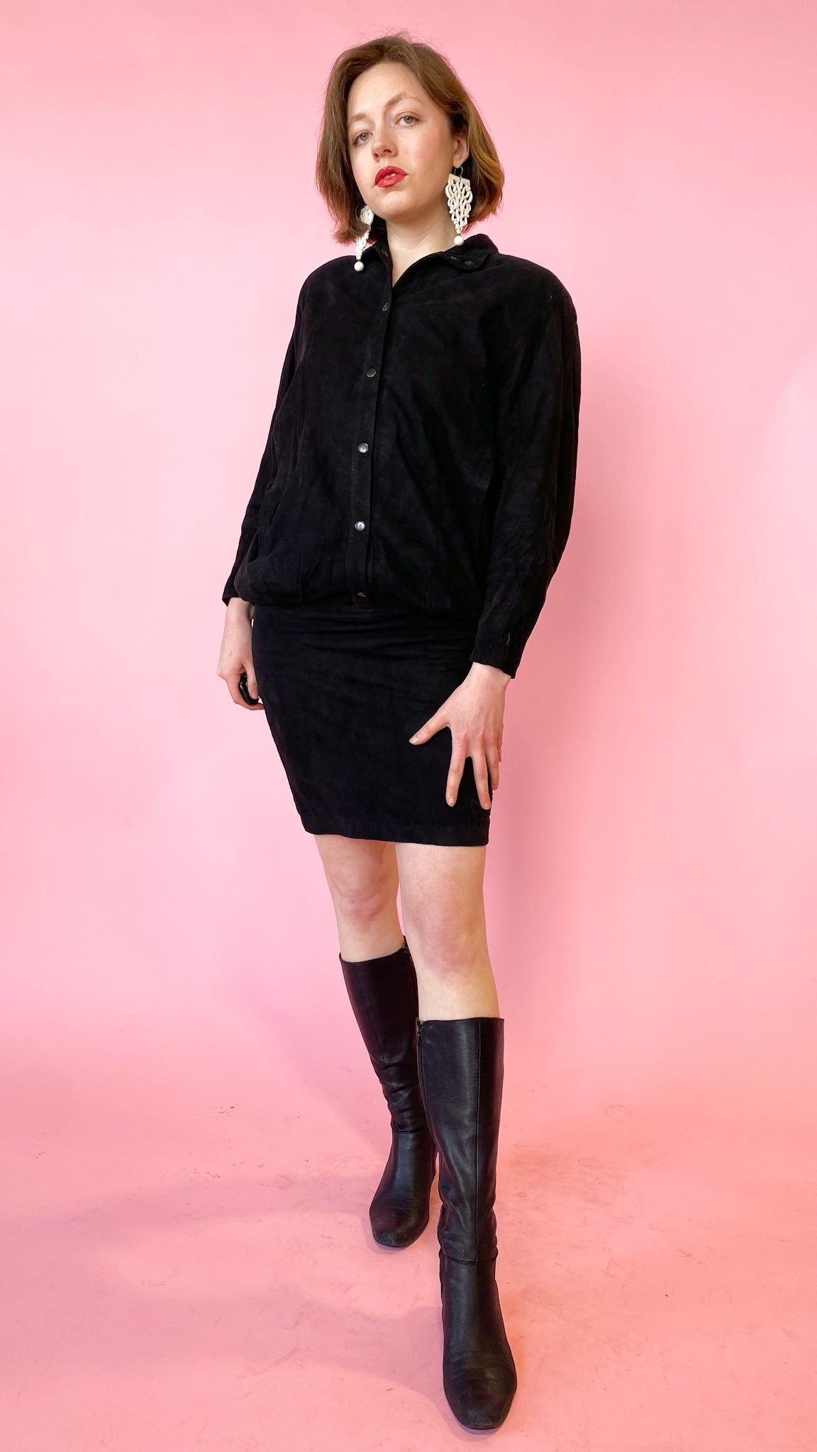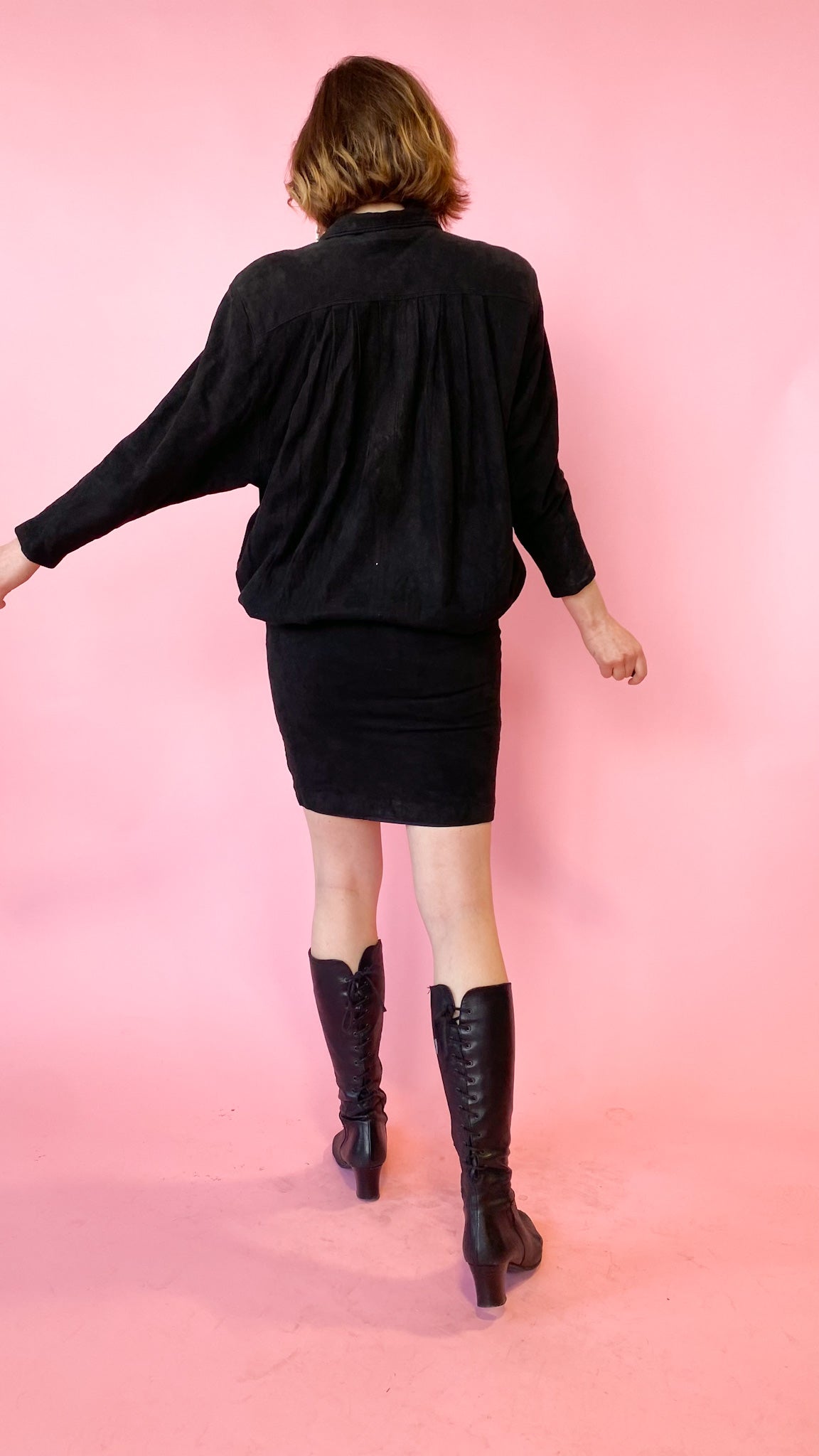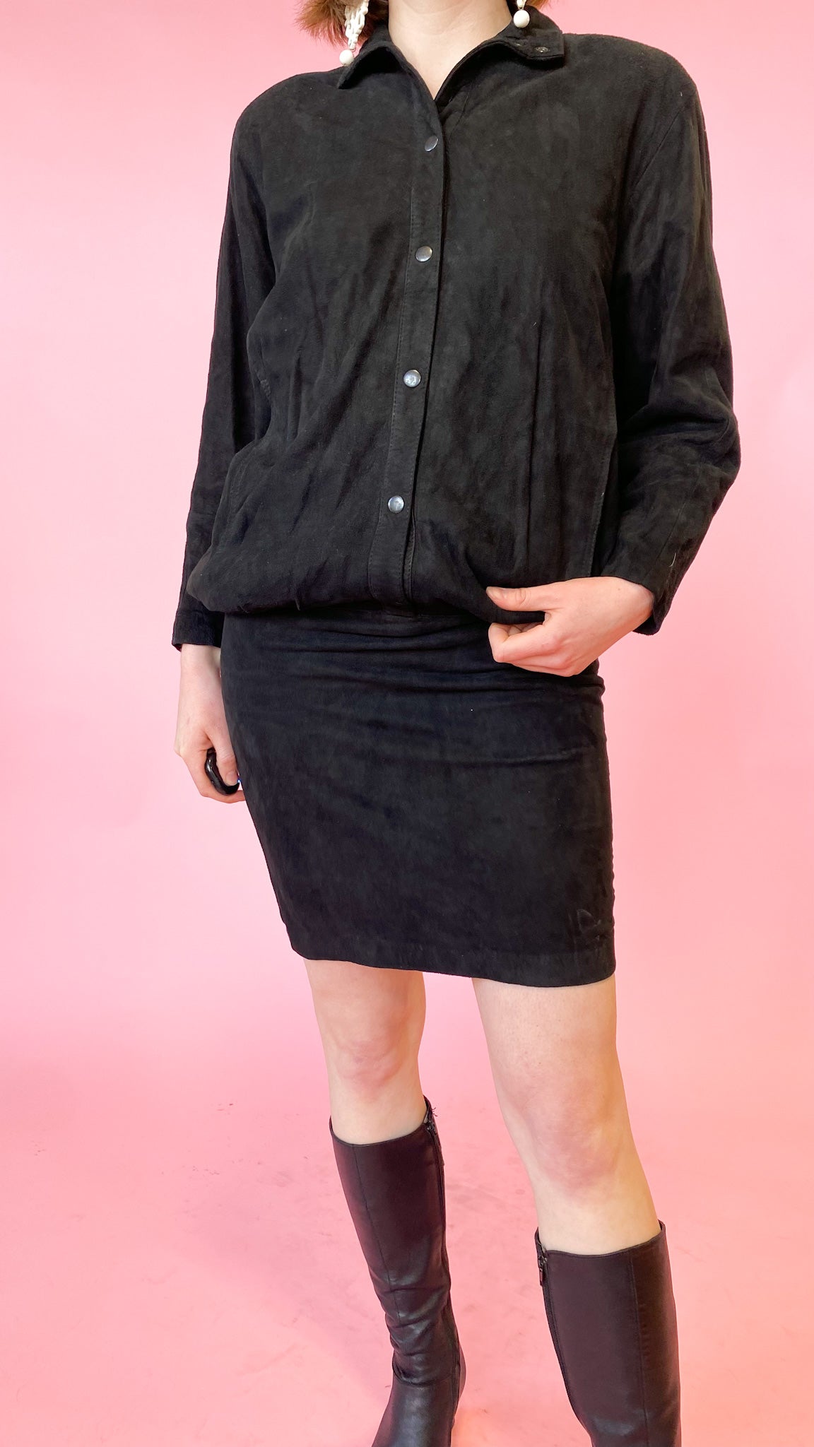 Black suede leather dress with a big bubble top including shoulder pads that connects to a tight pencil skirt bottom. There are snap buttons from the skirt up to the collar.