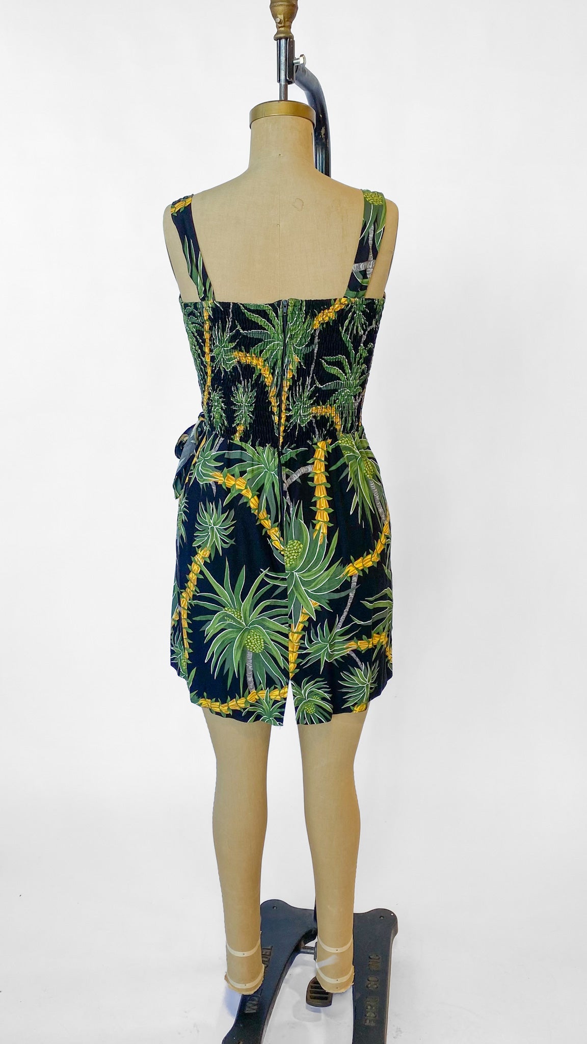 Black sleeveless dress with tropical tree pattern, adjustable straps, wrap/tie skirt, smocked back, zipper closure.