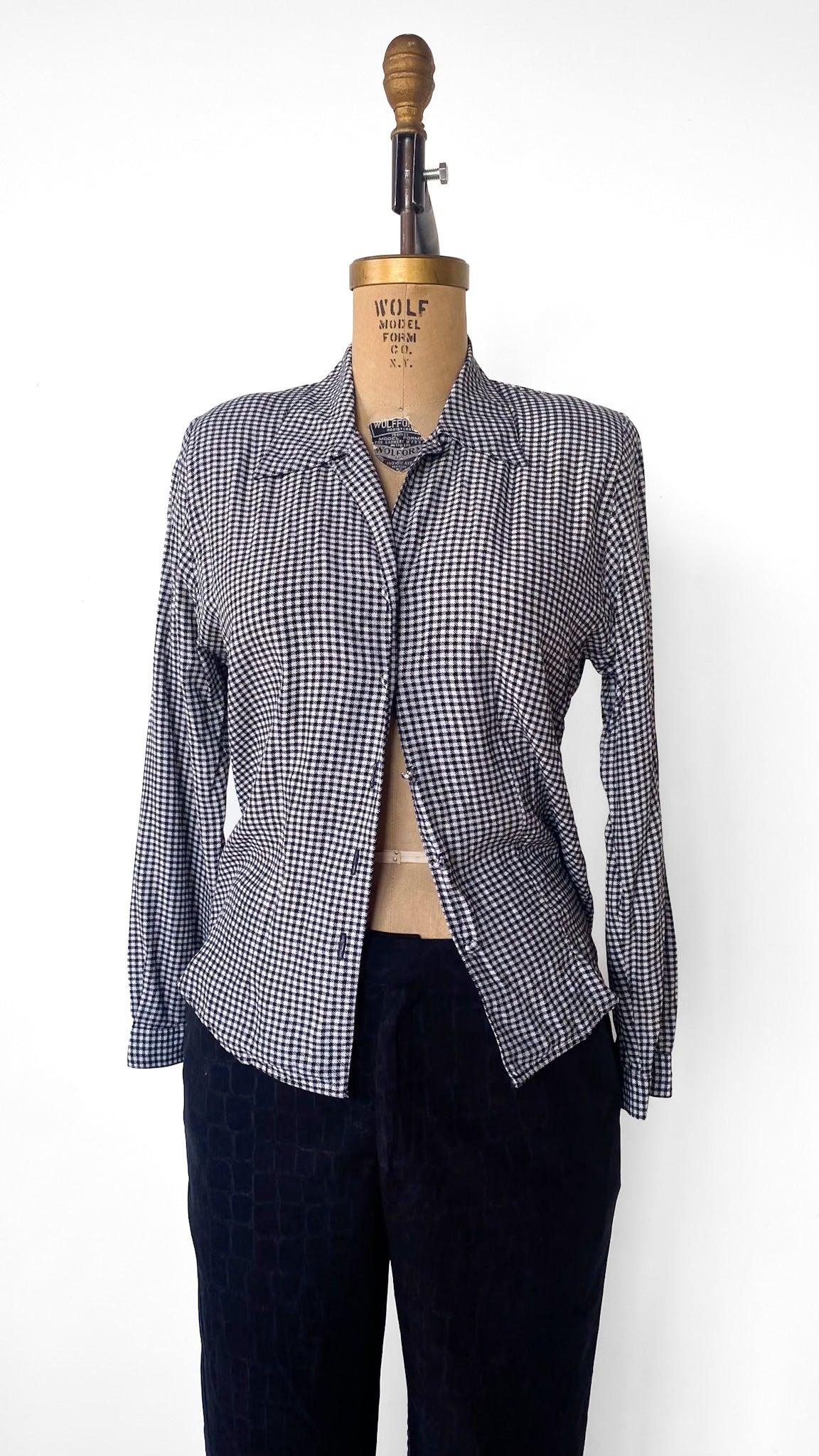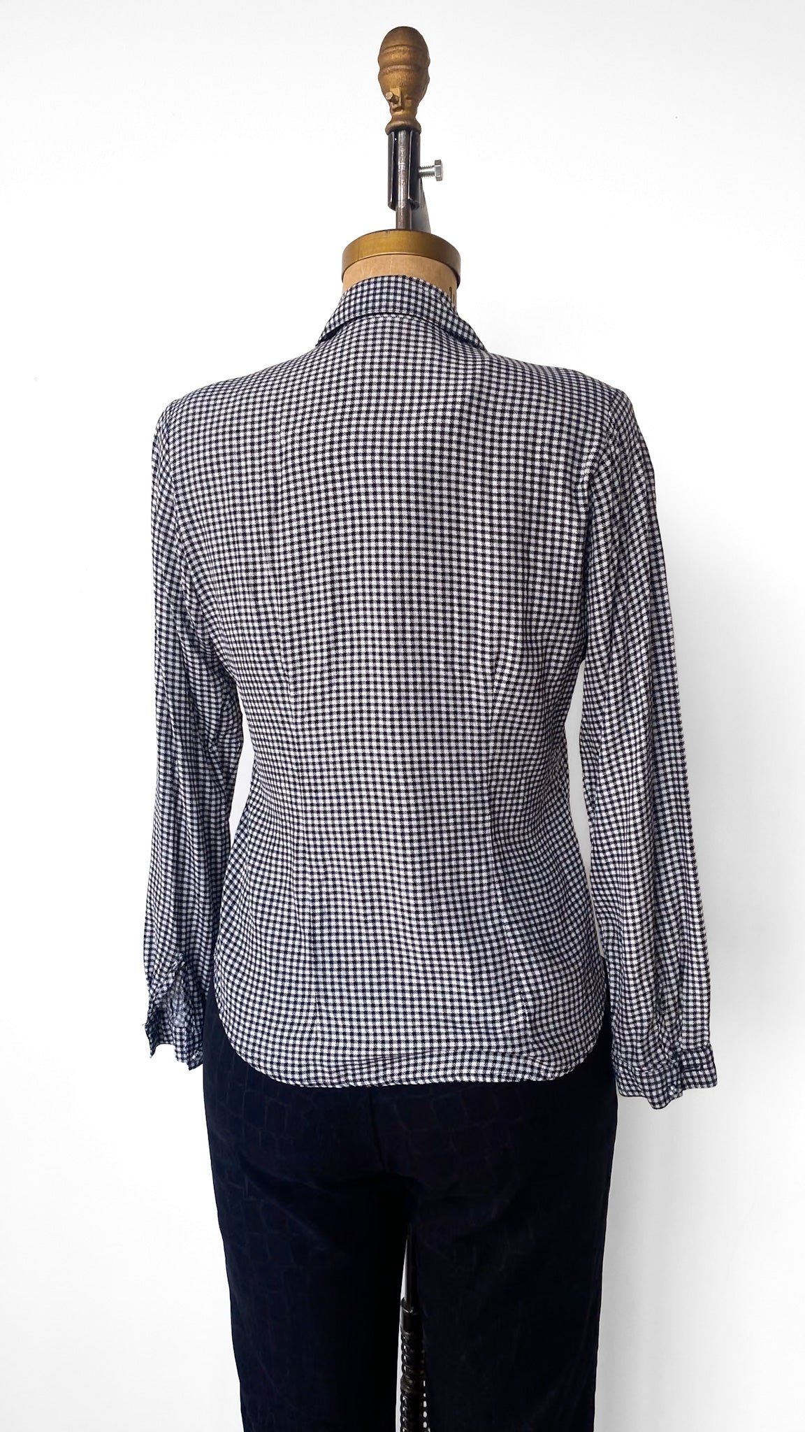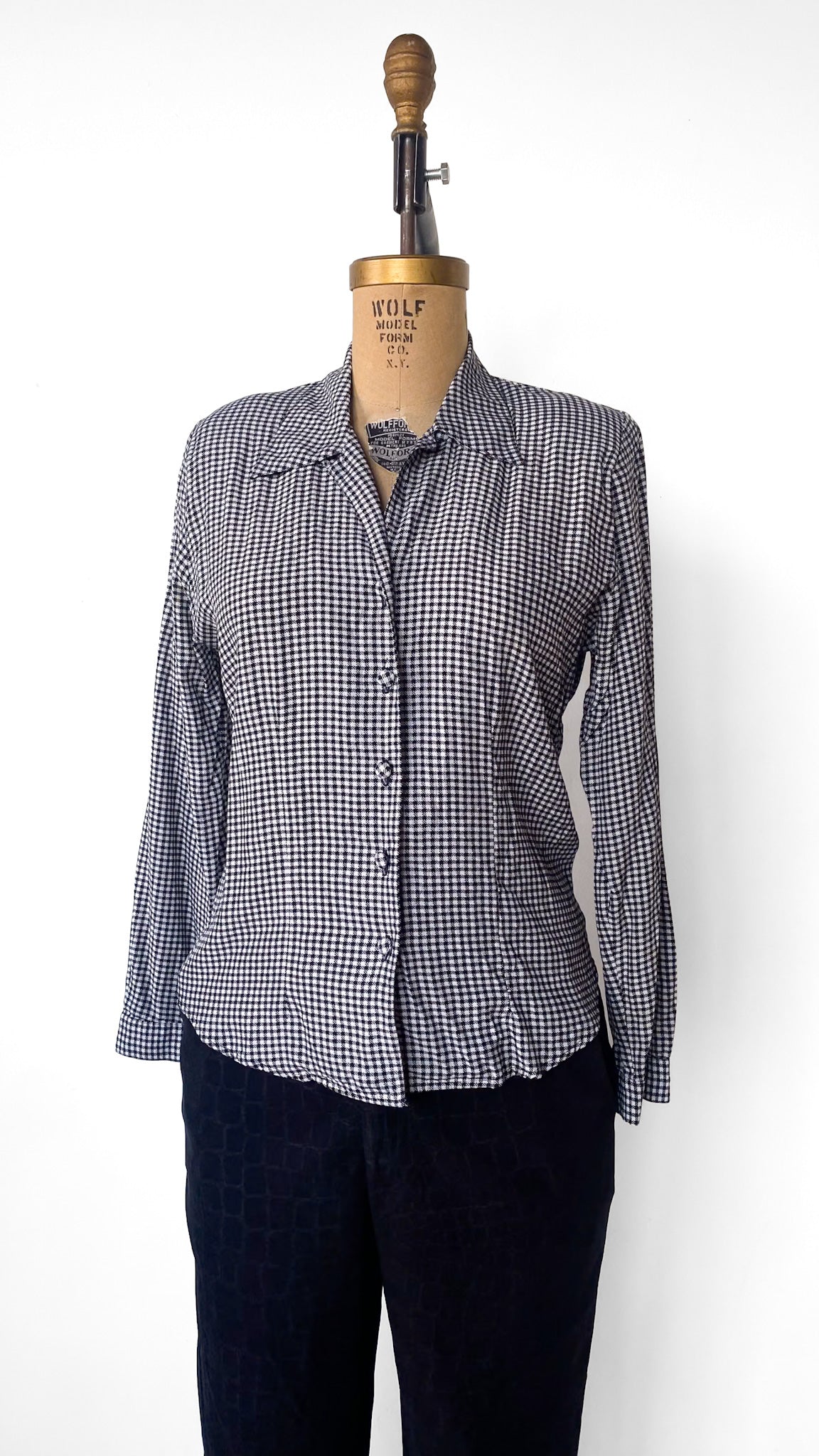 Black and white houndstooth button up fitted blouse with fabric buttons and large shoulder pads.