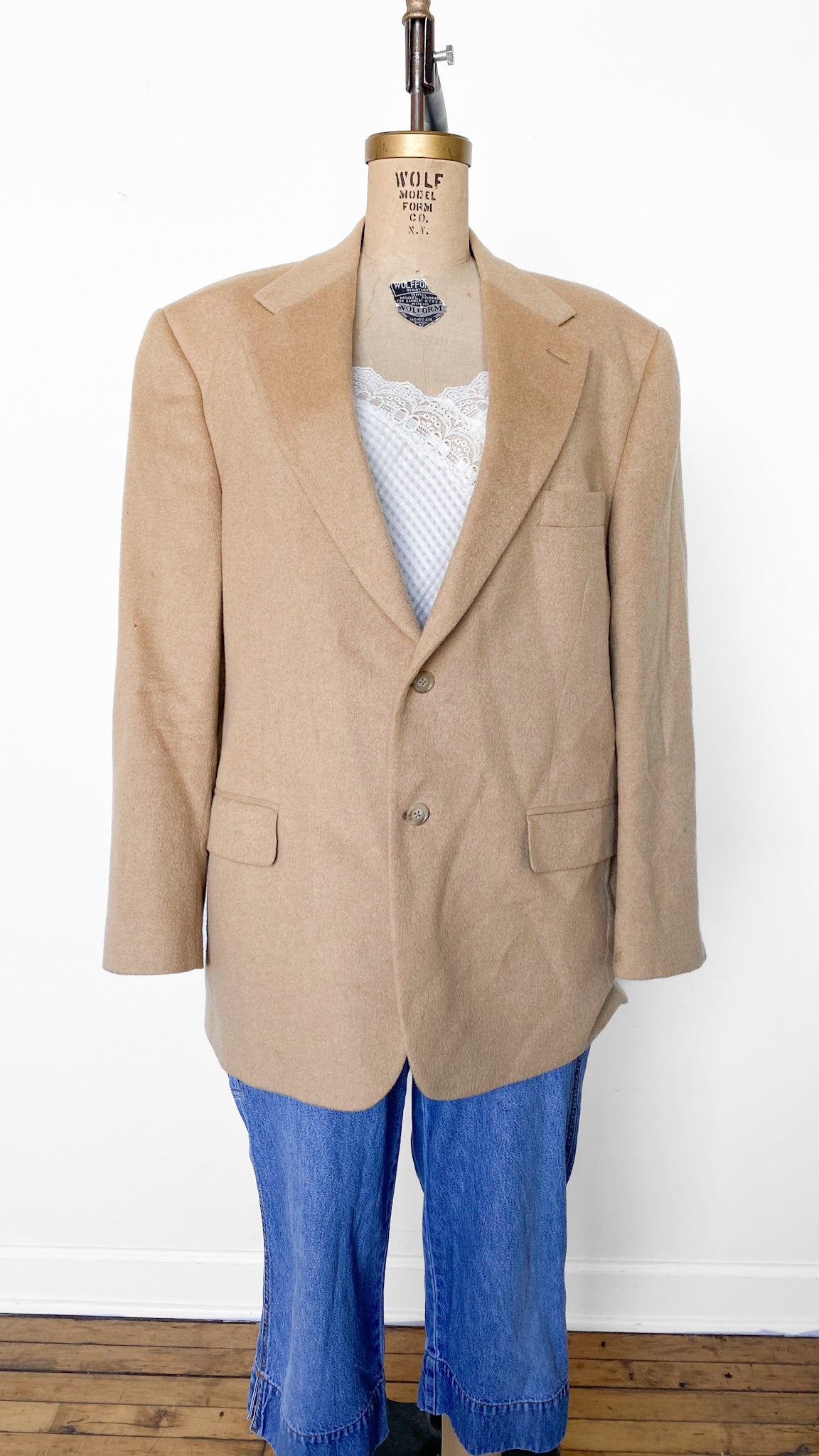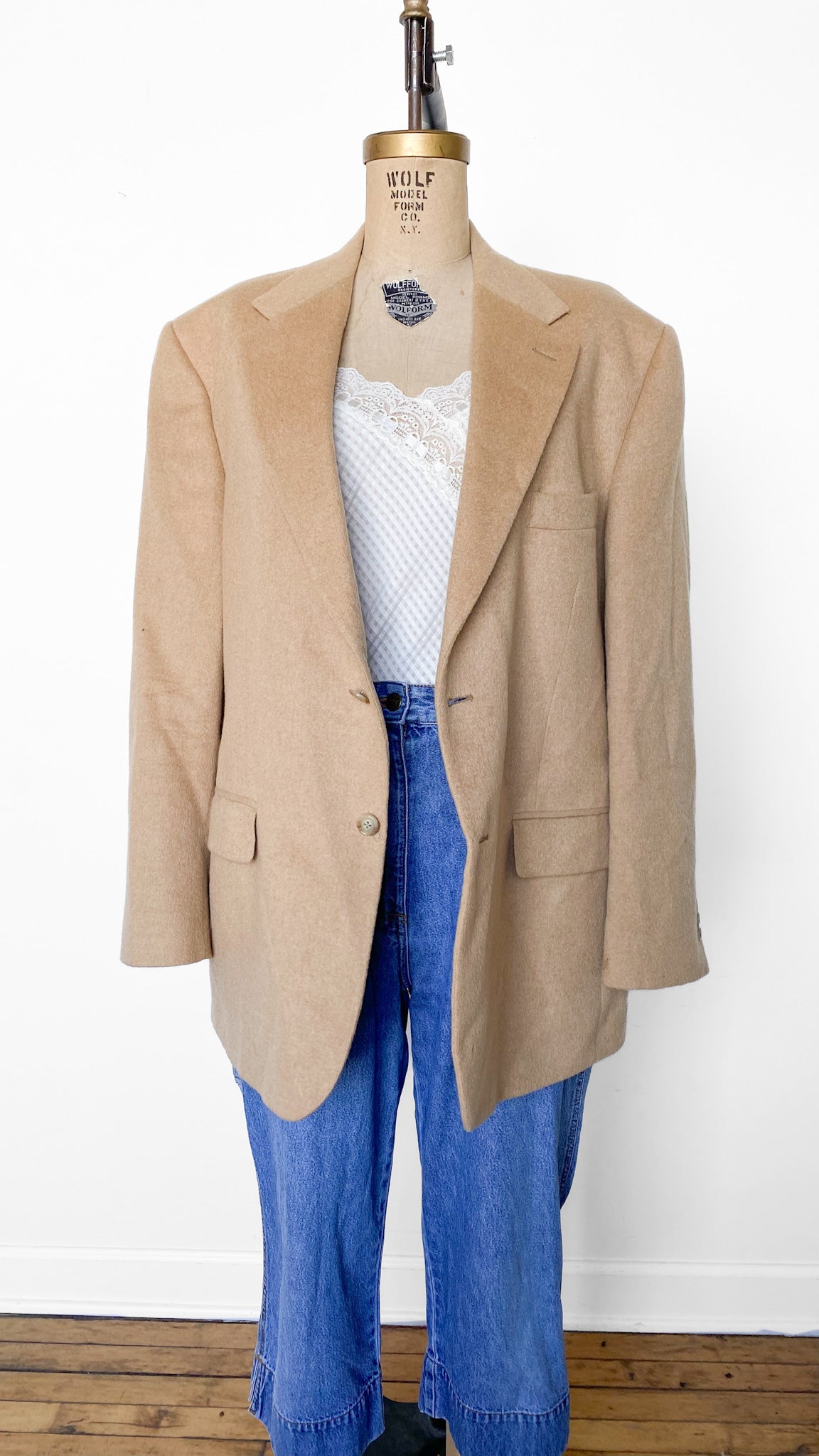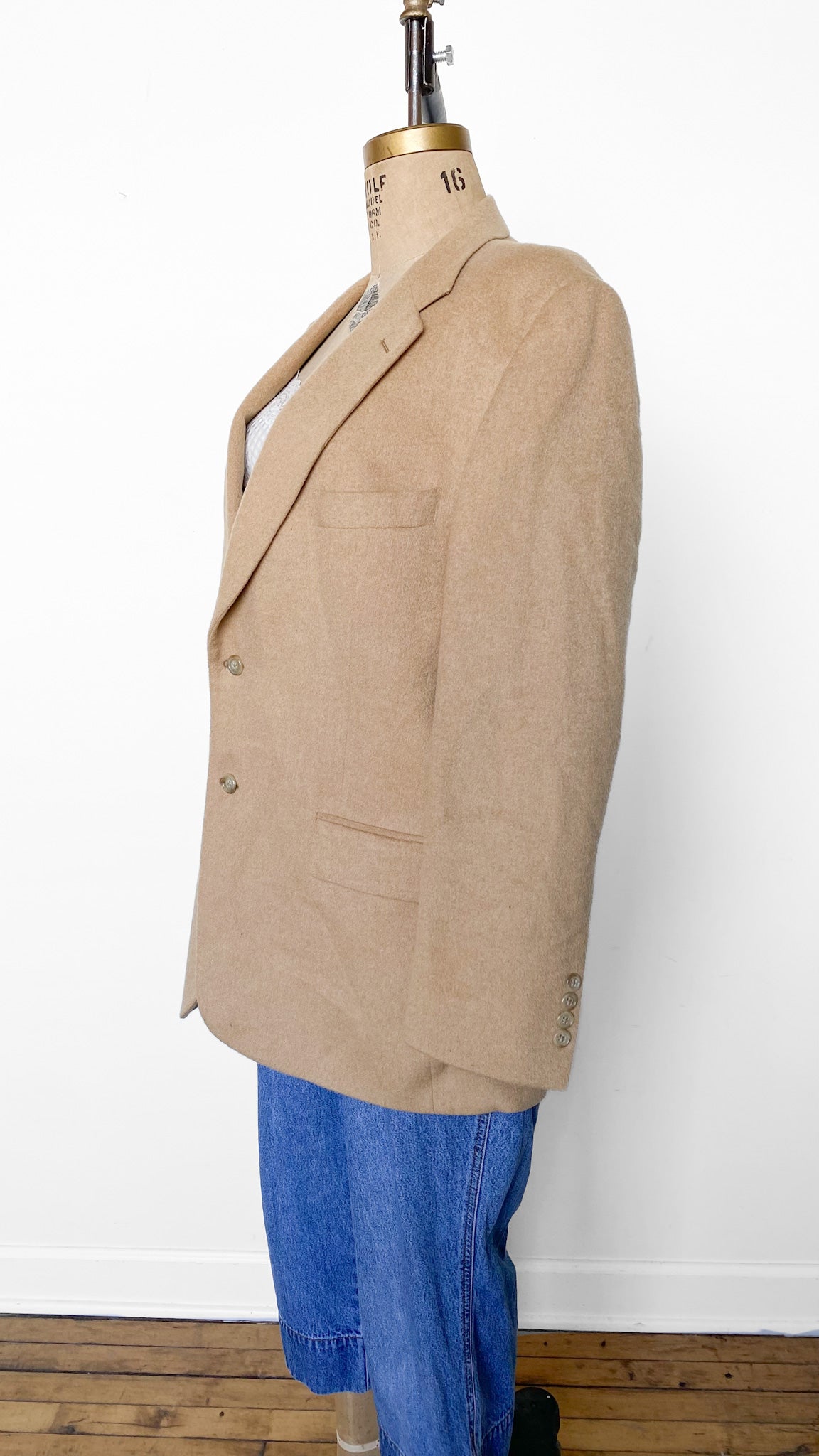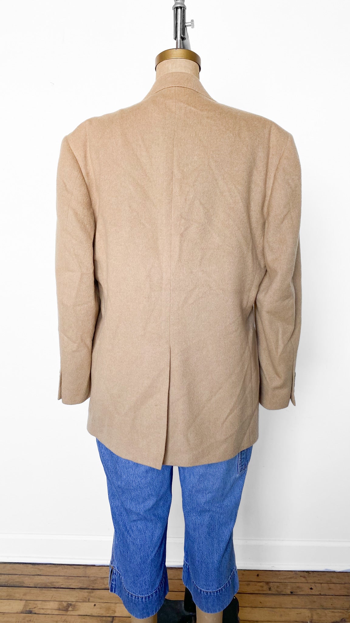 Classic tan camel hair single breasted blazer with three exterior pockets and three interior pockets.