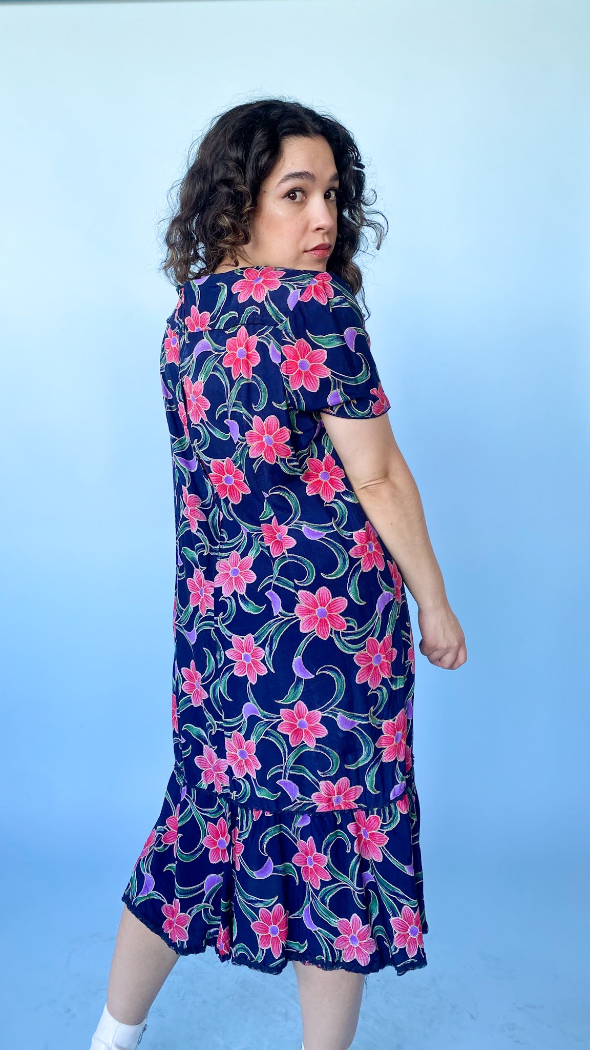 1980s Navy and Pink Floral Cut Out Dress, sz. L