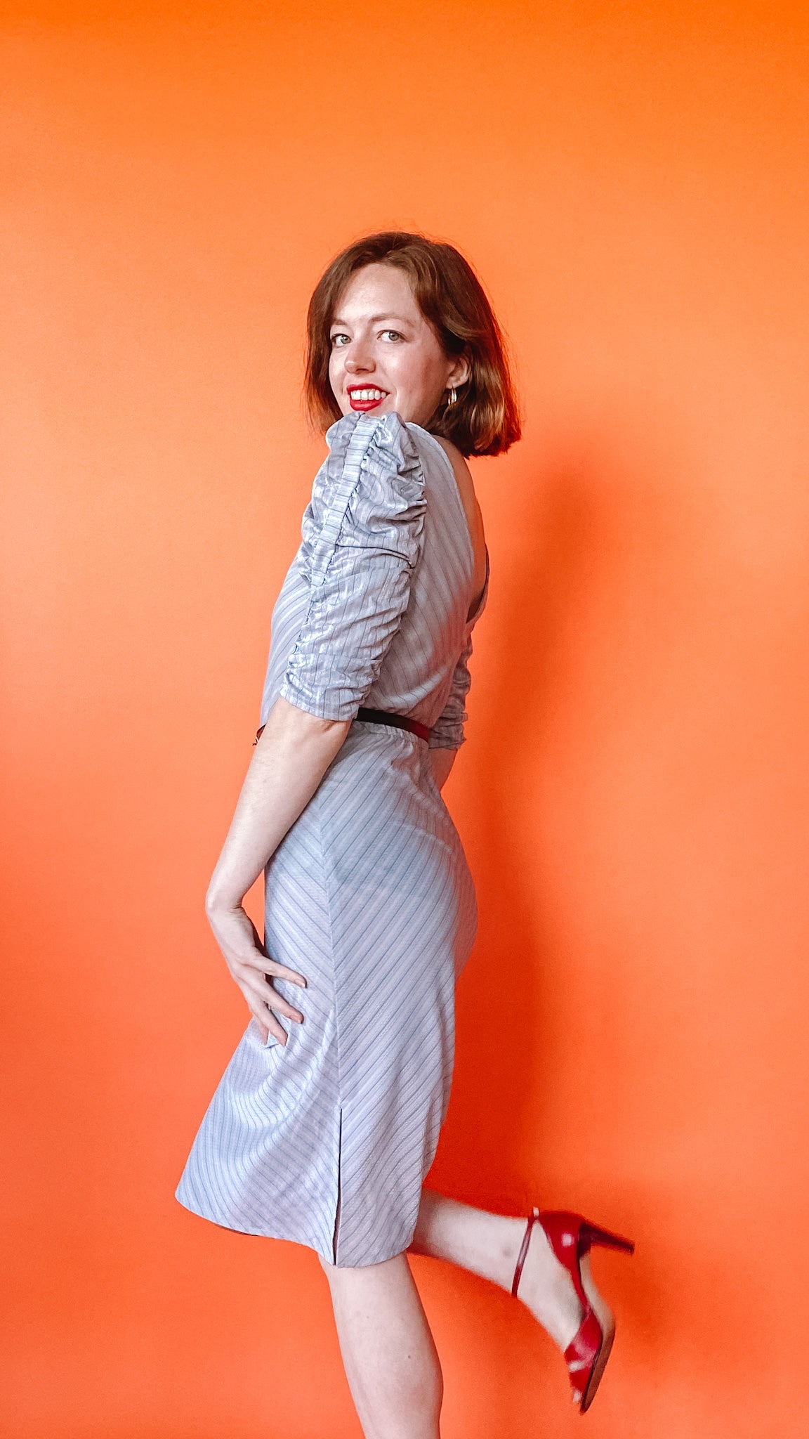 1970s Black & Striped Puff Sleeve Dress, sz. L/XL