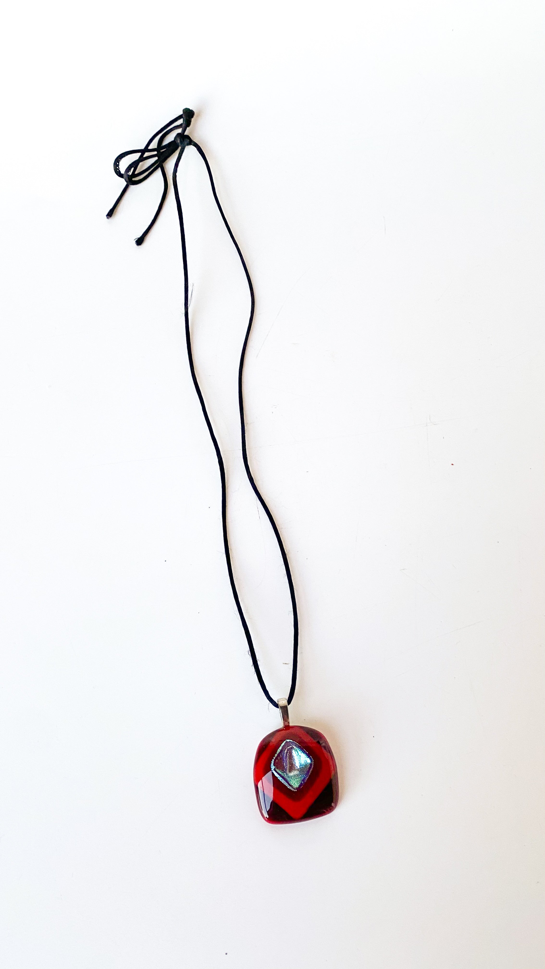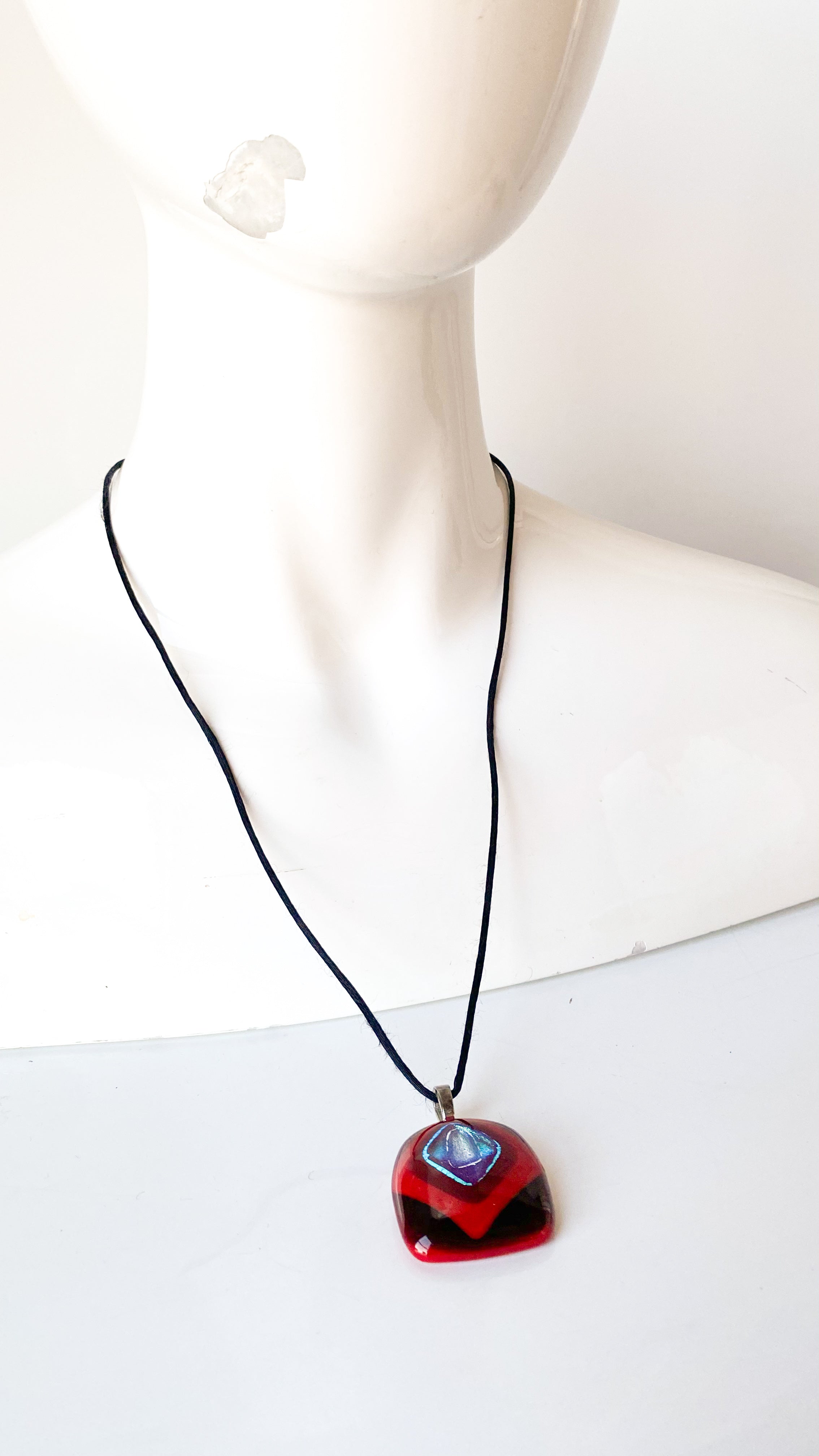 Glass pendant with red geometric pattern and blue iridescent center. Strung on a black satin cord.