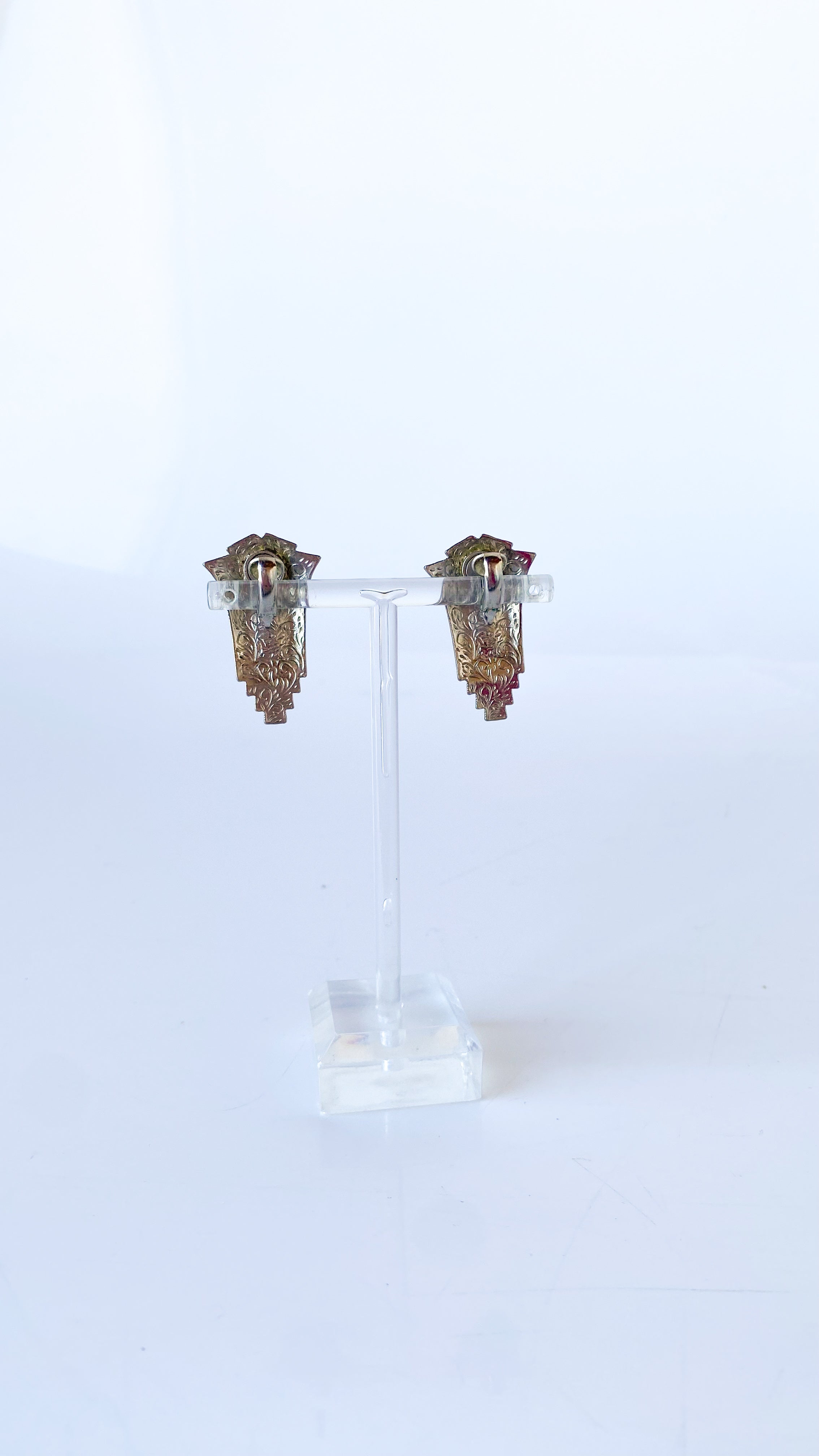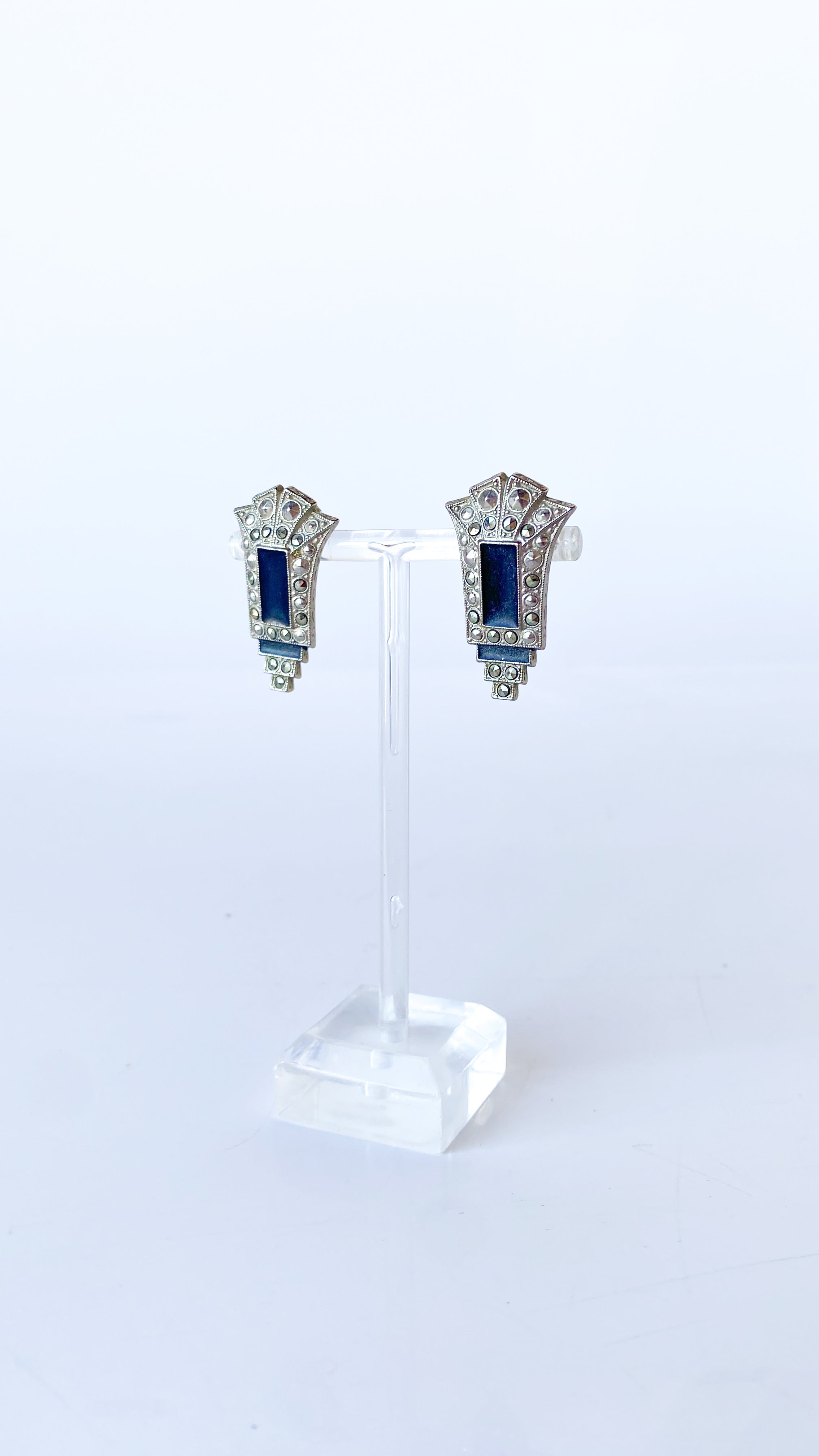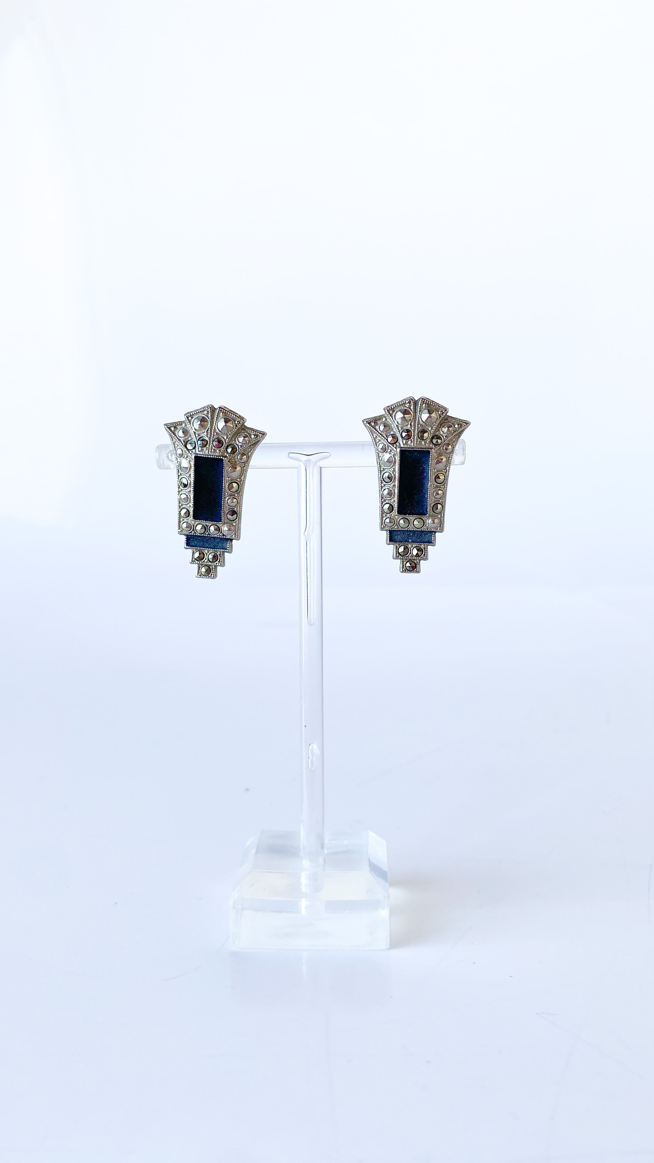 Description: Art-deco style silver & black earrings with rhinestone detailing. Has clip-on backing.