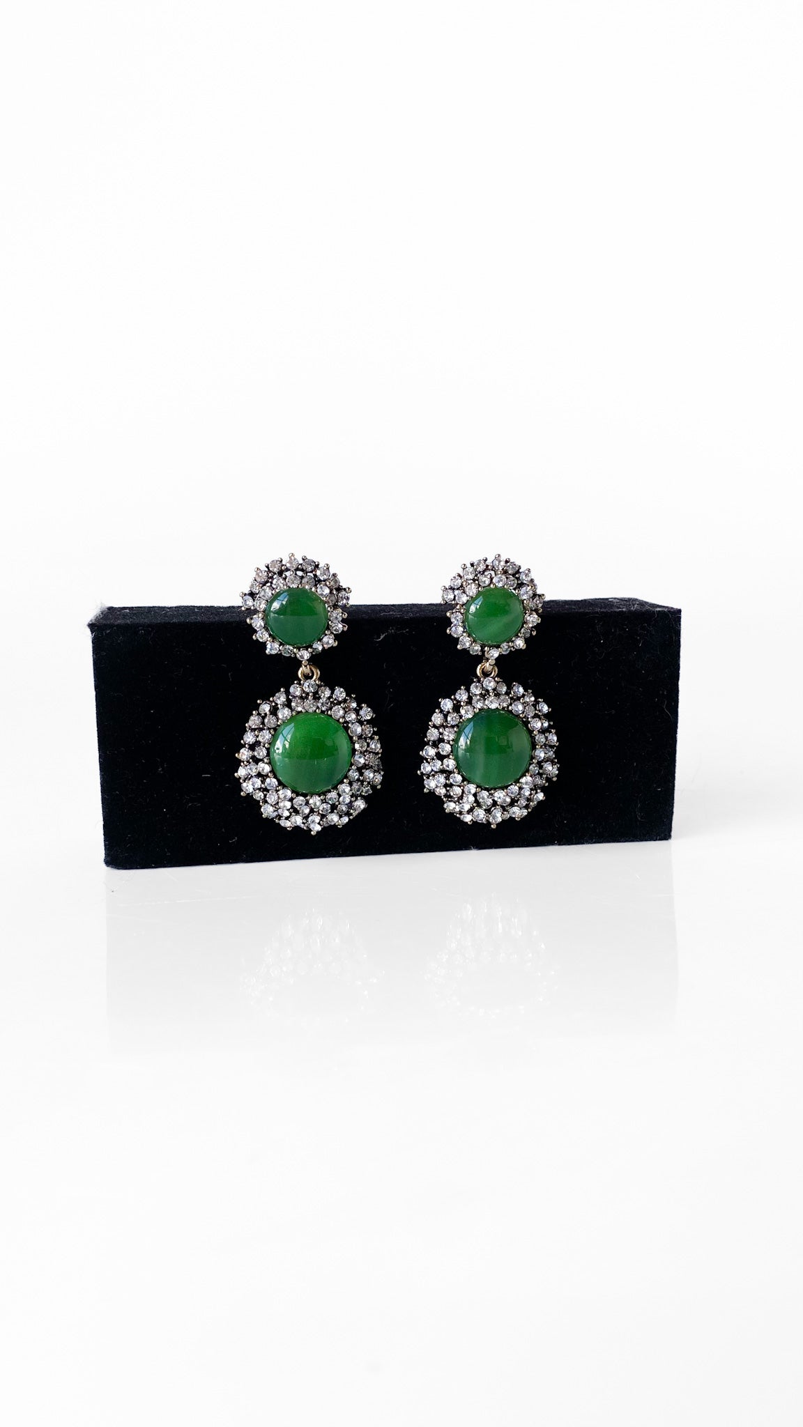 Description: Large round dangly earrings with faux jade stones in the center surrounded by tiny rhinestones. Has post backing.