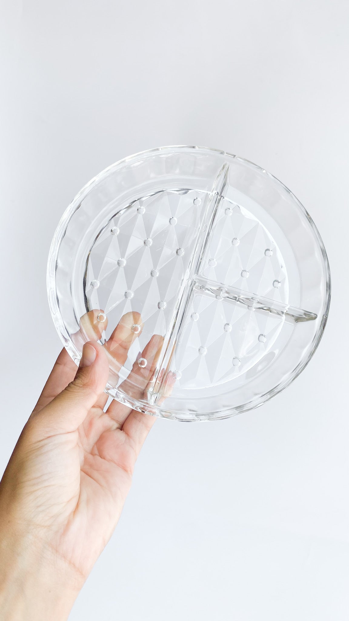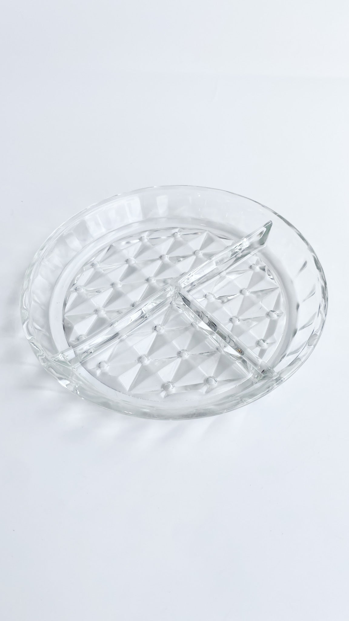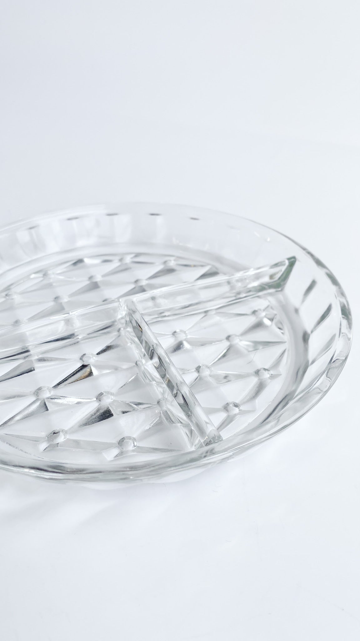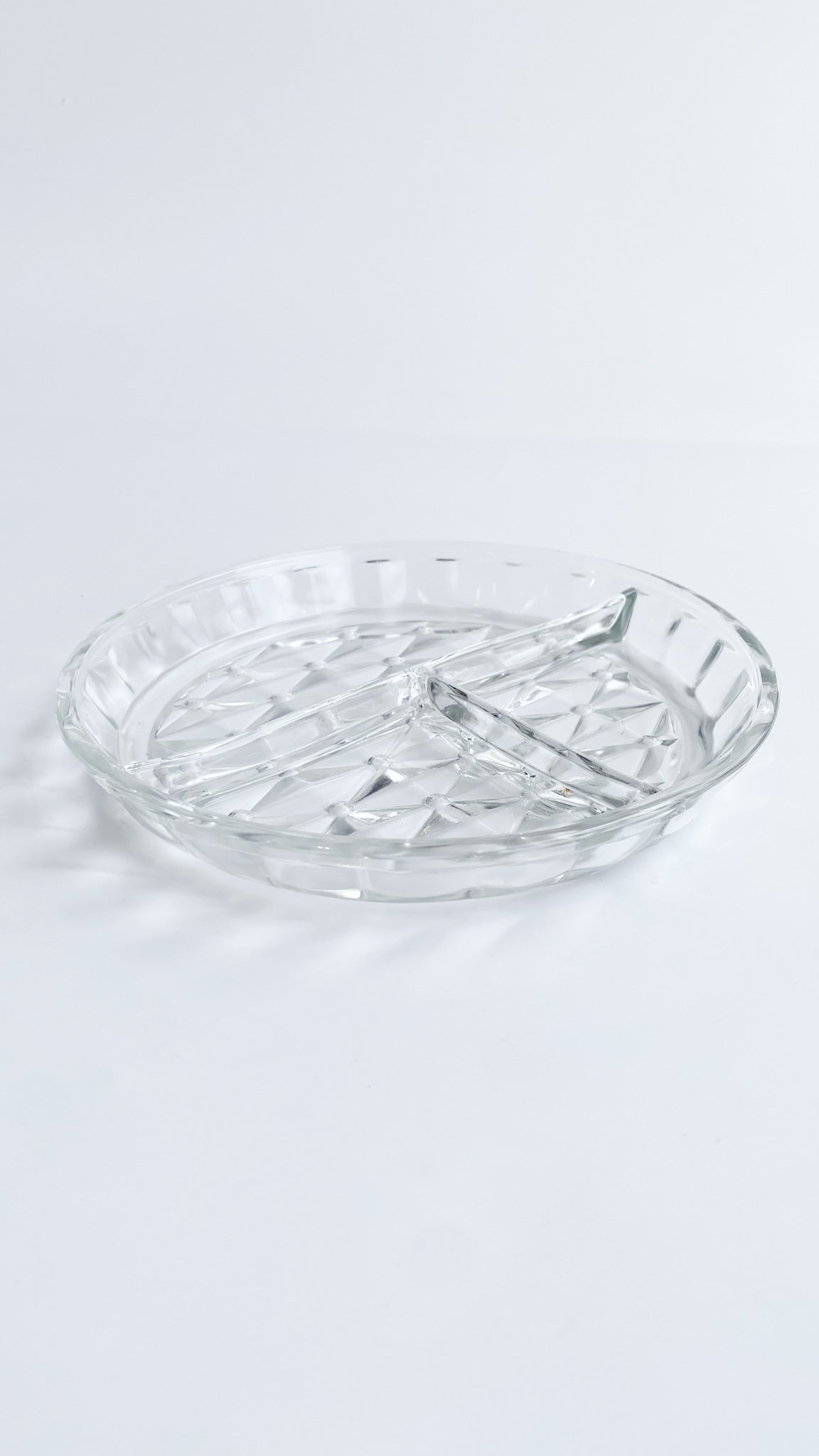 Glass catchall with three sections. Good vintage condition-some small scratches.