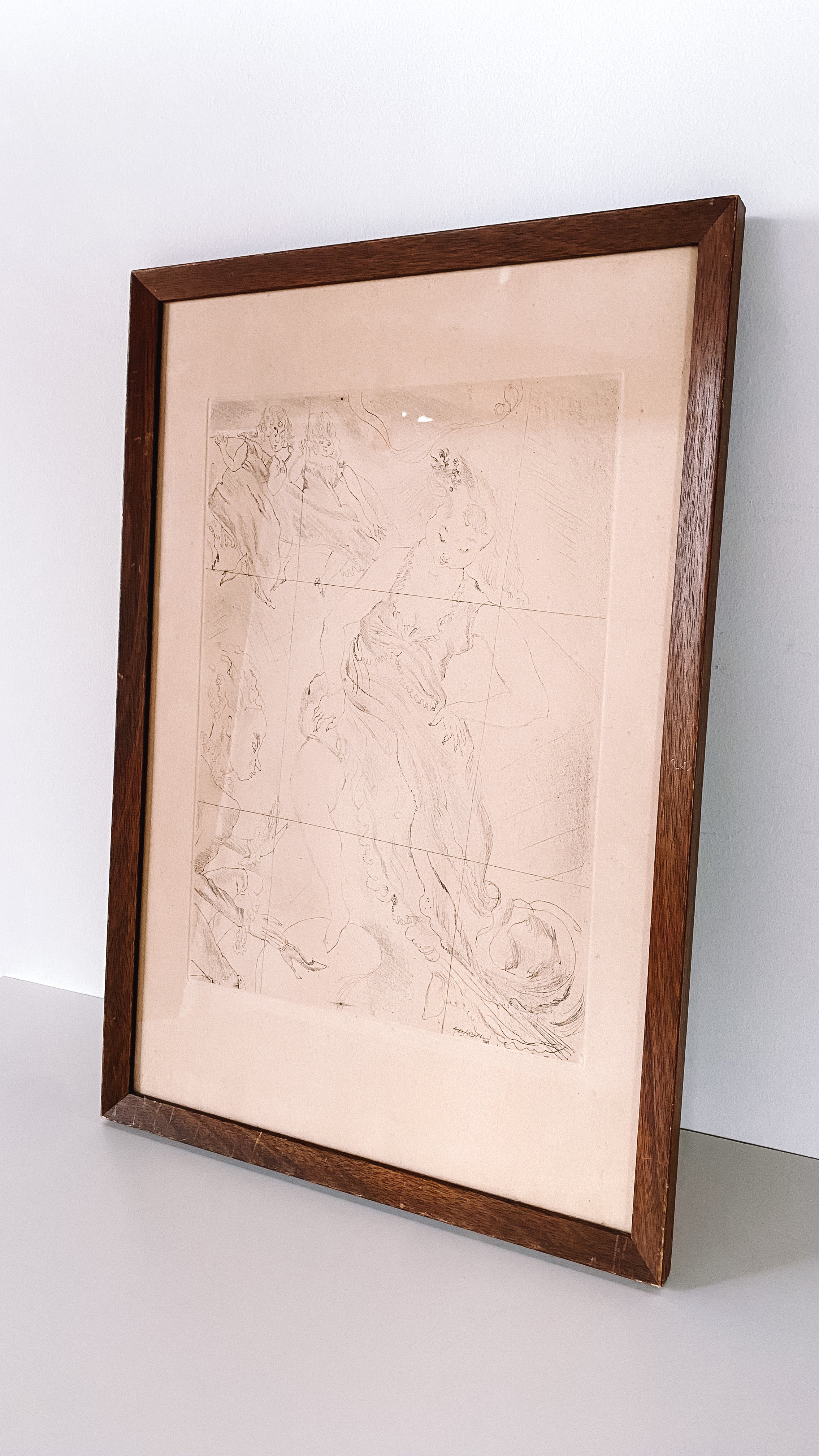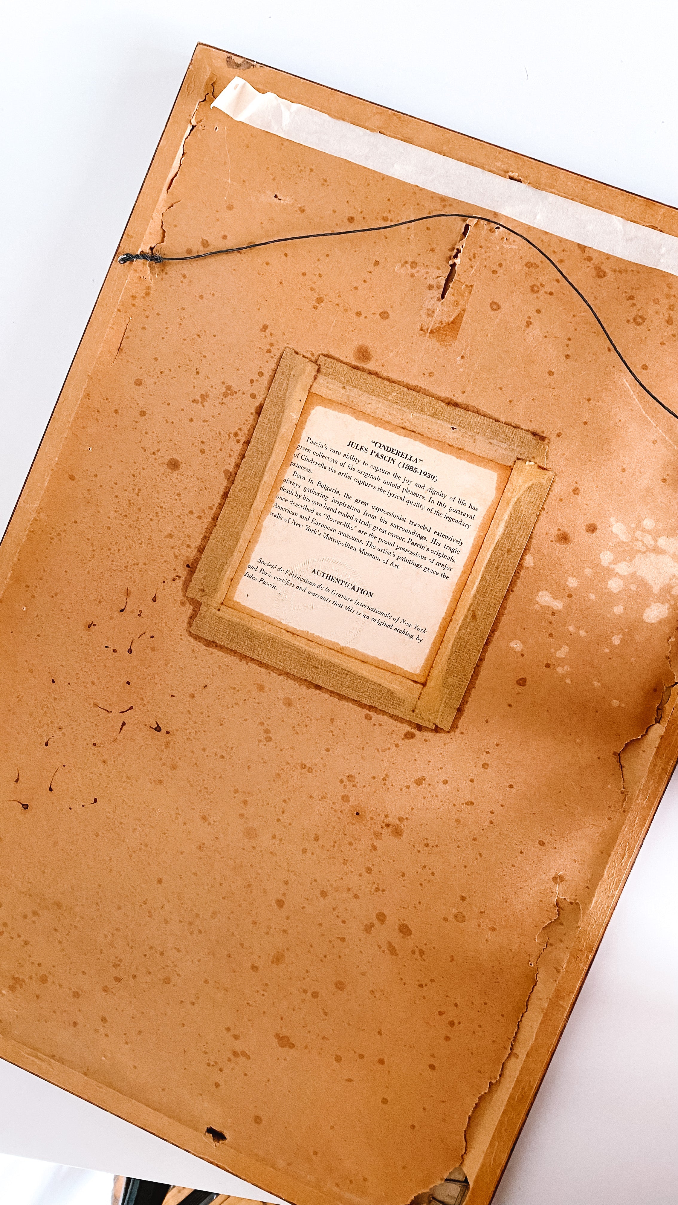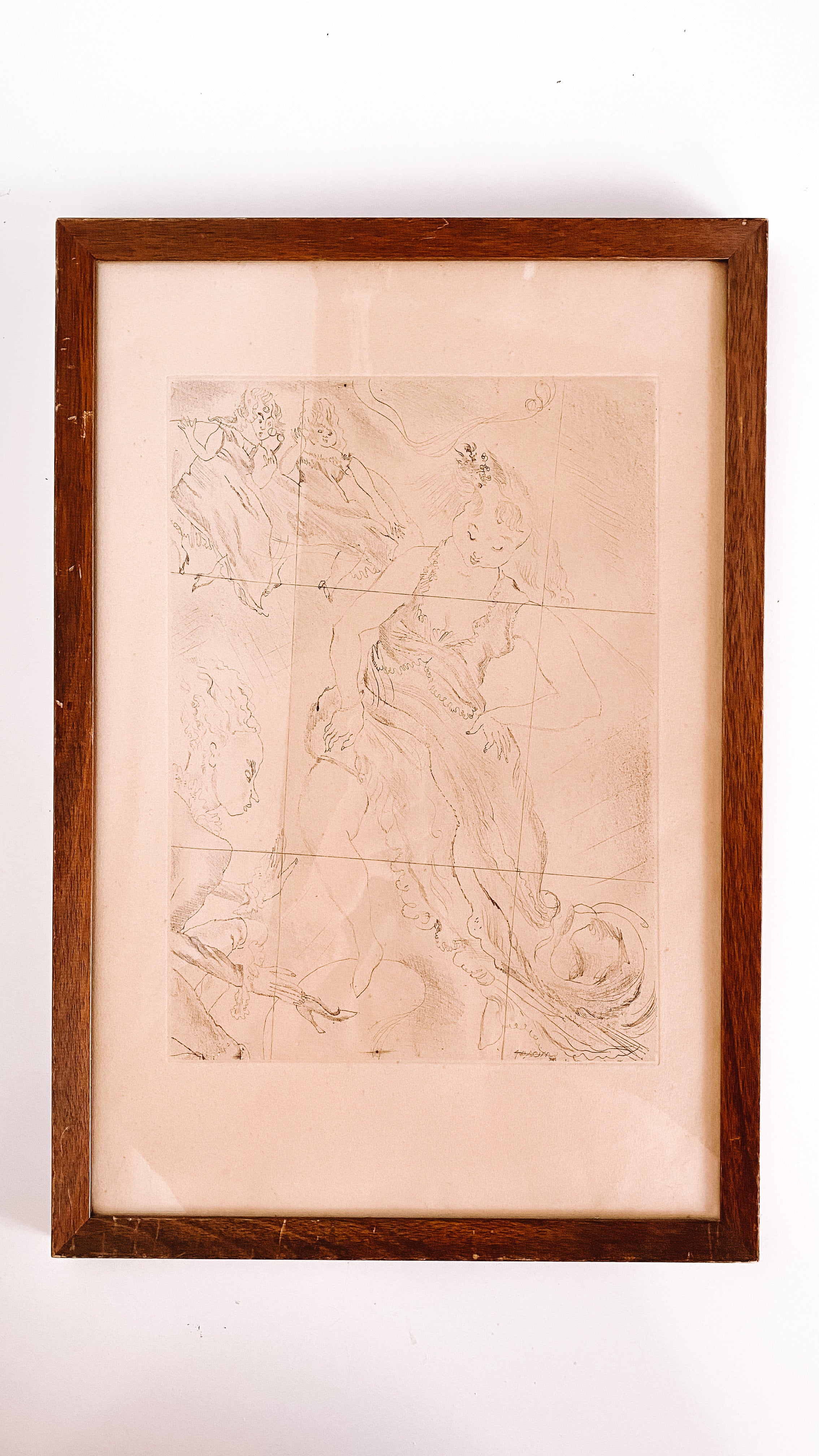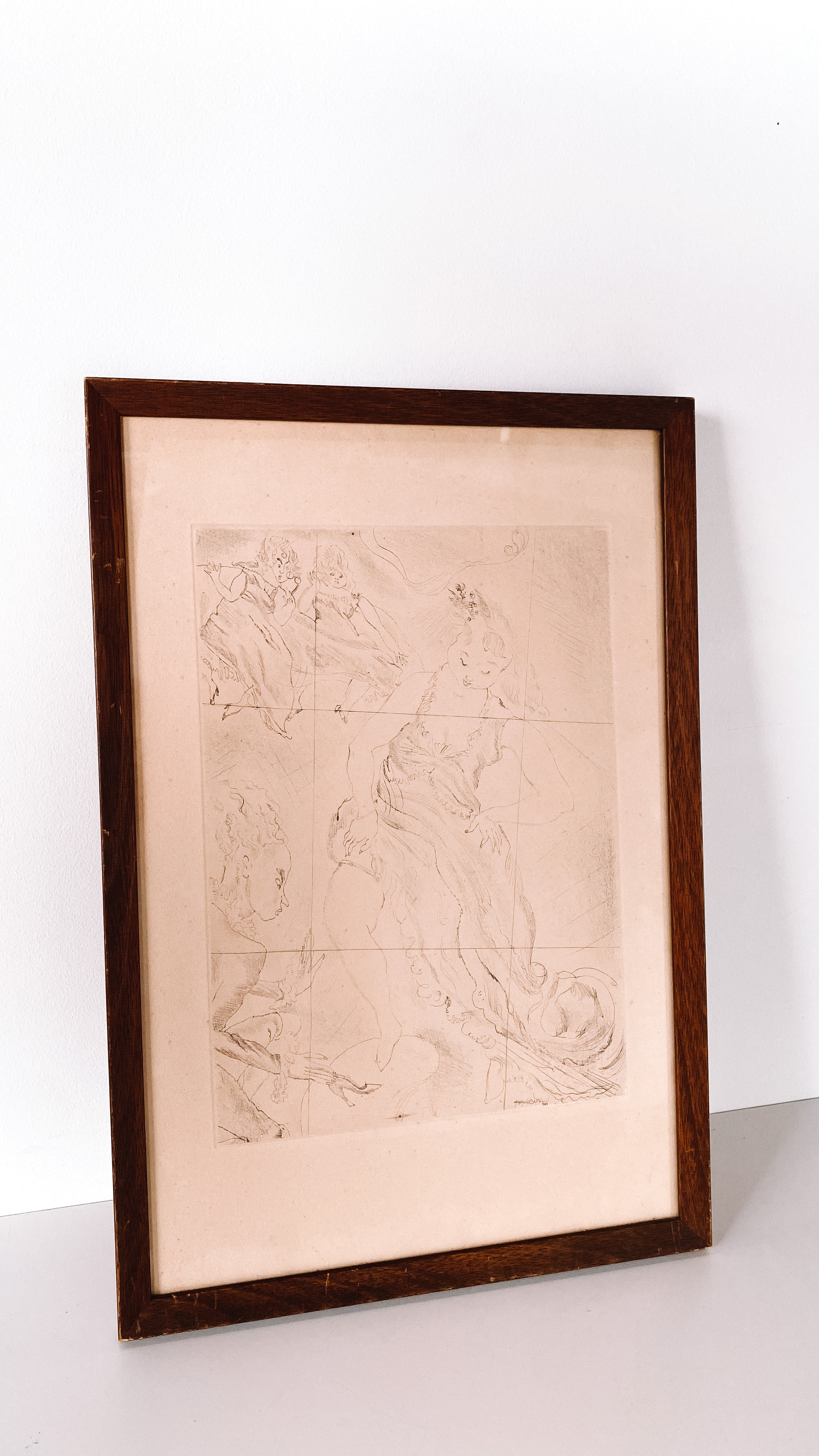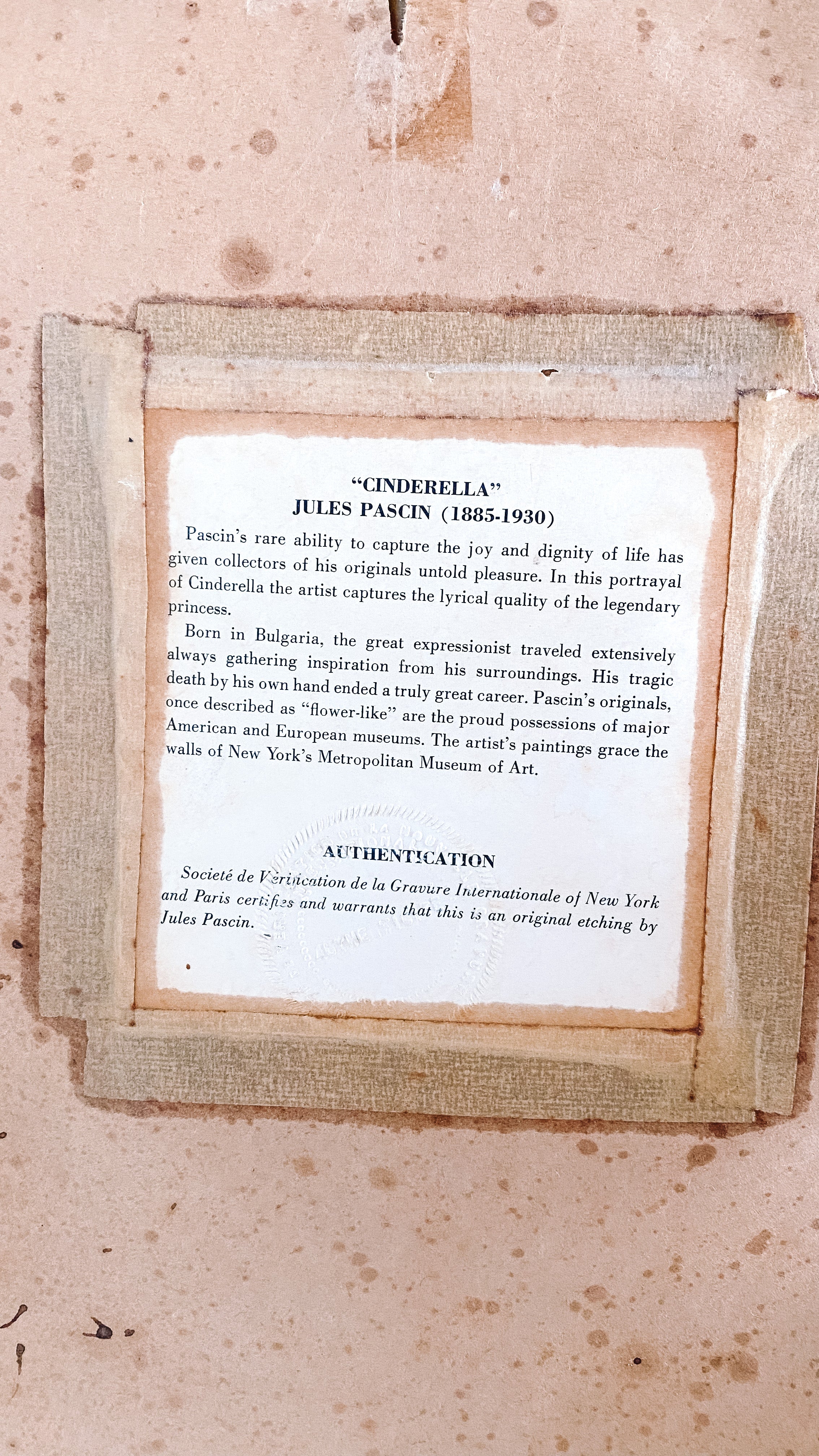 This is an original Cinderella etching by Jules Pascin. It is stamped for authentication. In a wooden frame. Good vintage condition - some scratches on the frame, glass has significant glare and may need to be replaced.
