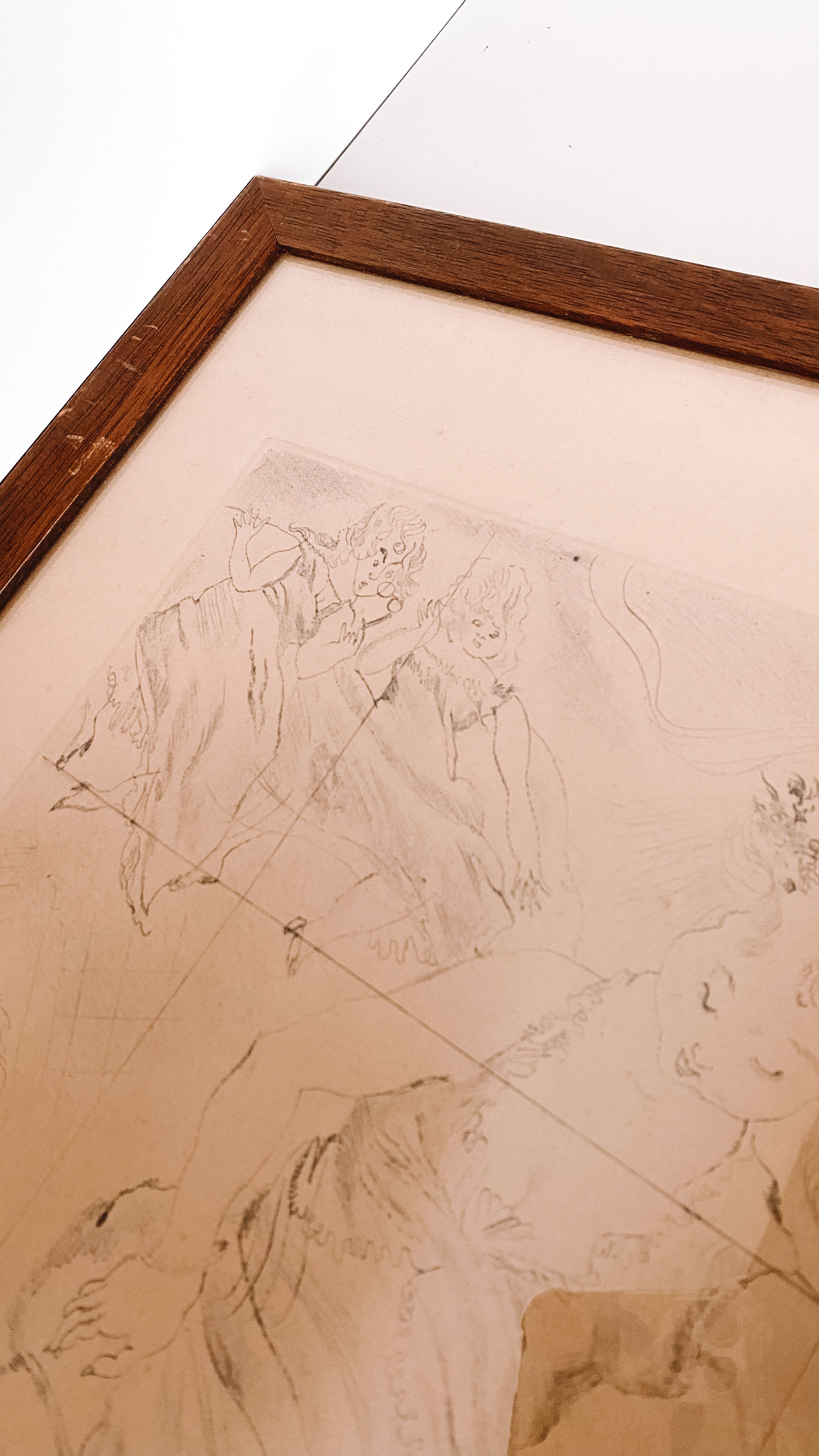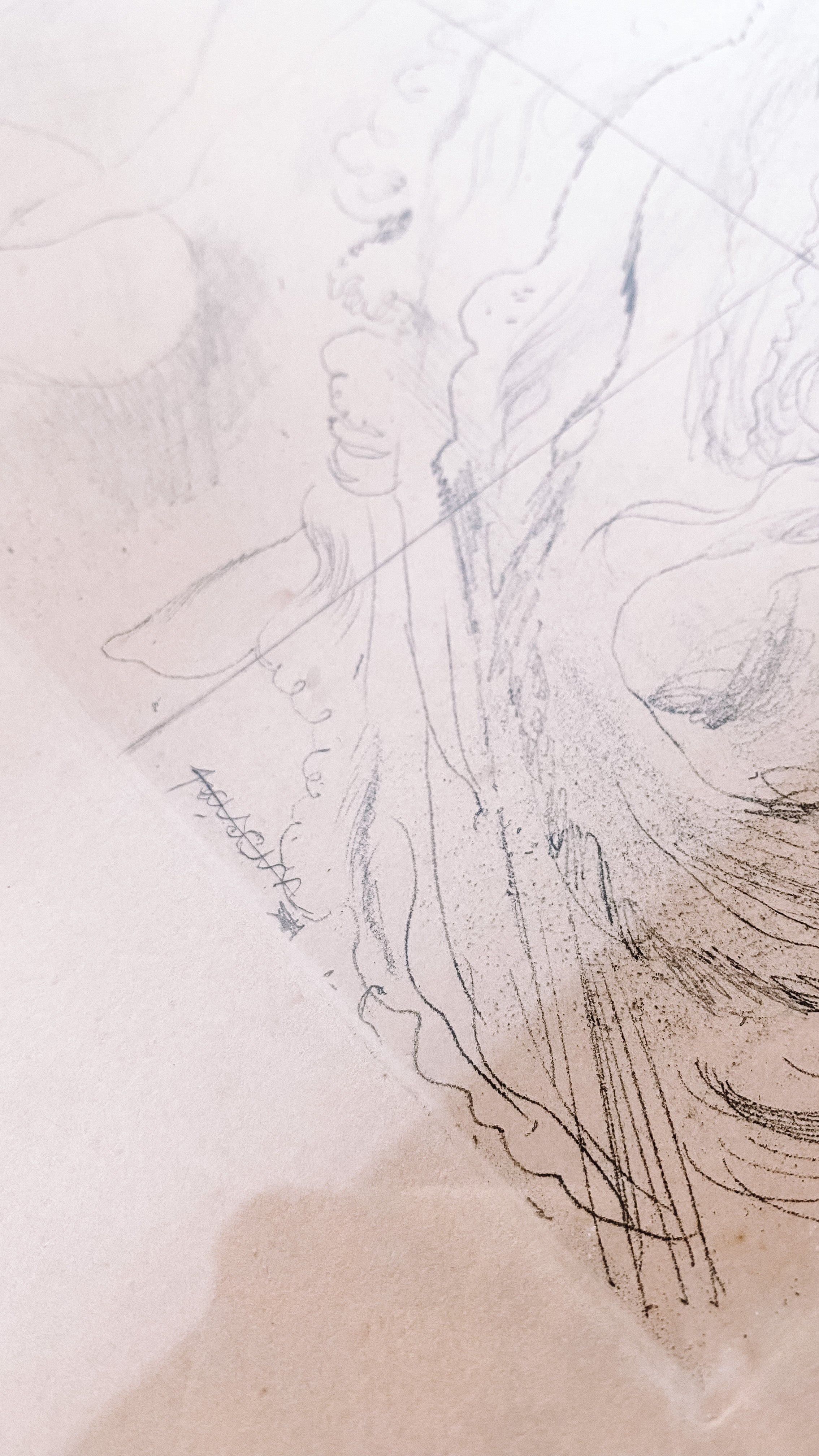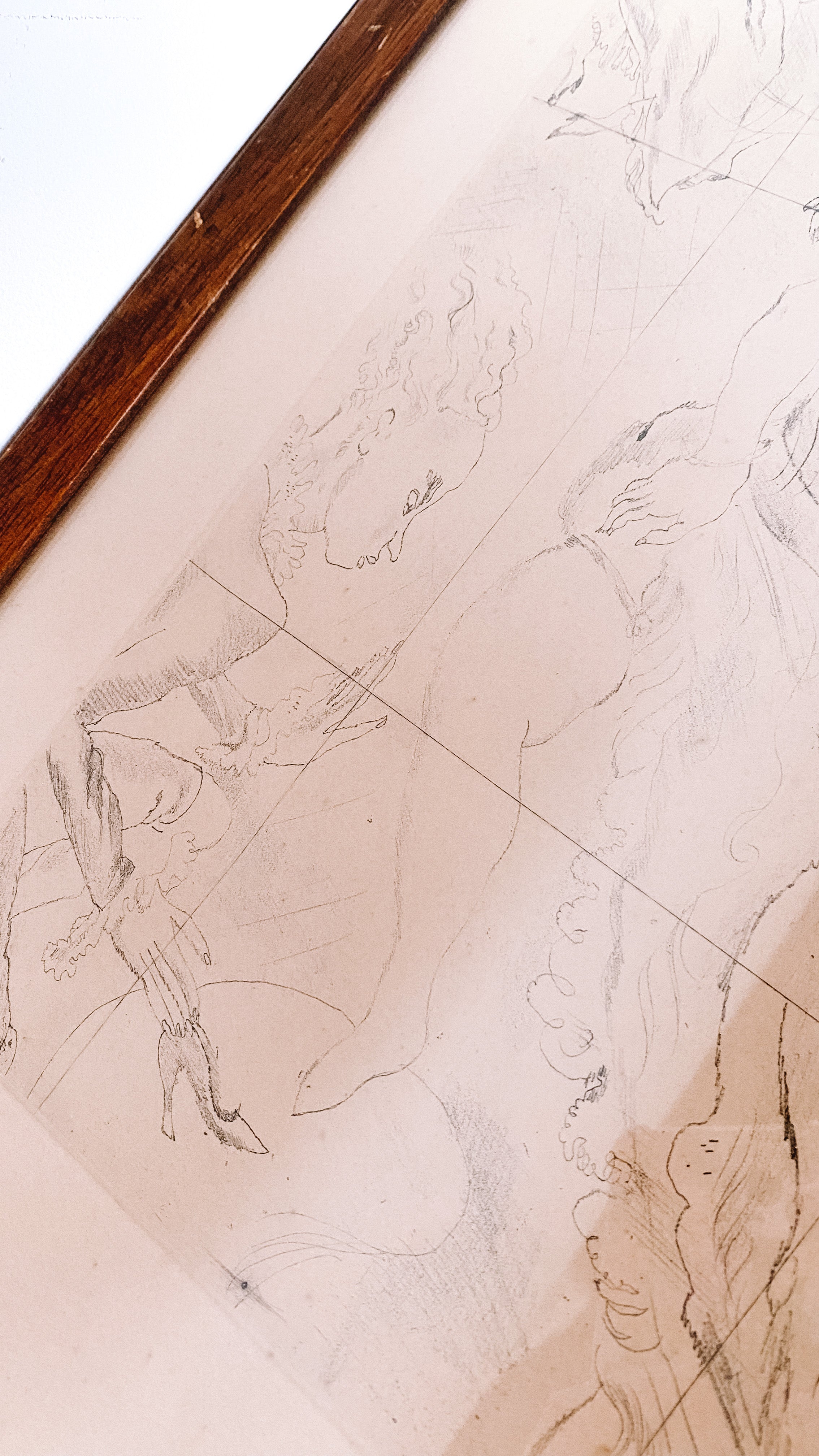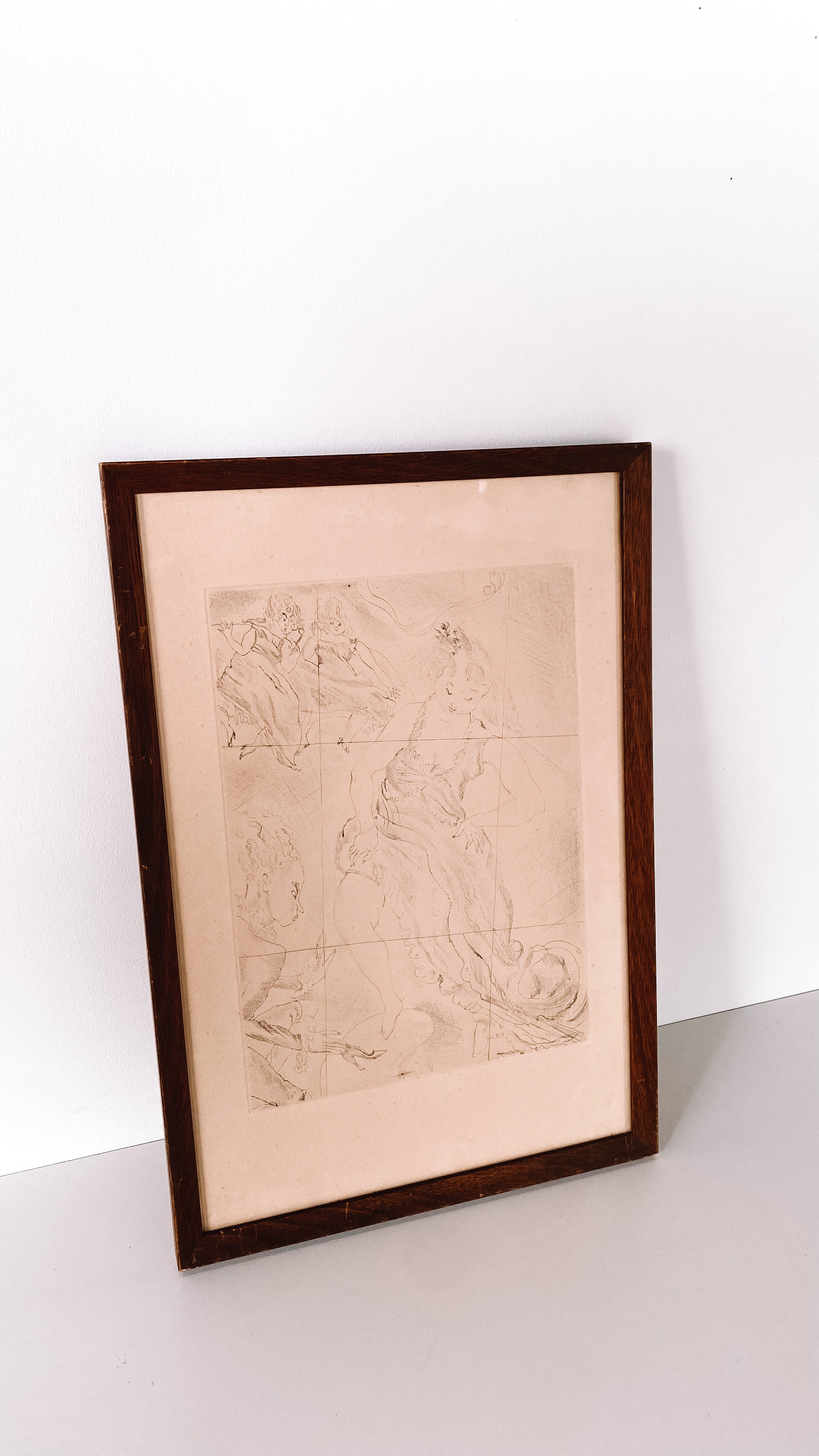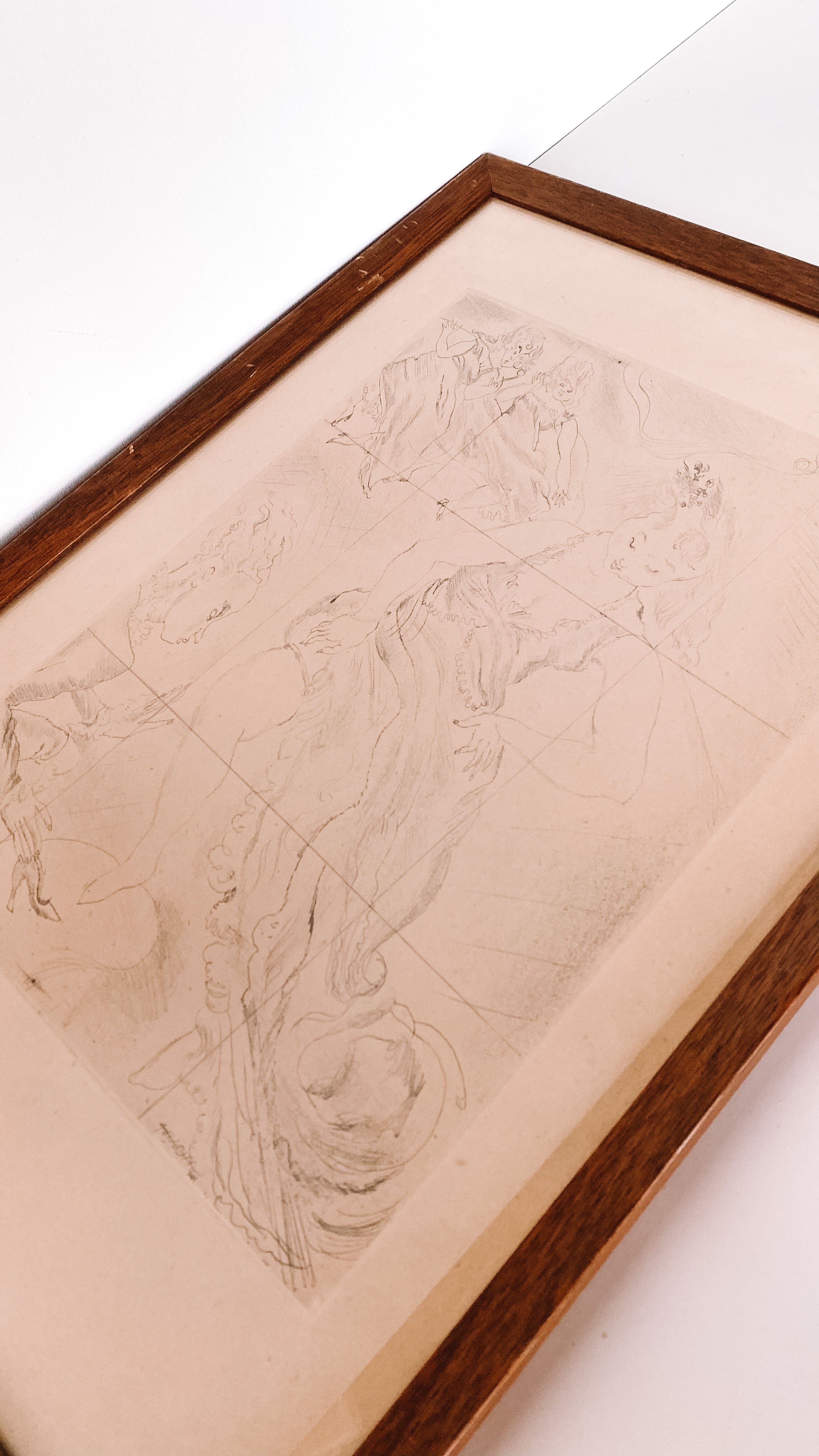 This is an original Cinderella etching by Jules Pascin. It is stamped for authentication. In a wooden frame. Good vintage condition - some scratches on the frame, glass has significant glare and may need to be replaced.