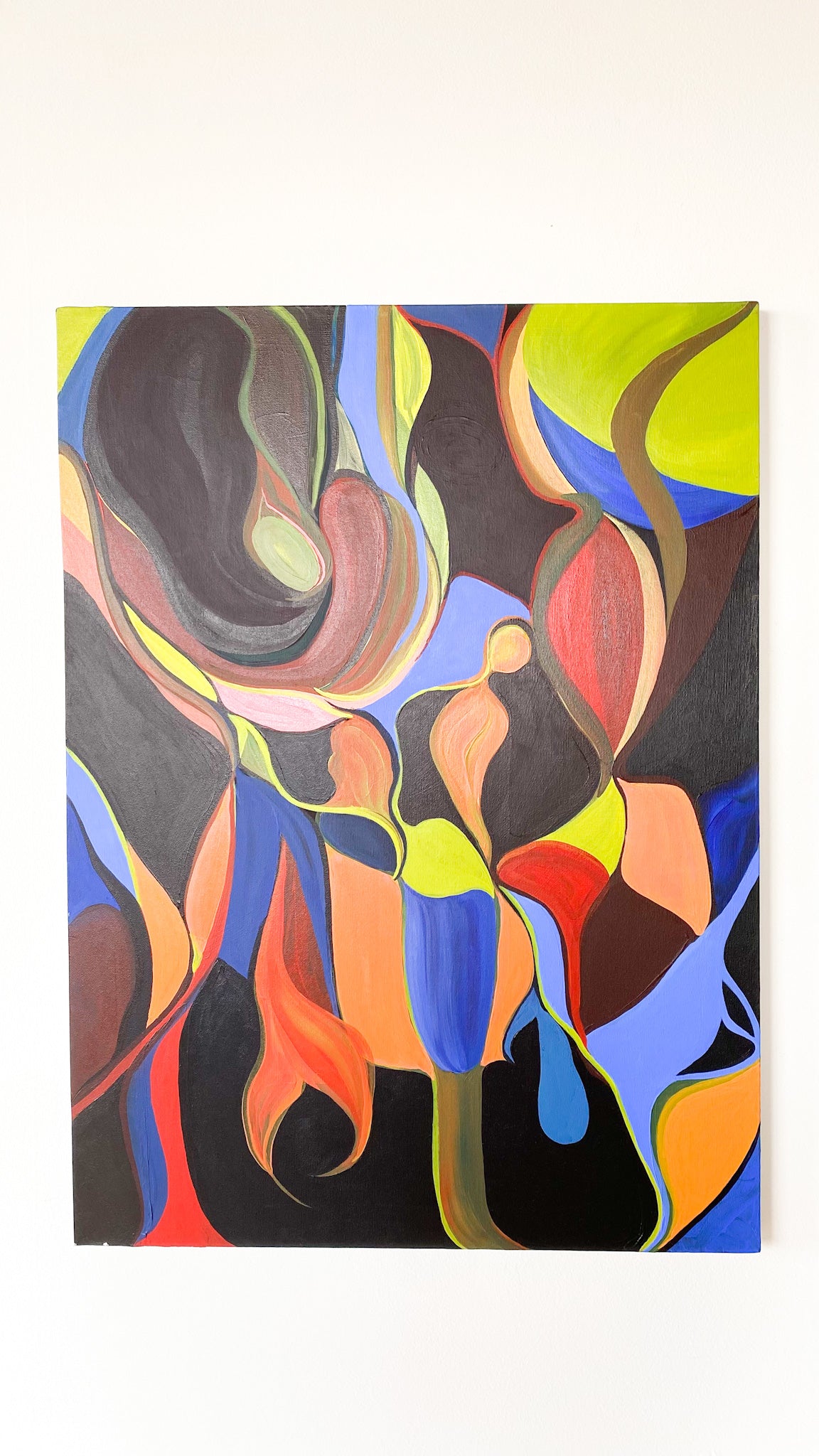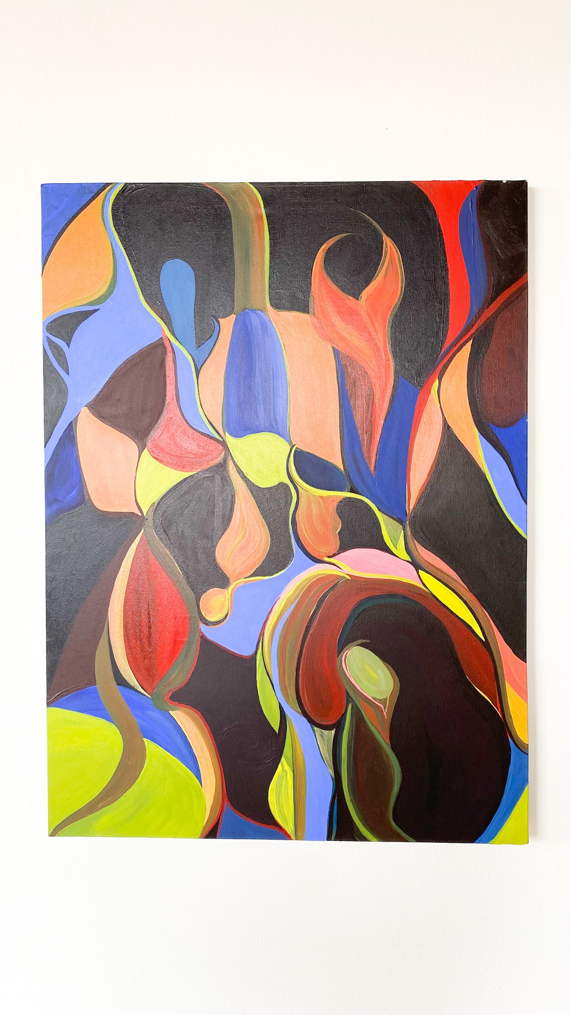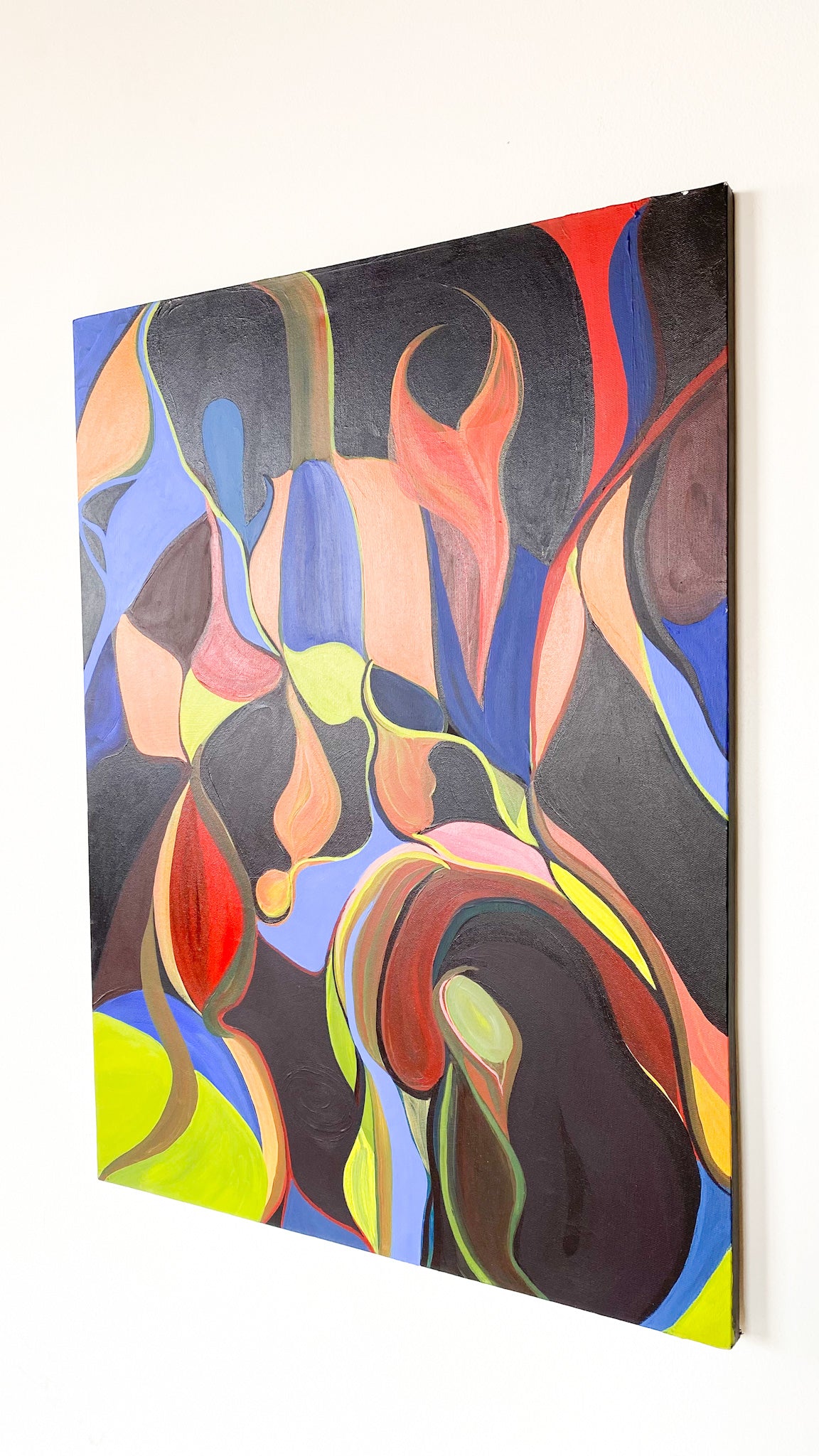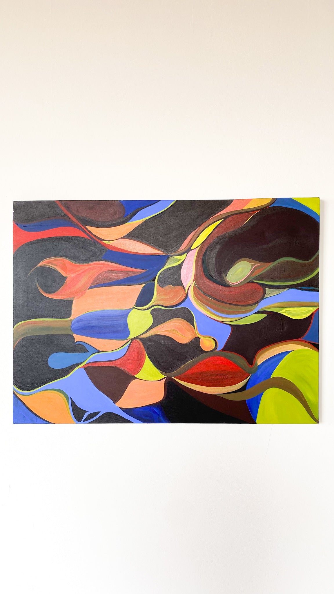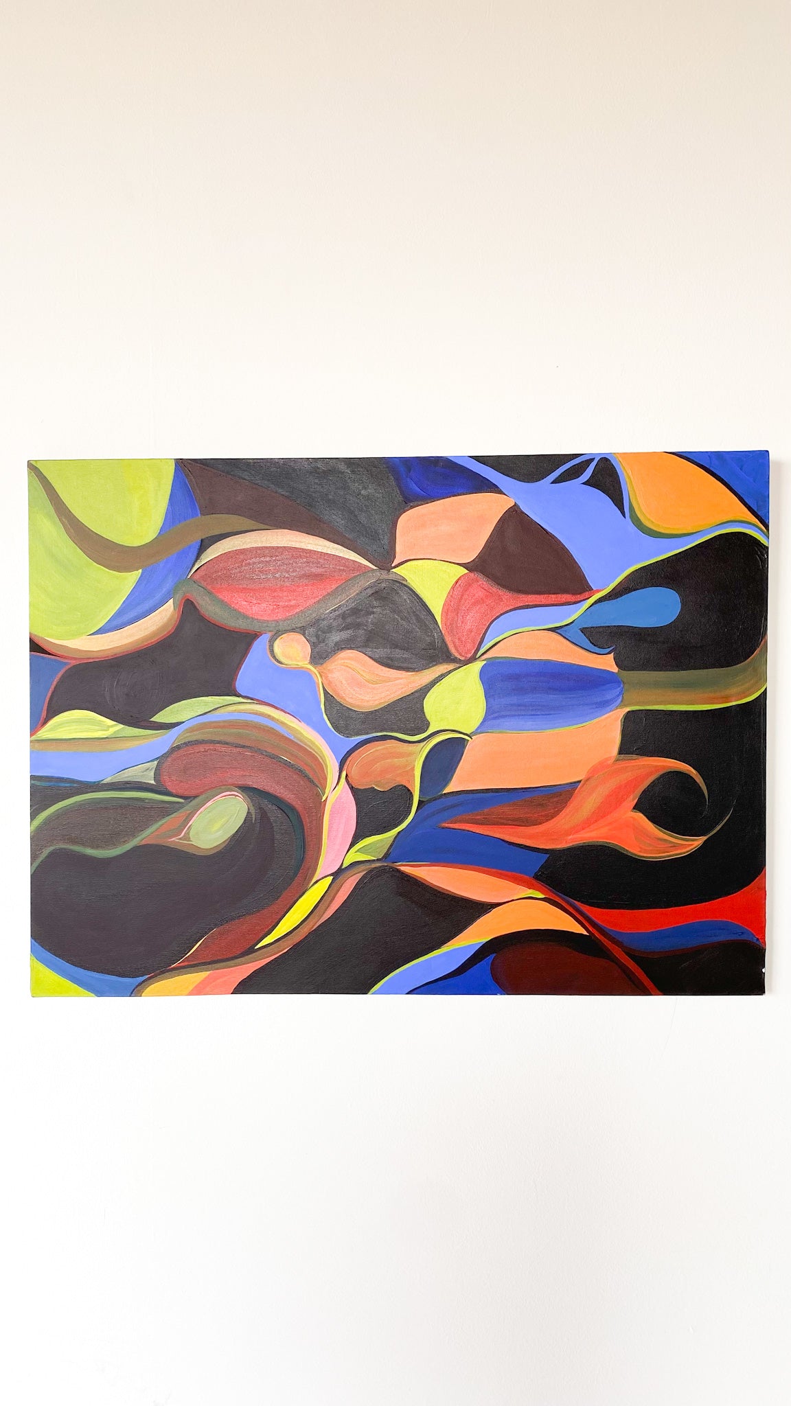 Large canvas painting with freehand colorful abstract shapes. No signature or date. Can be displayed in whichever direction that pleases your eye. Good vintage condition - no visible flaws.