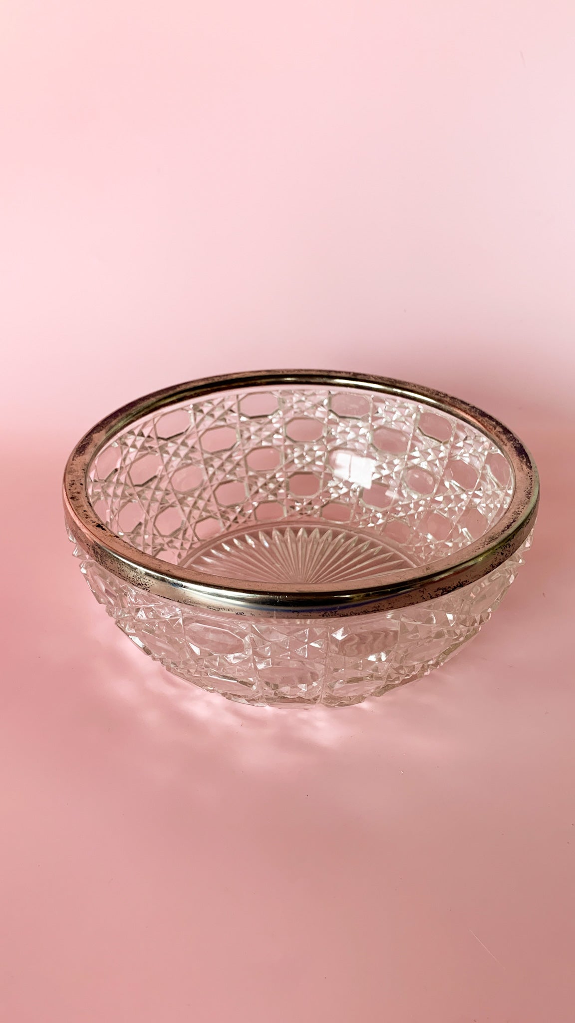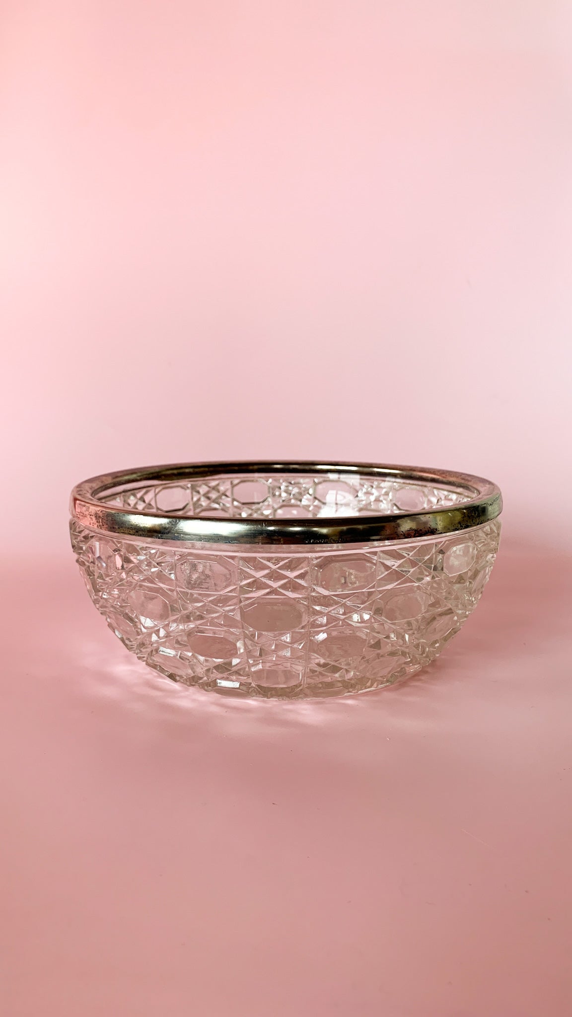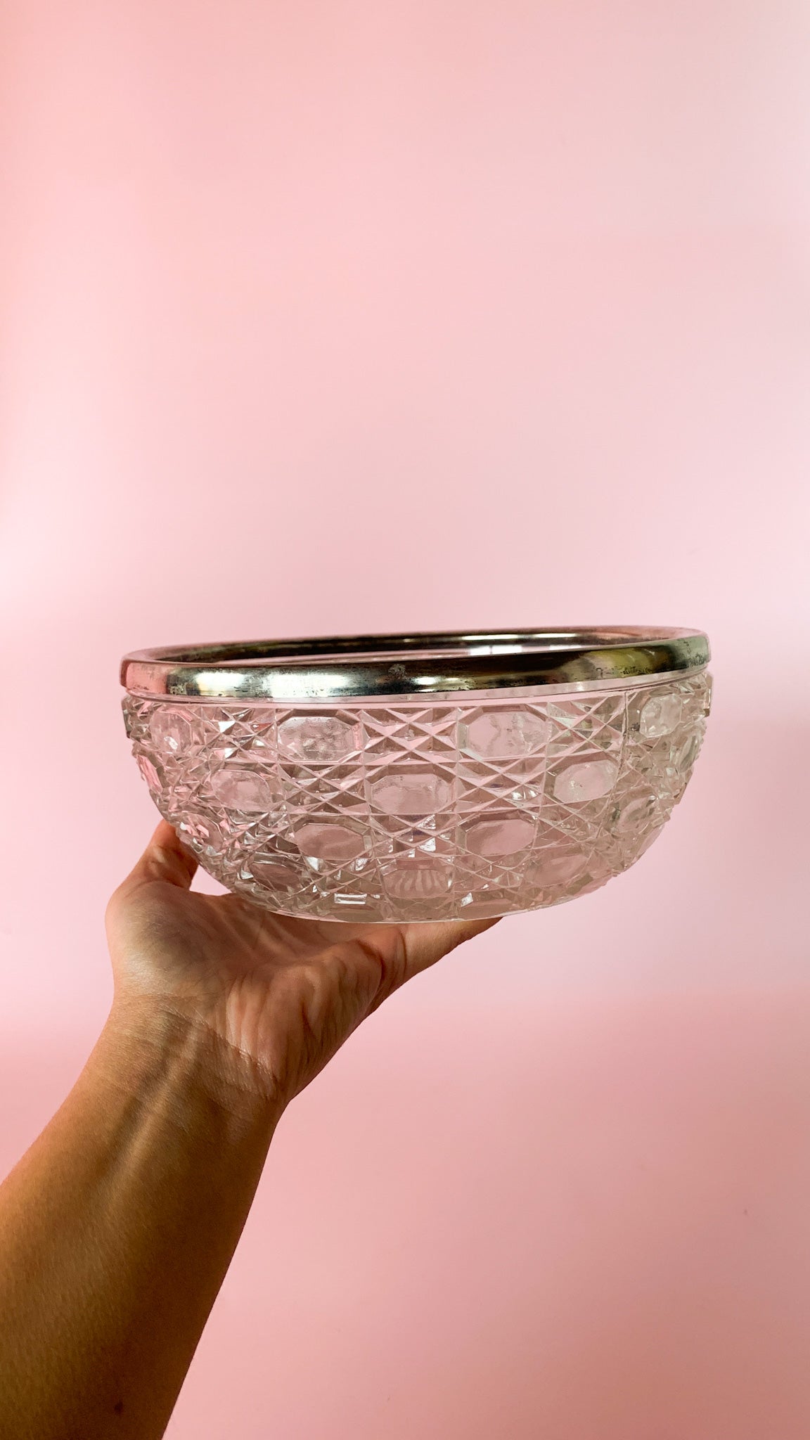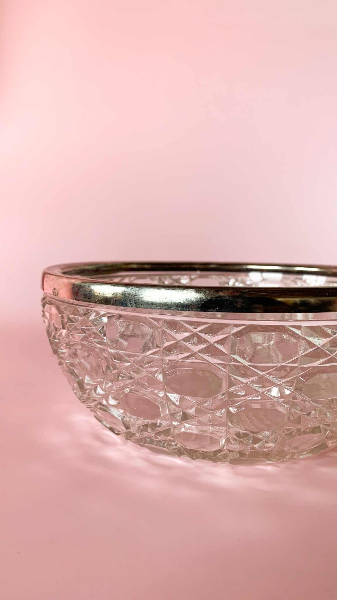 Local pick up only! Cut glass serving bowl with a silver plated trim. Checker design on the sides, with a starburst pattern on the base. Stamped on the side for sterling silver plating.