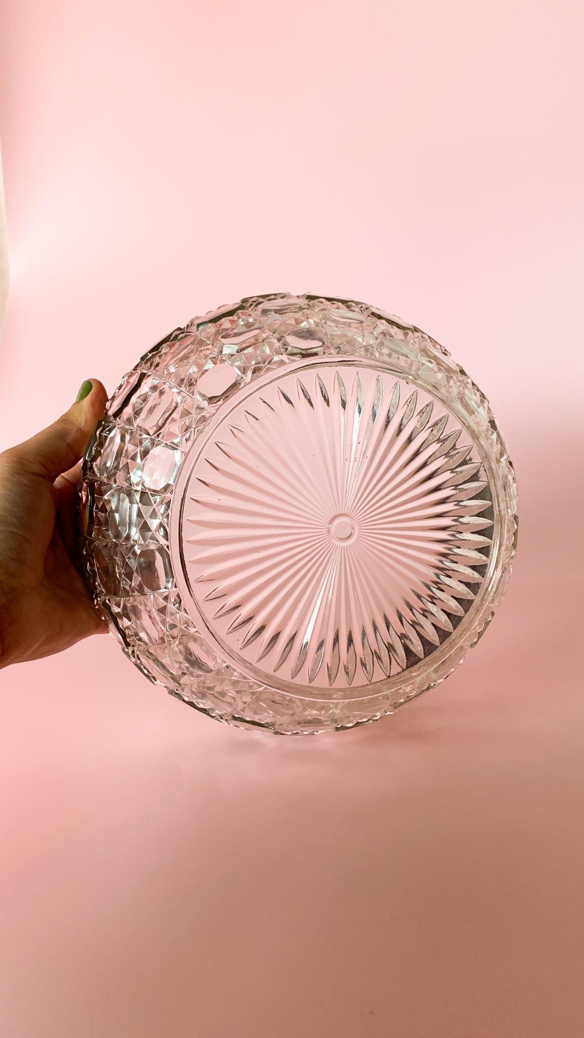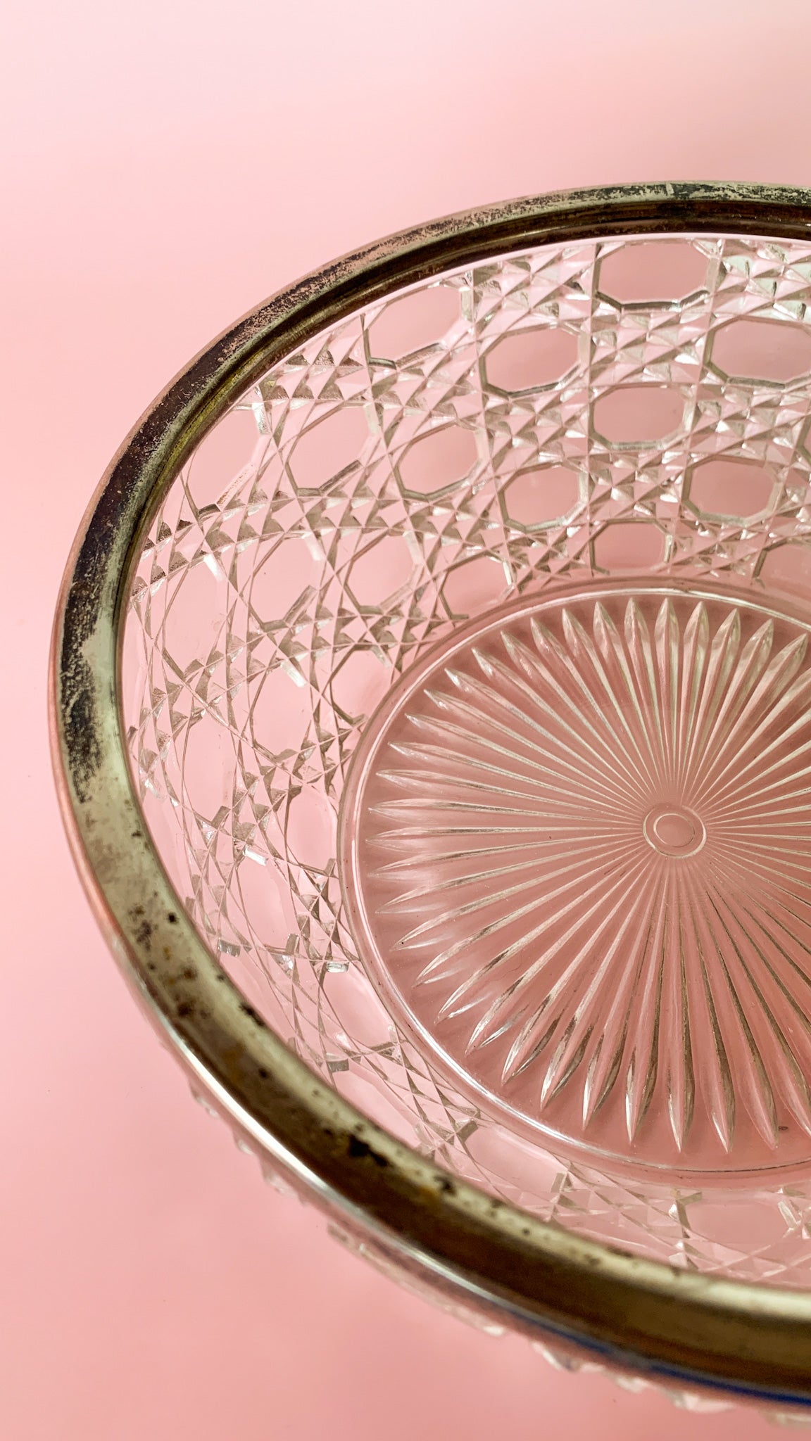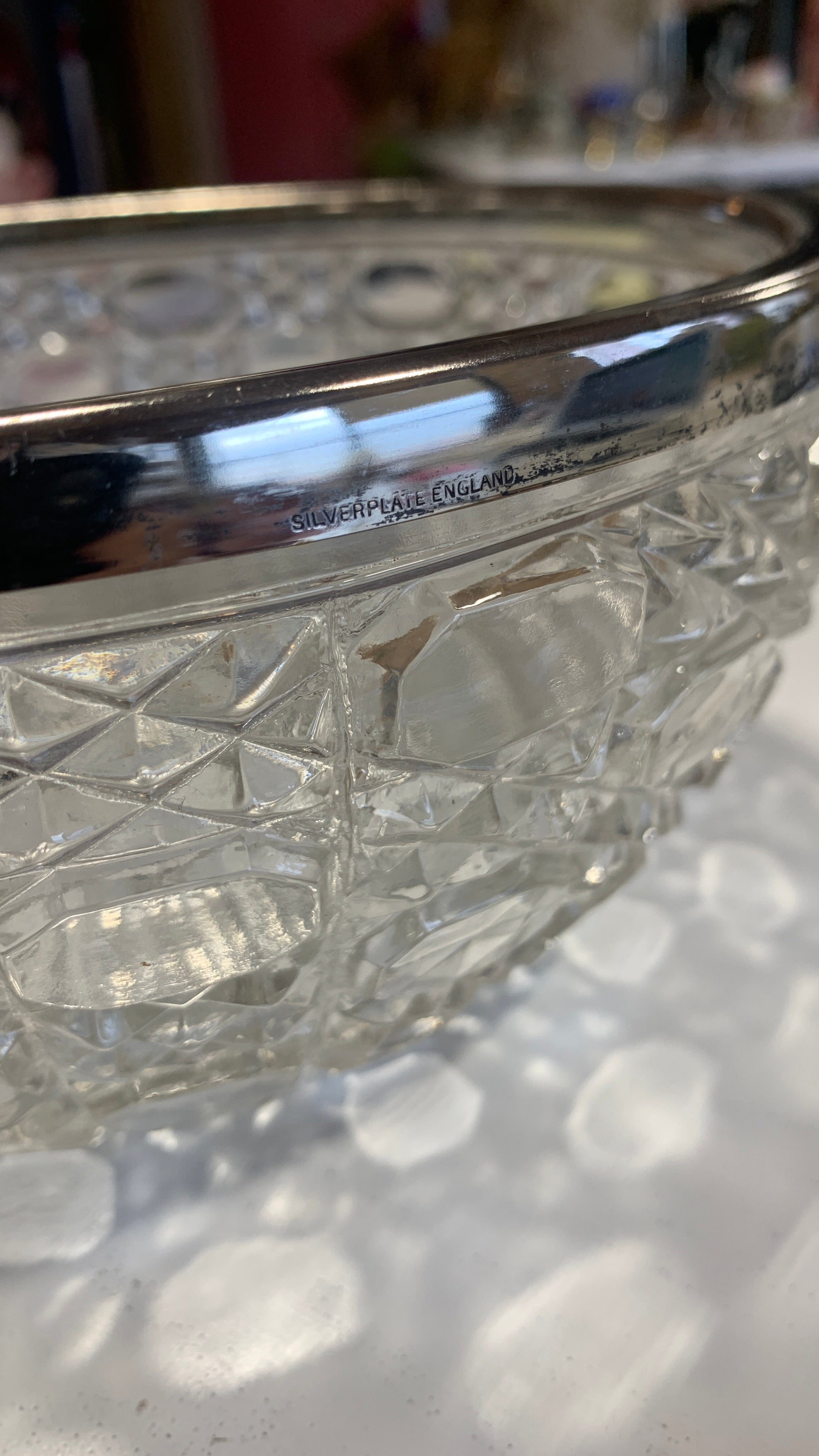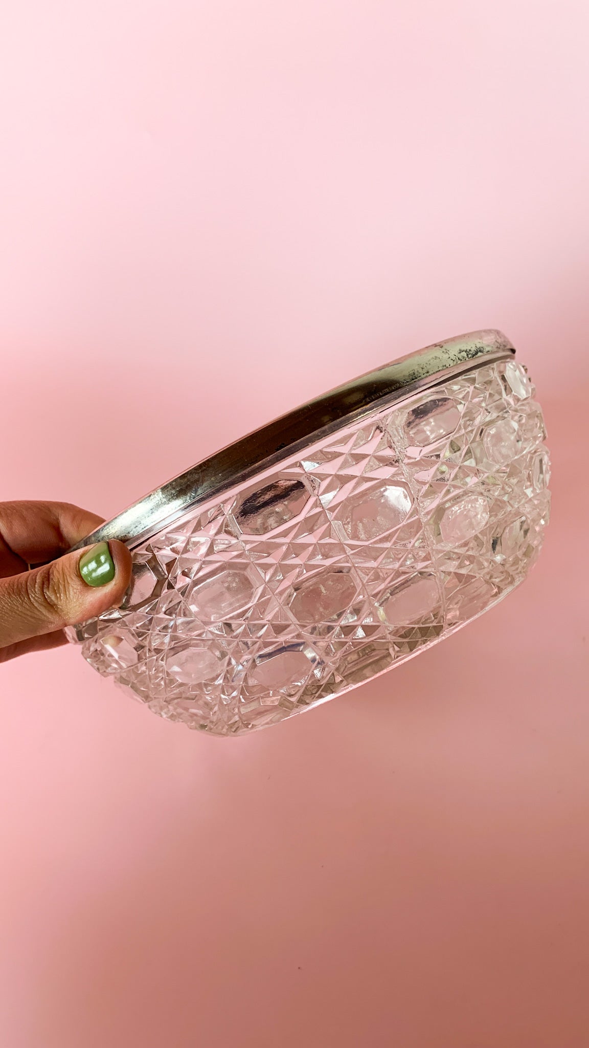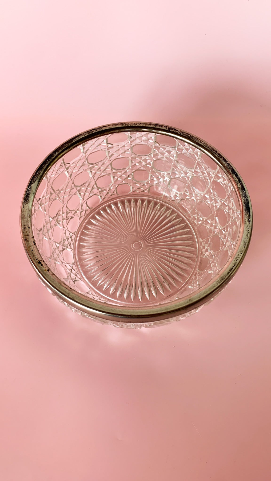 Local pick up only! Cut glass serving bowl with a silver plated trim. Checker design on the sides, with a starburst pattern on the base. Stamped on the side for sterling silver plating.