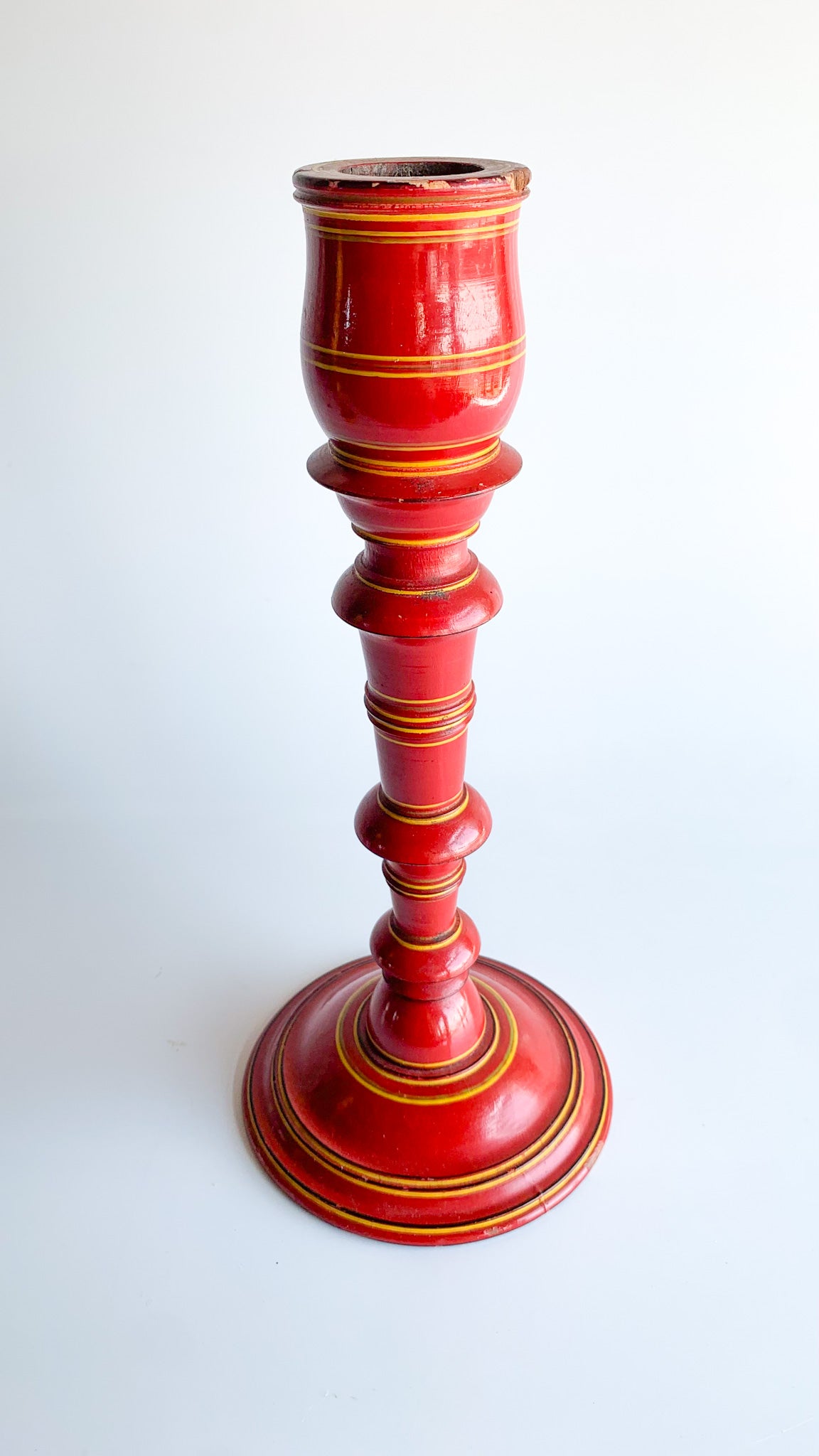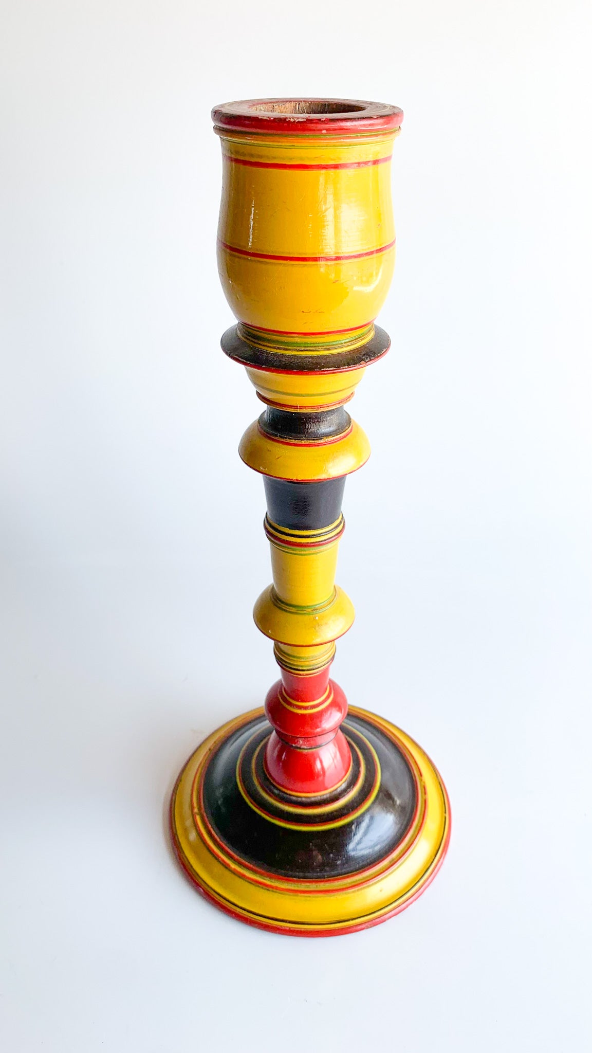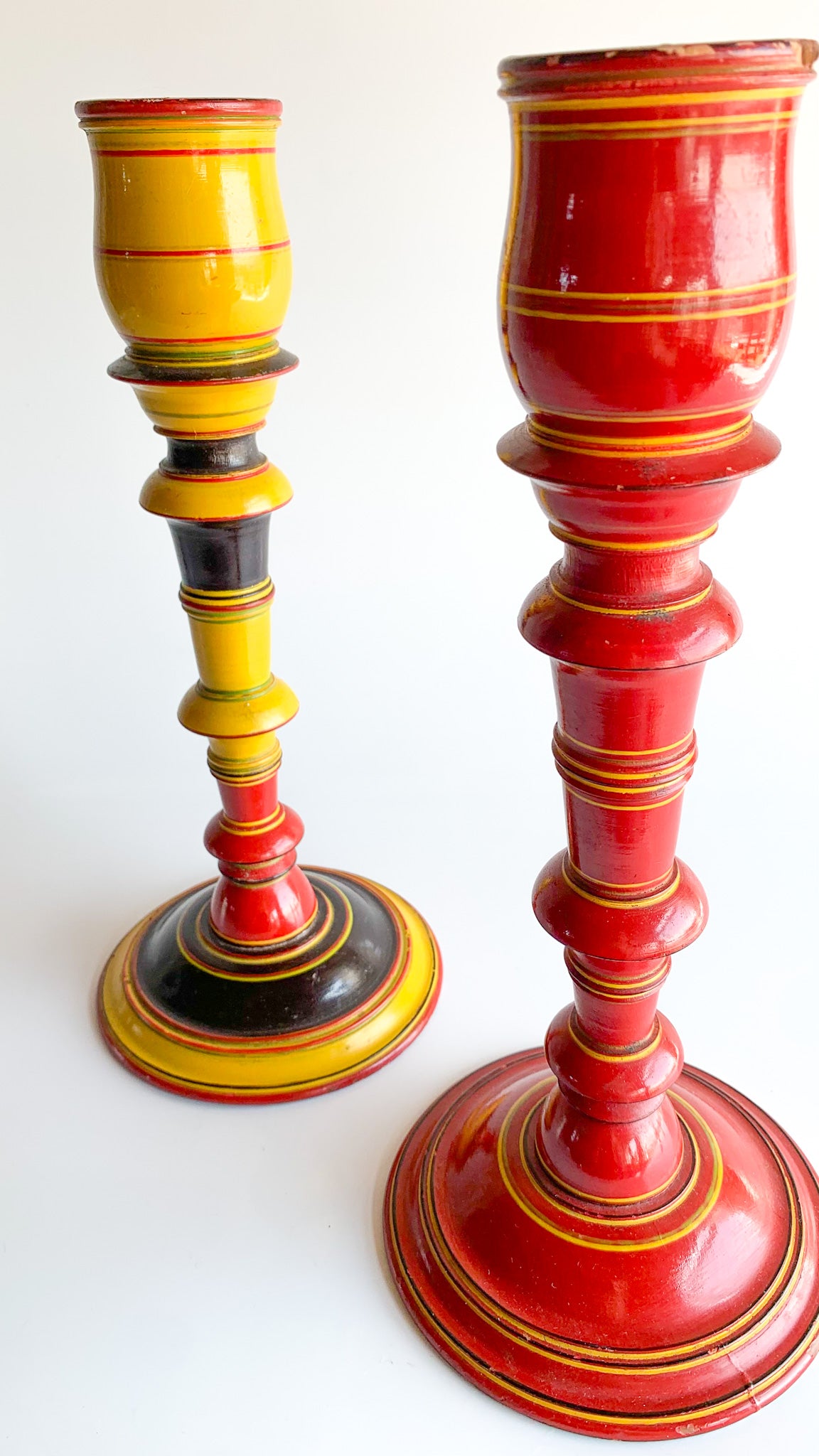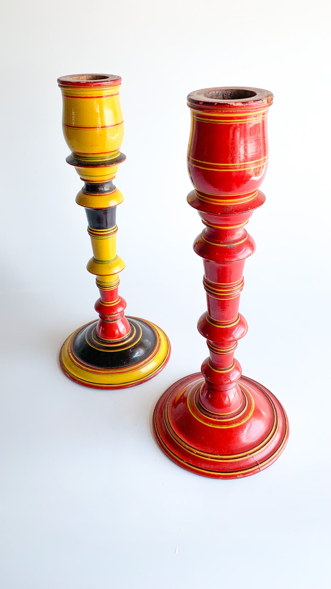 Pair of coordinating wooden candle sticks. Red and yellow with subtle green accents. Good vintage condition. Some chips in the top of the red candlestick.