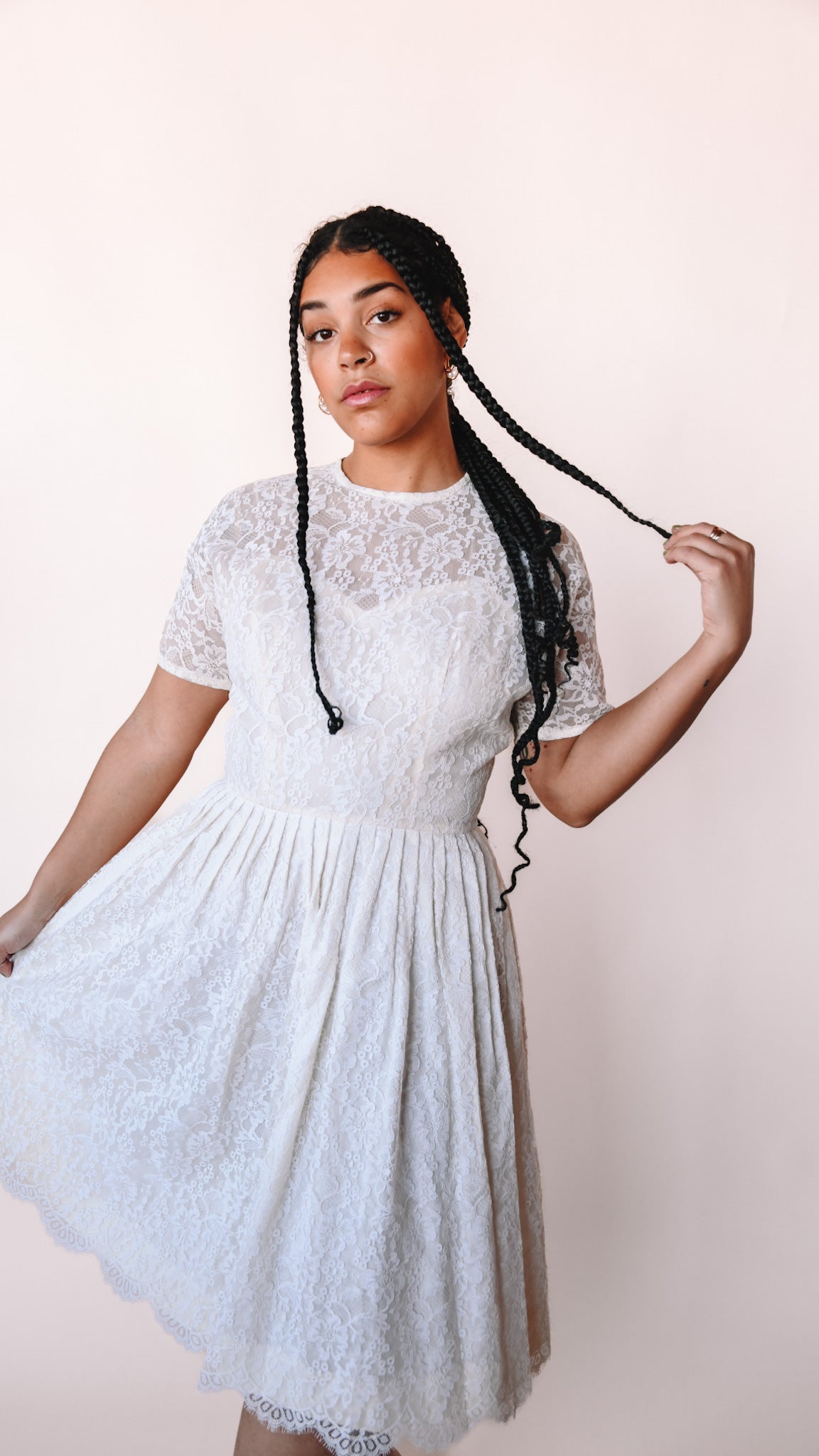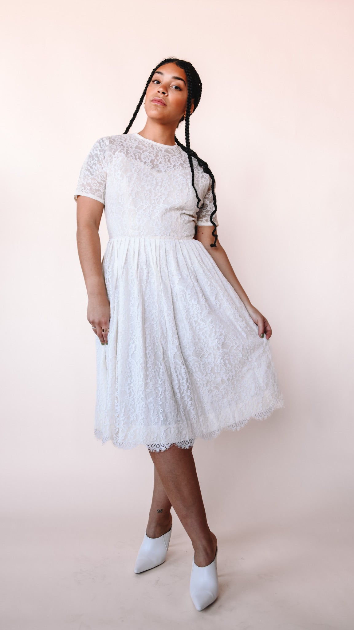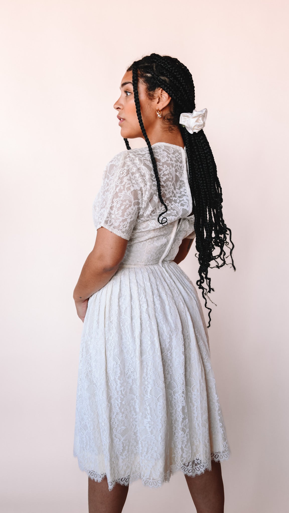 Short sleeve full lace tea length wedding dress, with a semi sheer top and pleated skirt. Has a cream slip lining. Center back zipper with a key hole opening at the top. Good vintage condition - no visible flaws.