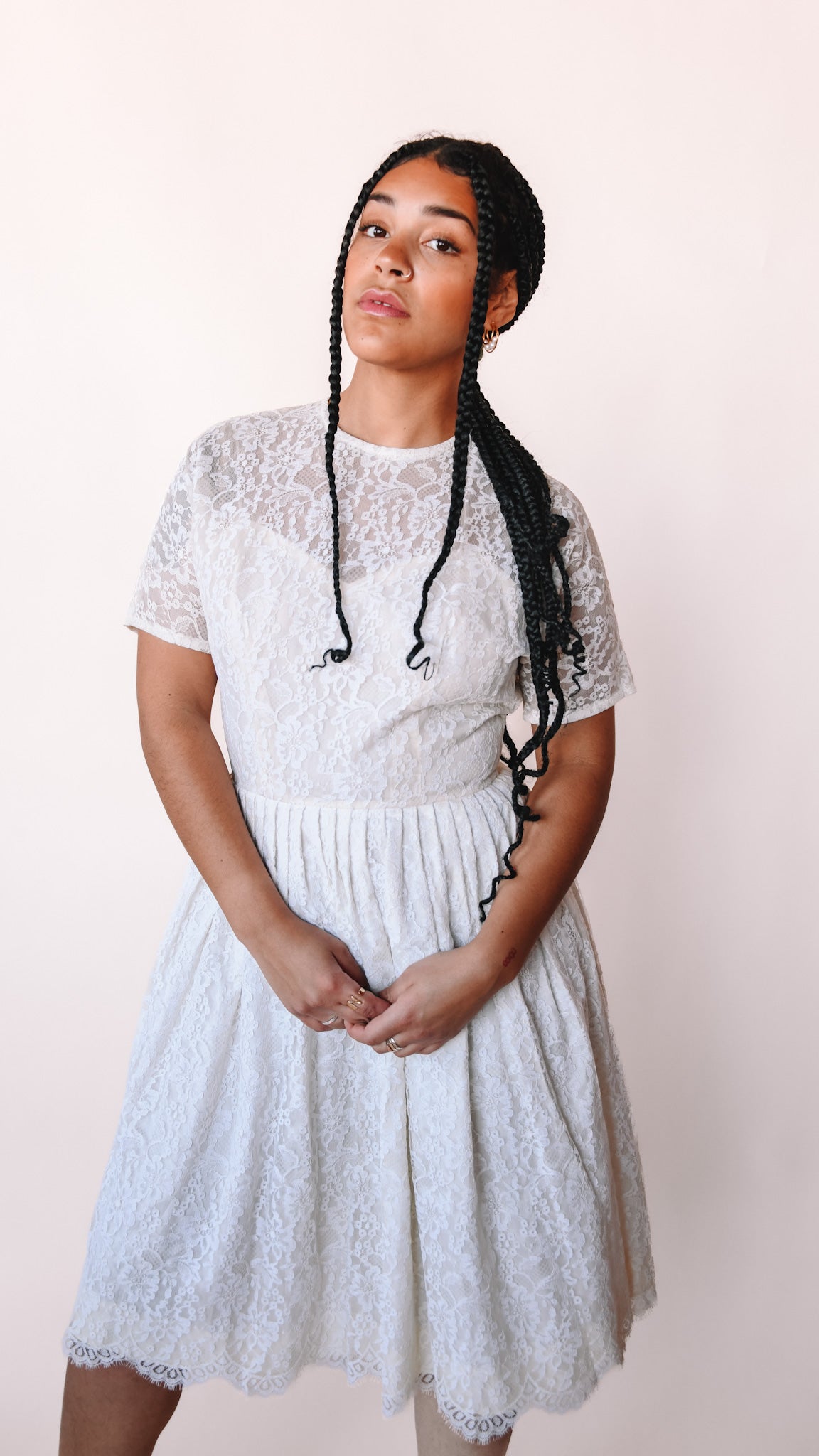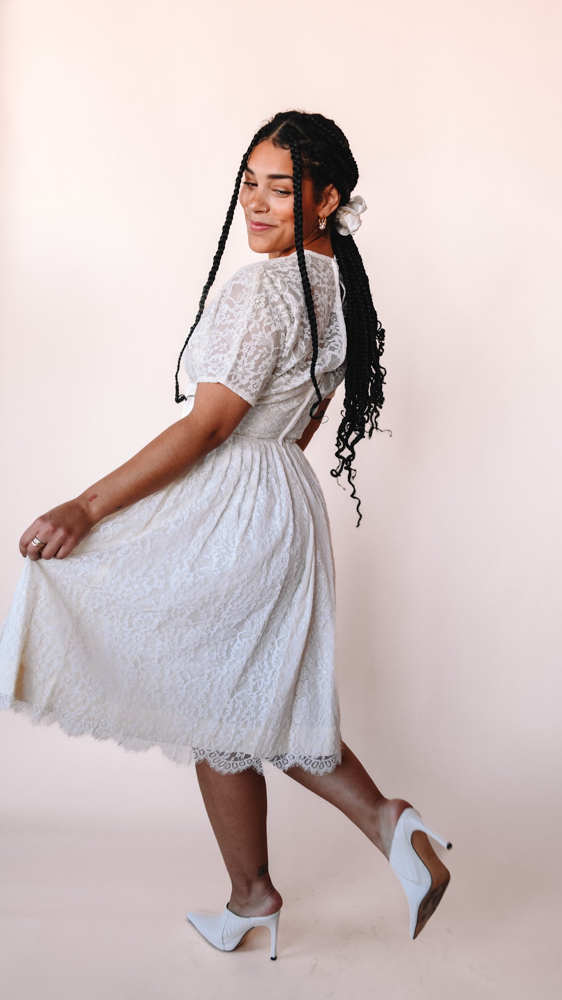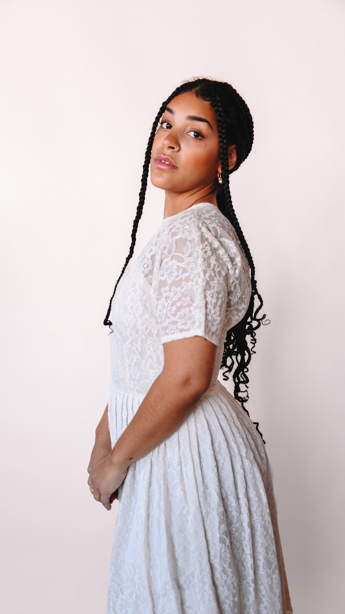 Short sleeve full lace tea length wedding dress, with a semi sheer top and pleated skirt. Has a cream slip lining. Center back zipper with a key hole opening at the top. Good vintage condition - no visible flaws.