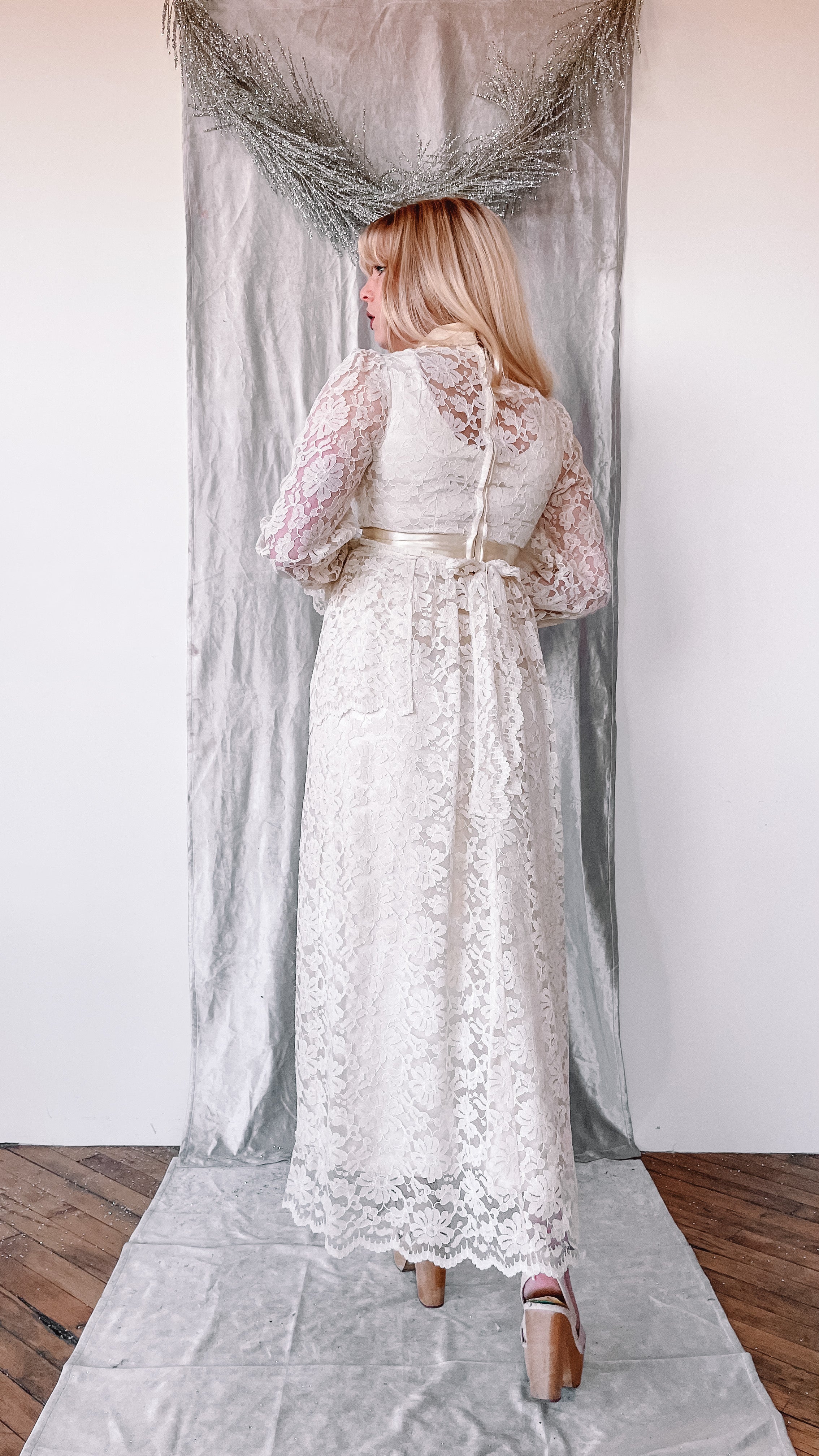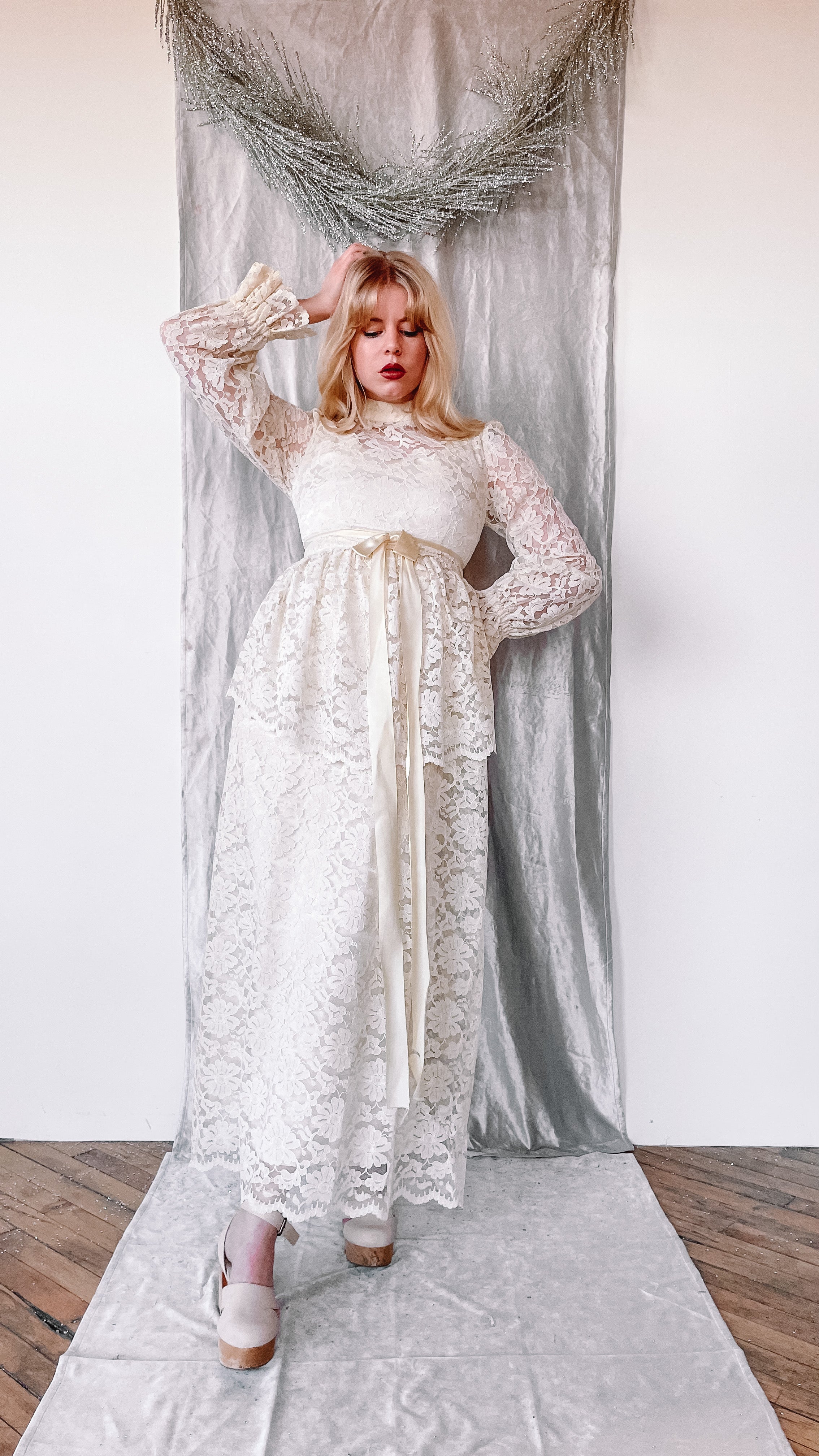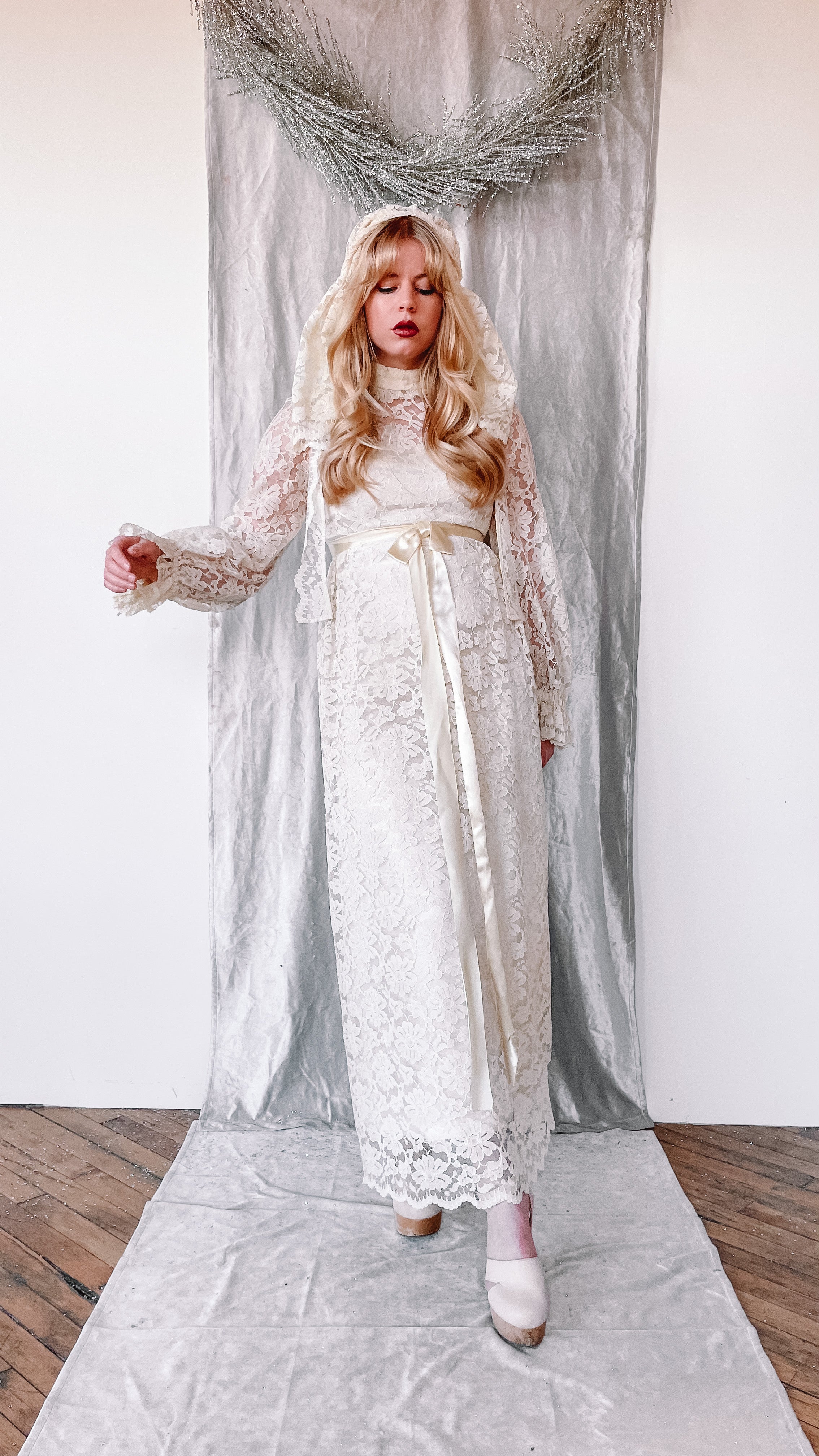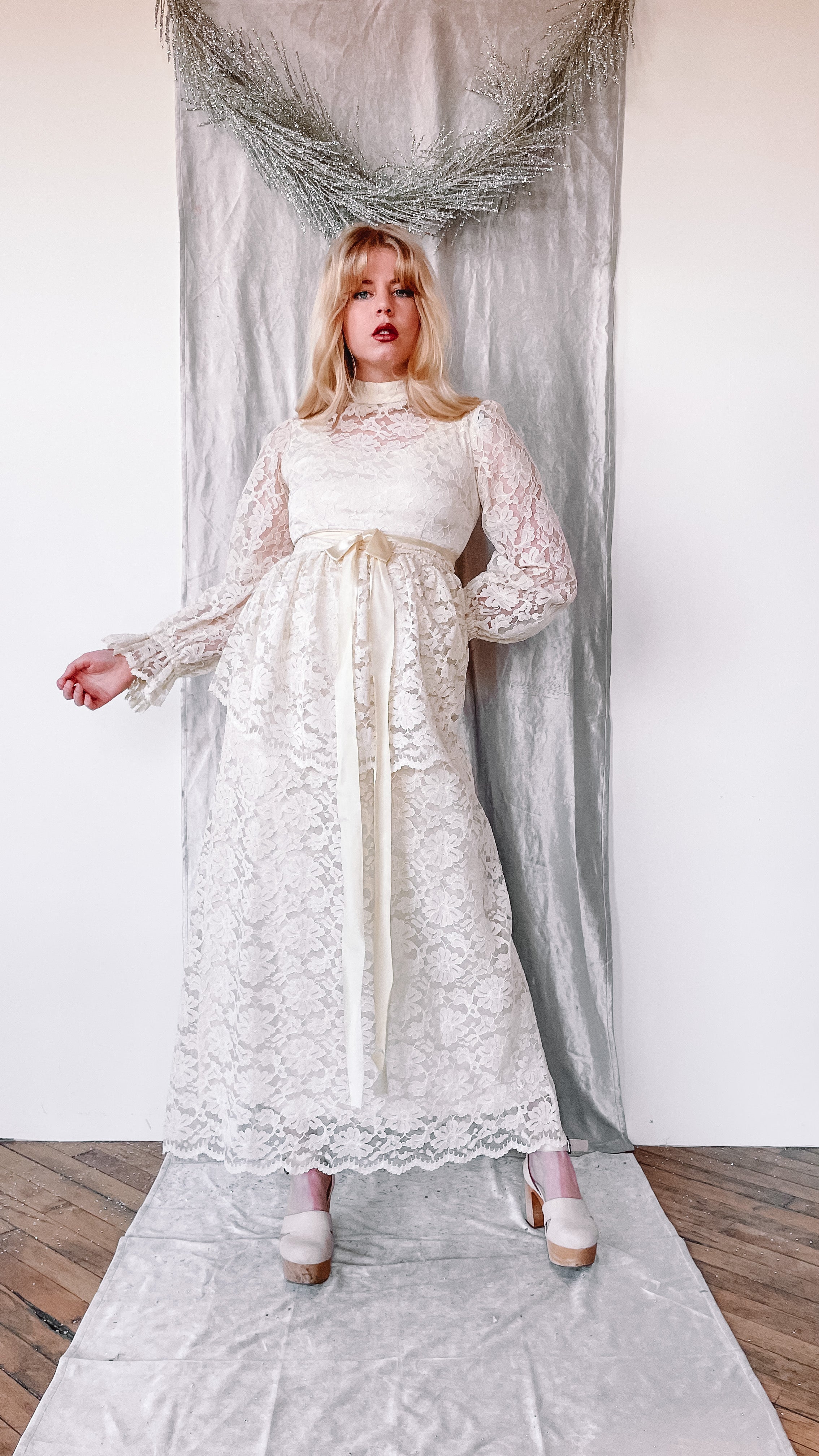 1970s Beloved high-neck lace gown, wedding dress, sz. S
