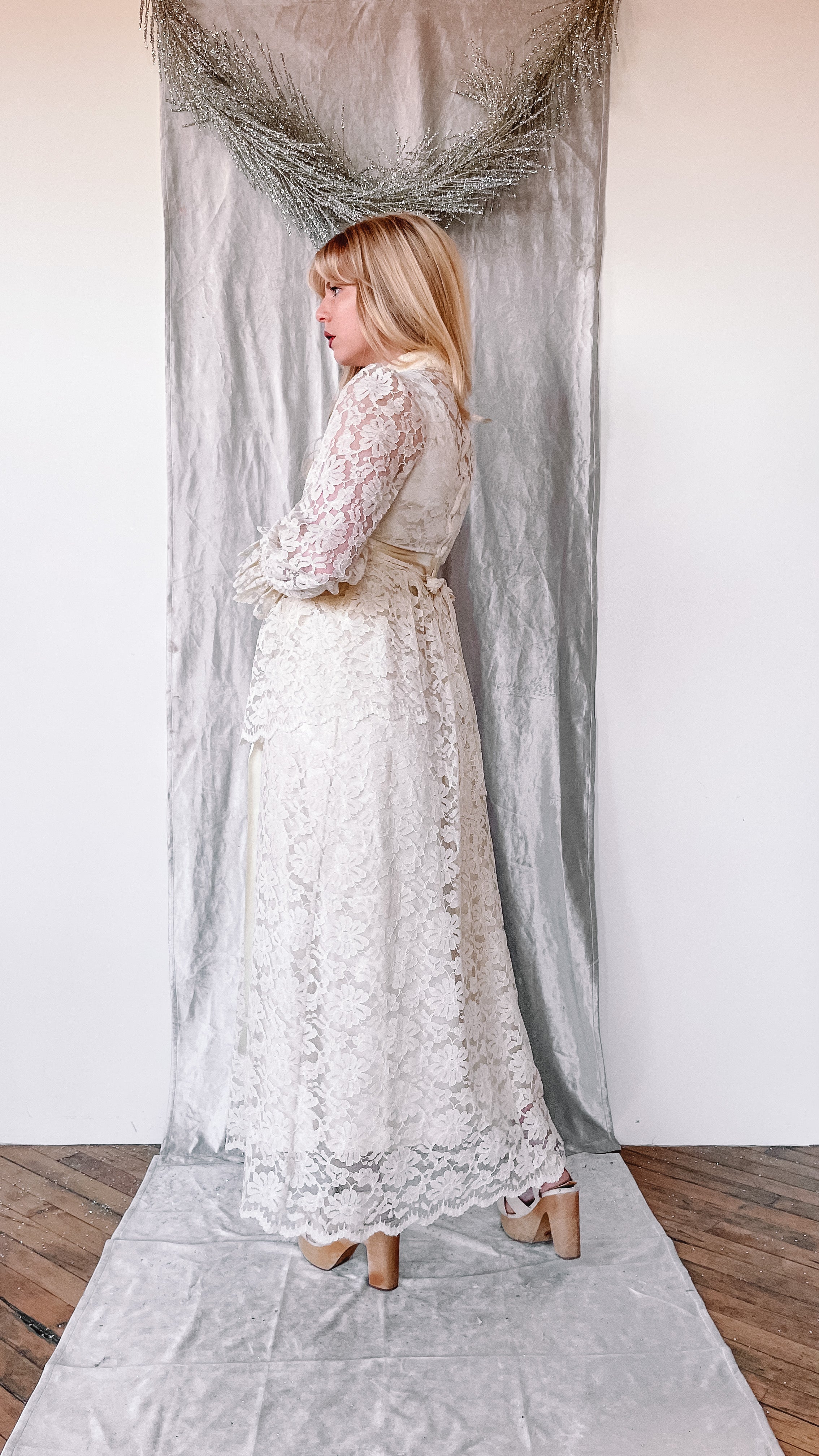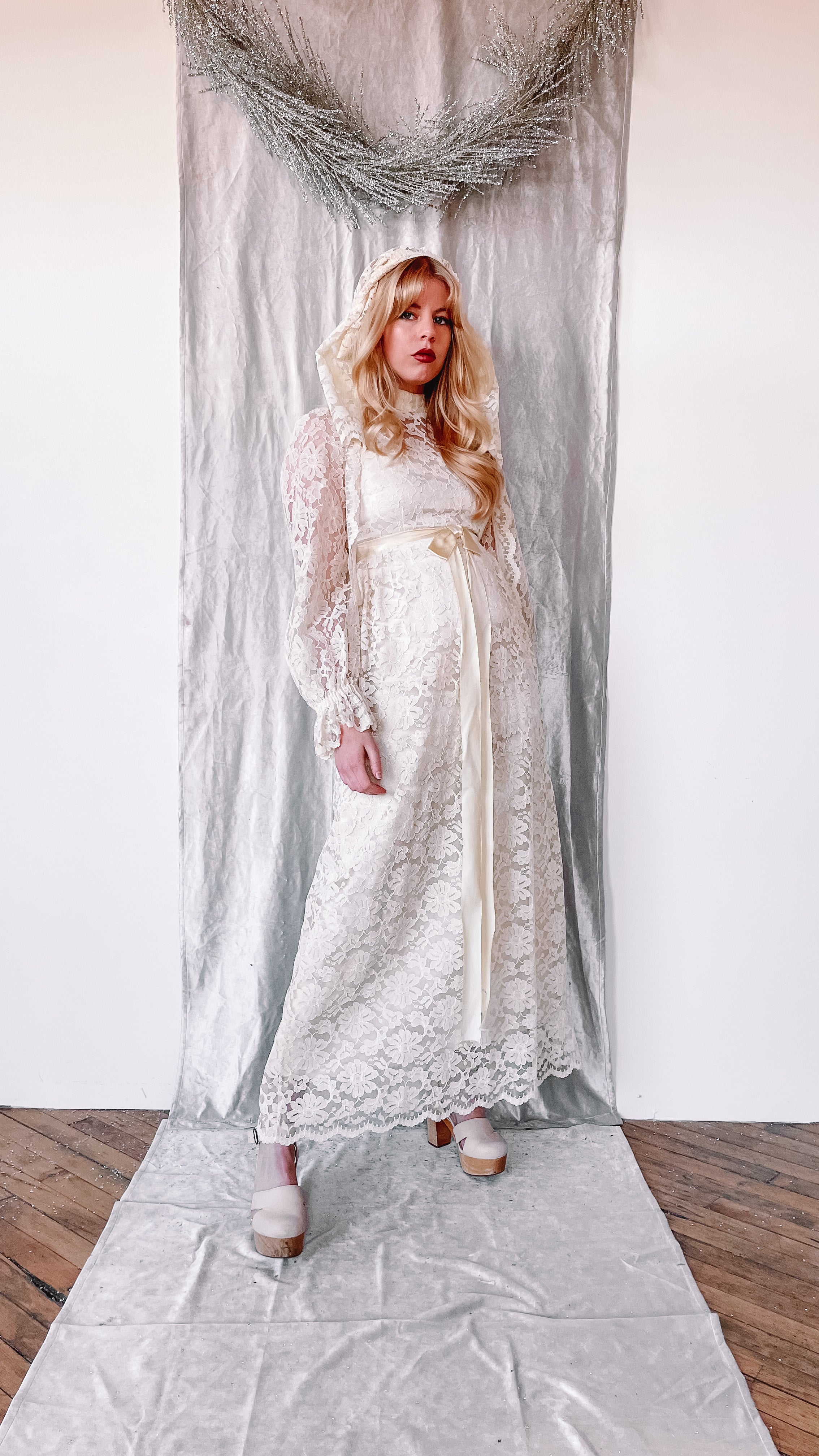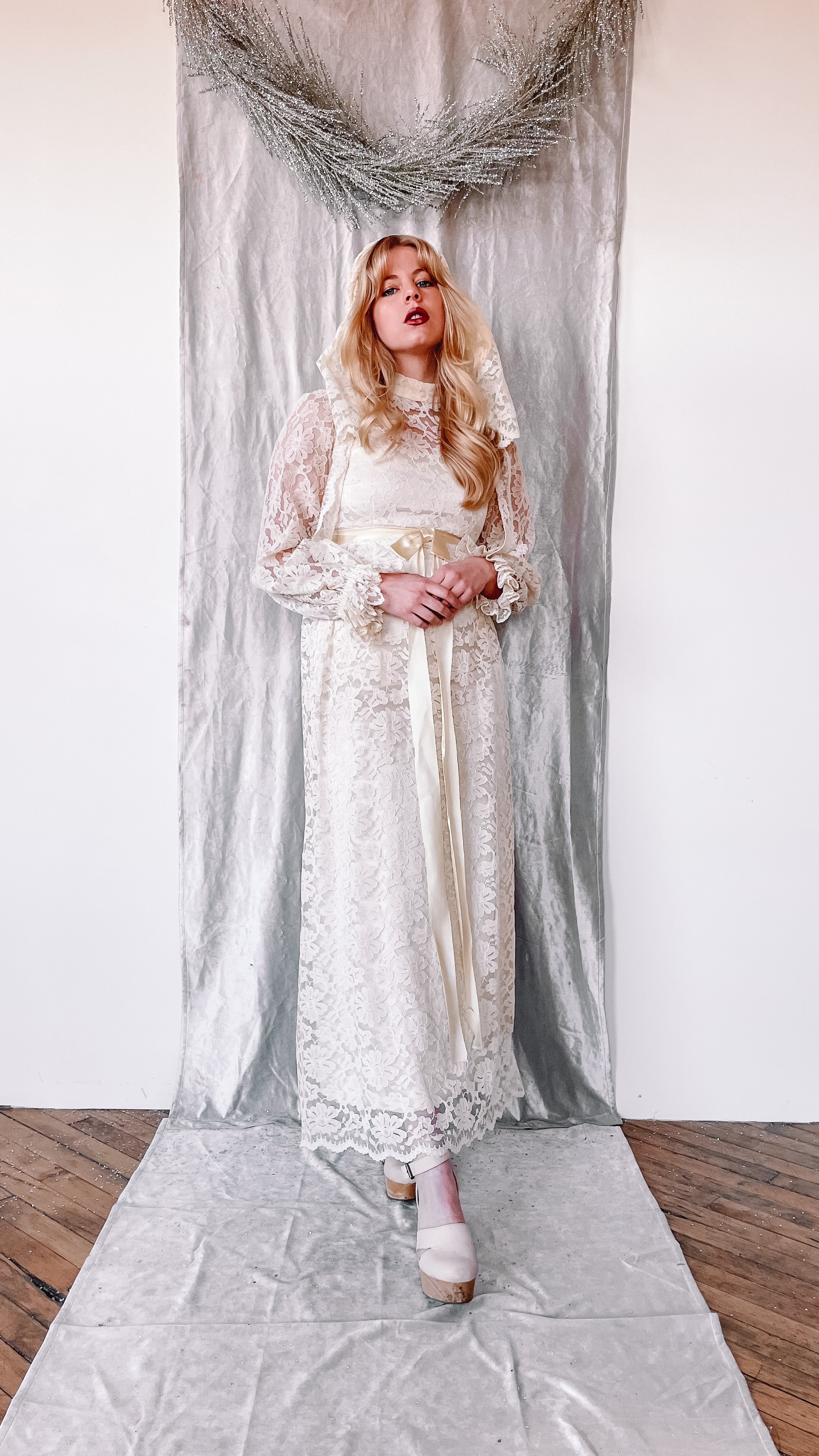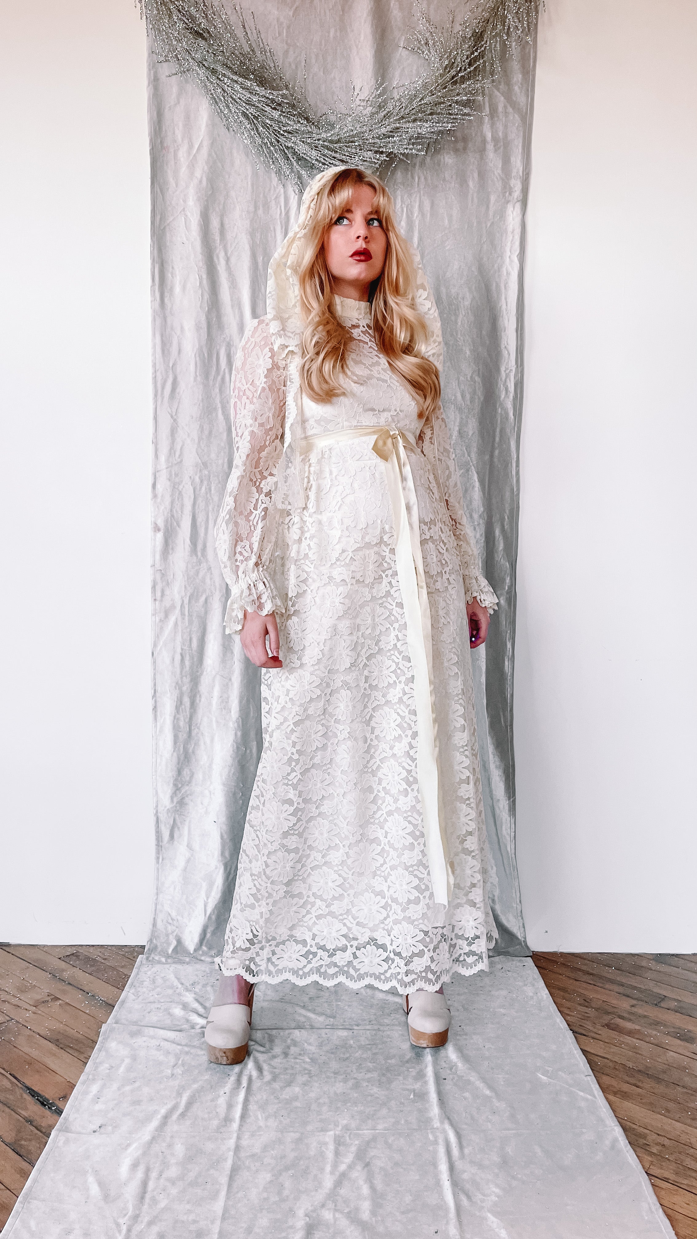 1970s Beloved high-neck lace gown, wedding dress, sz. S