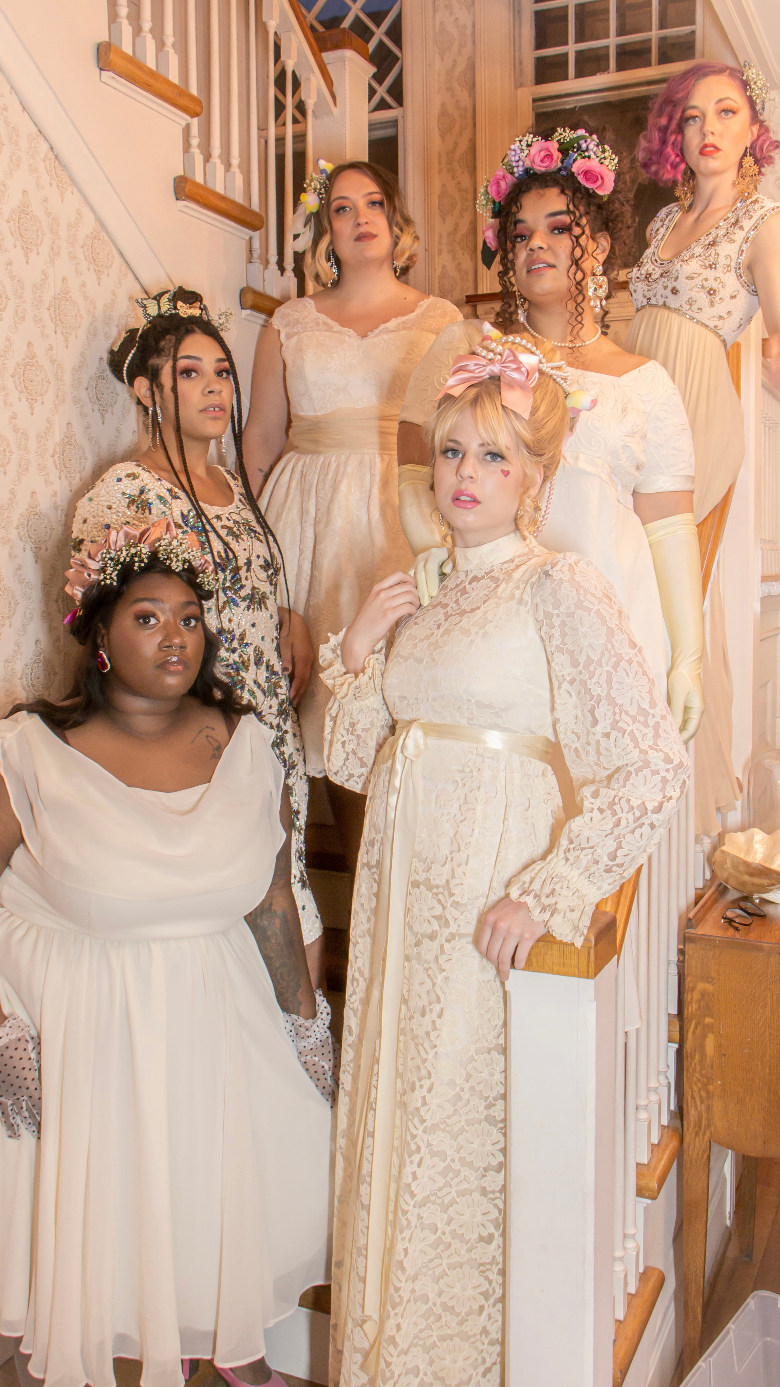 Cream-colored lace dress with high neck. Sheer, balloon sleeves with elastic at cuff. Lined. Cream satin ribbon at waist. Extra lace piece can be worn at waist like a peplum or in hair as a veil. Zipper closure in back. Hook & eye closures at collar.