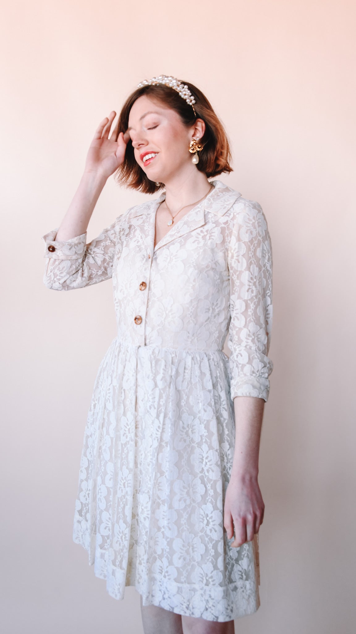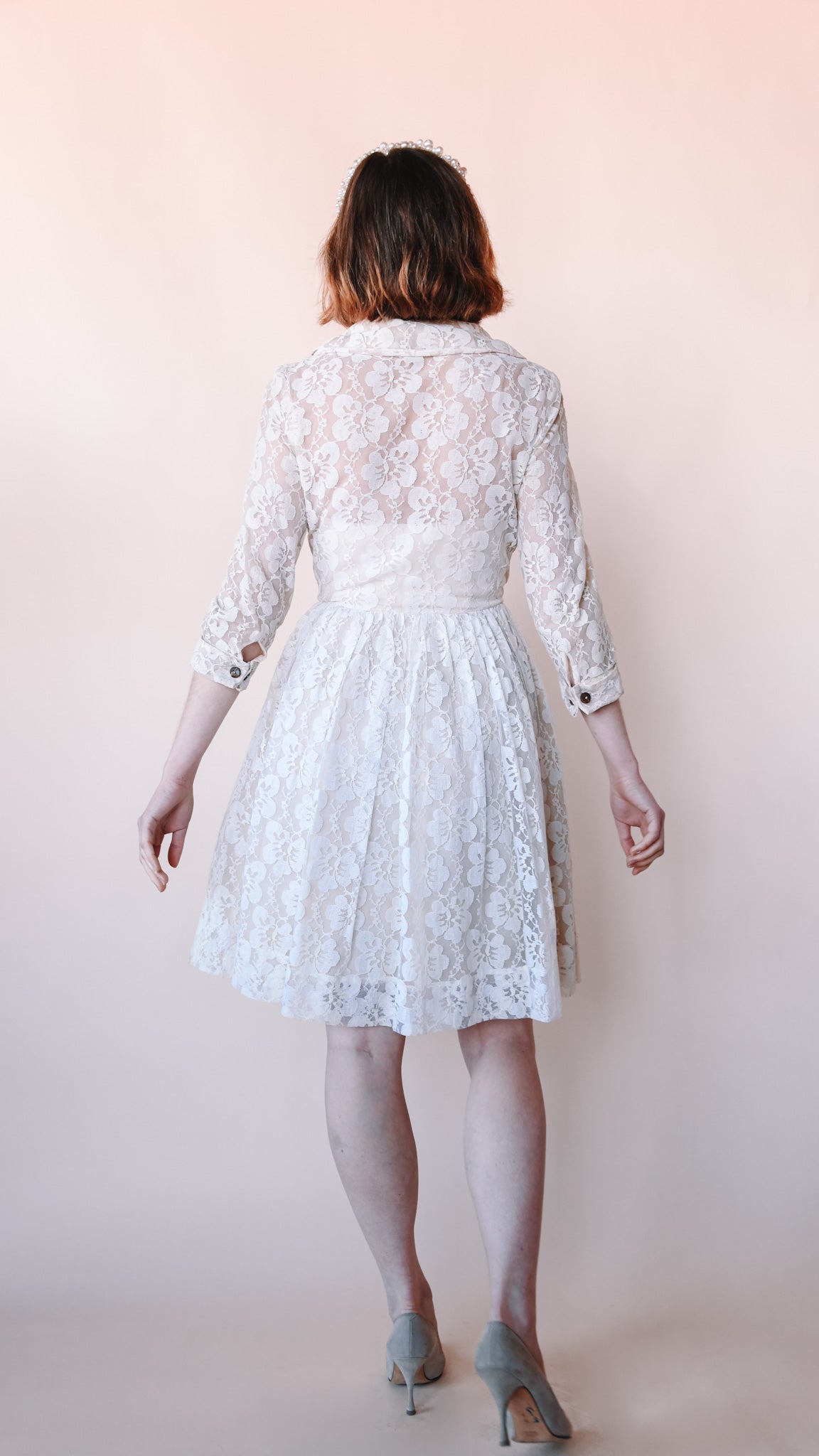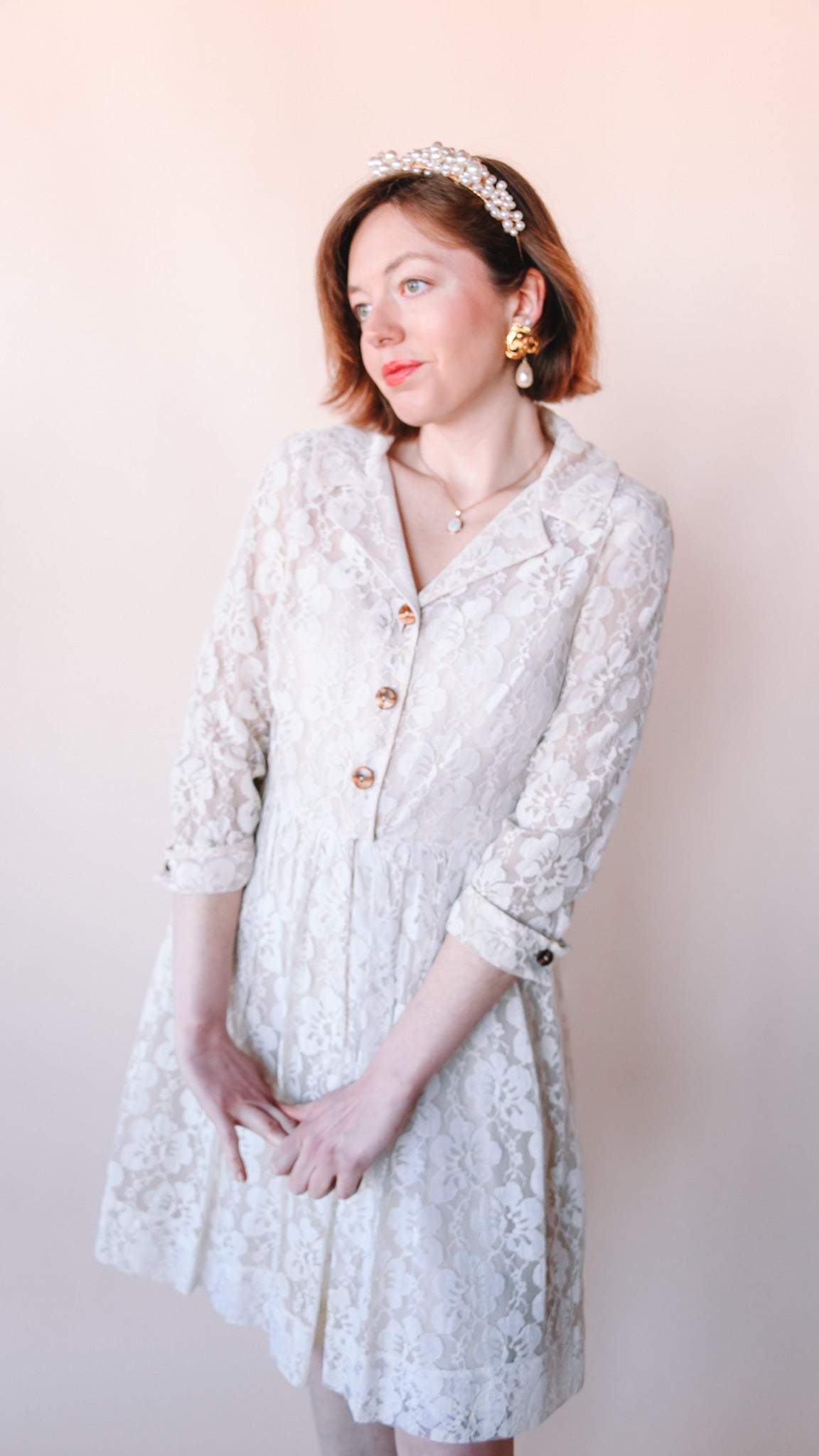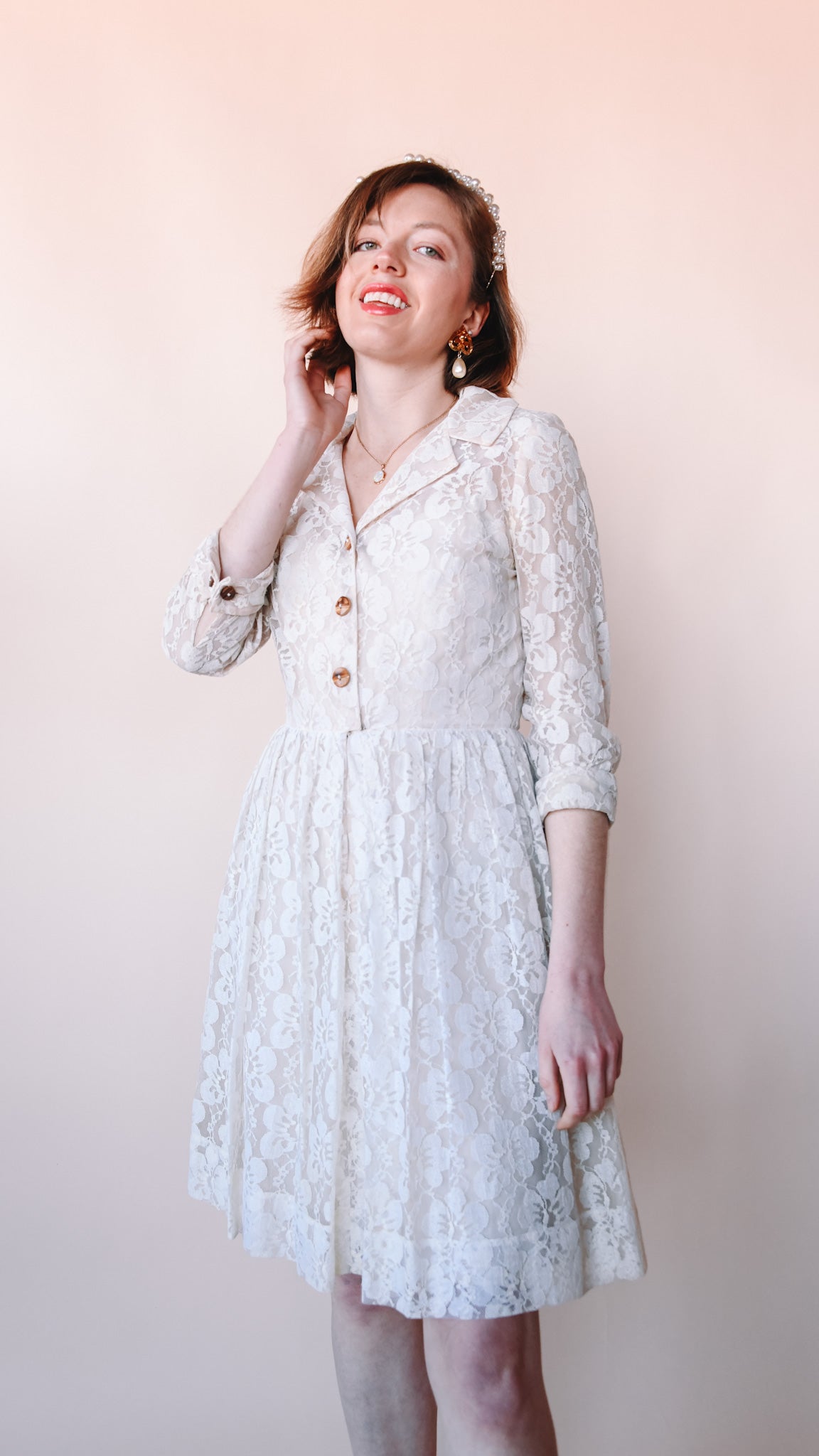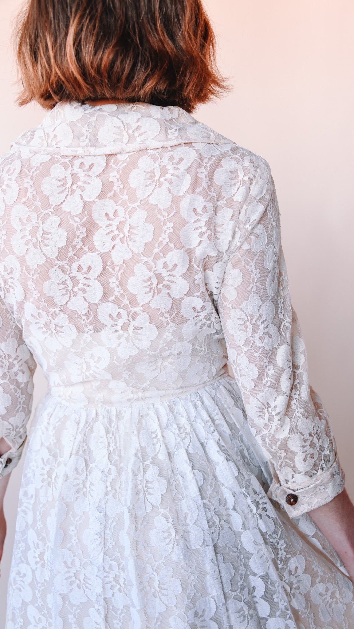 Cream lace knee-length fit-and-flare dress featuring wooden buttons. Collared. French cuffs. Lined. Slip zips up the front.