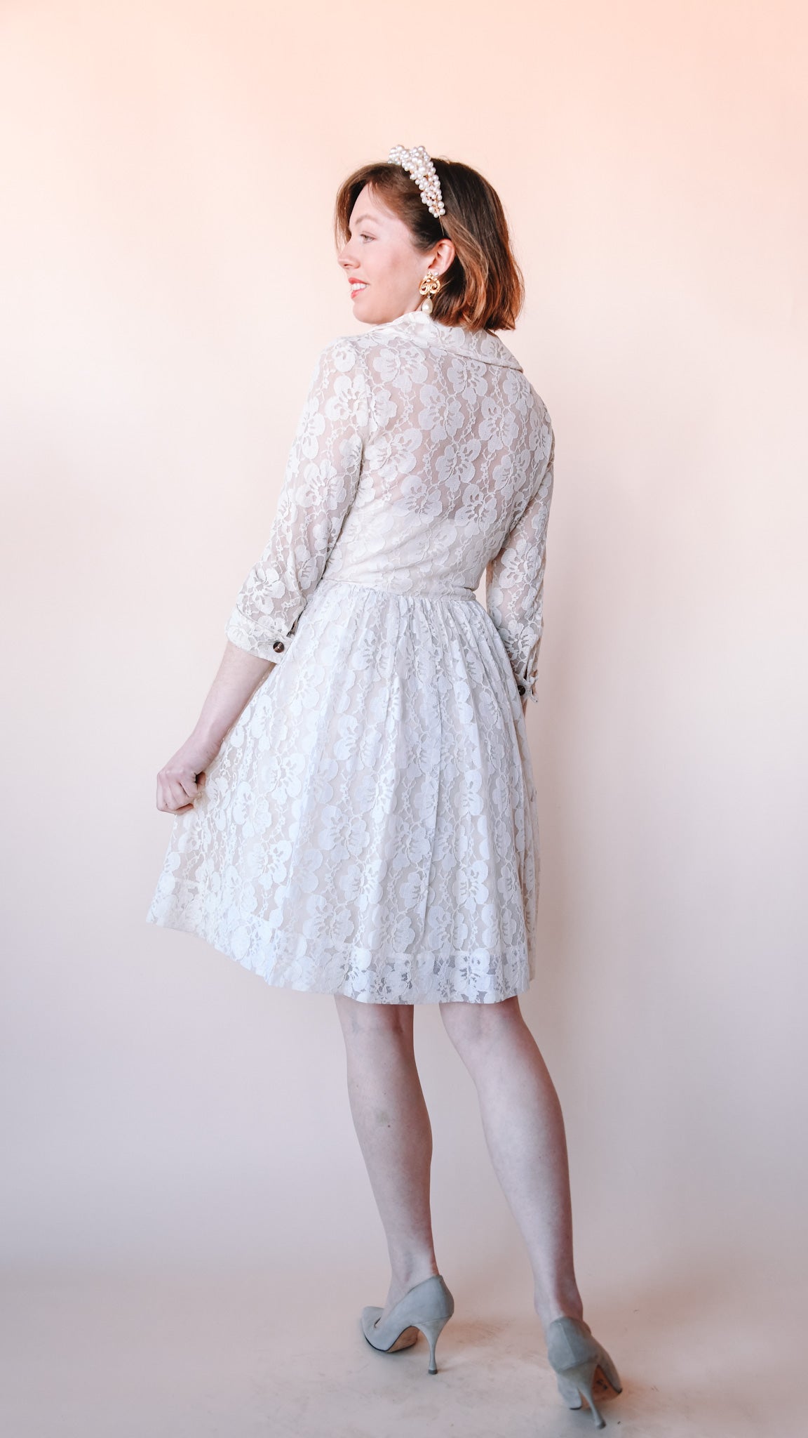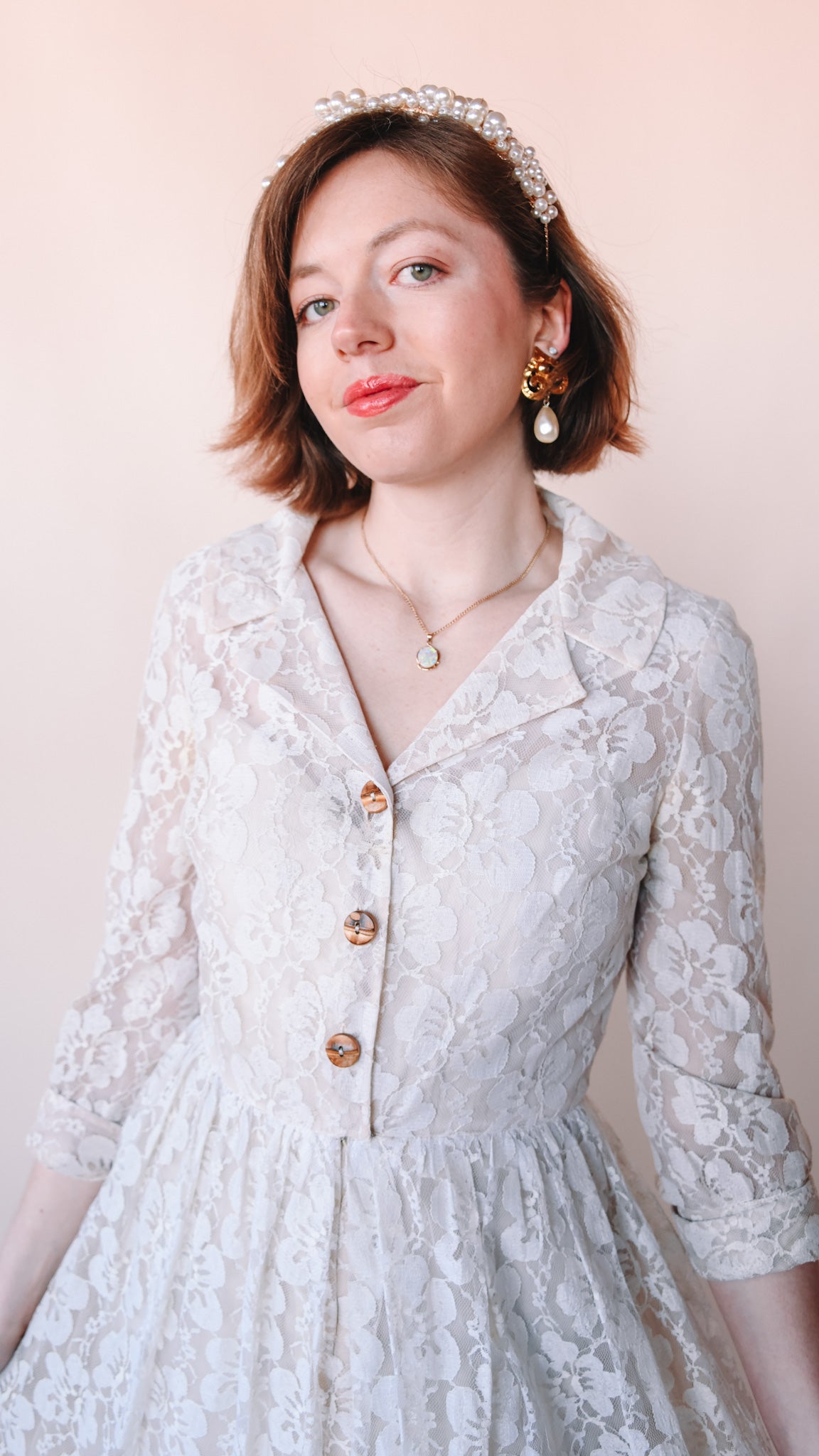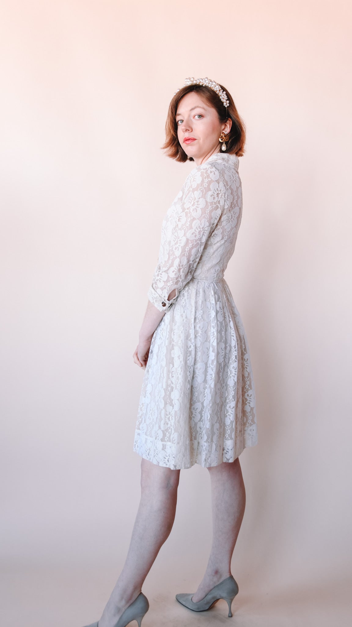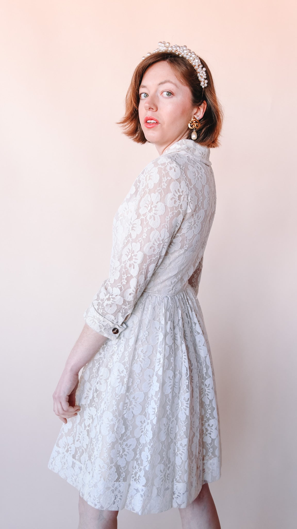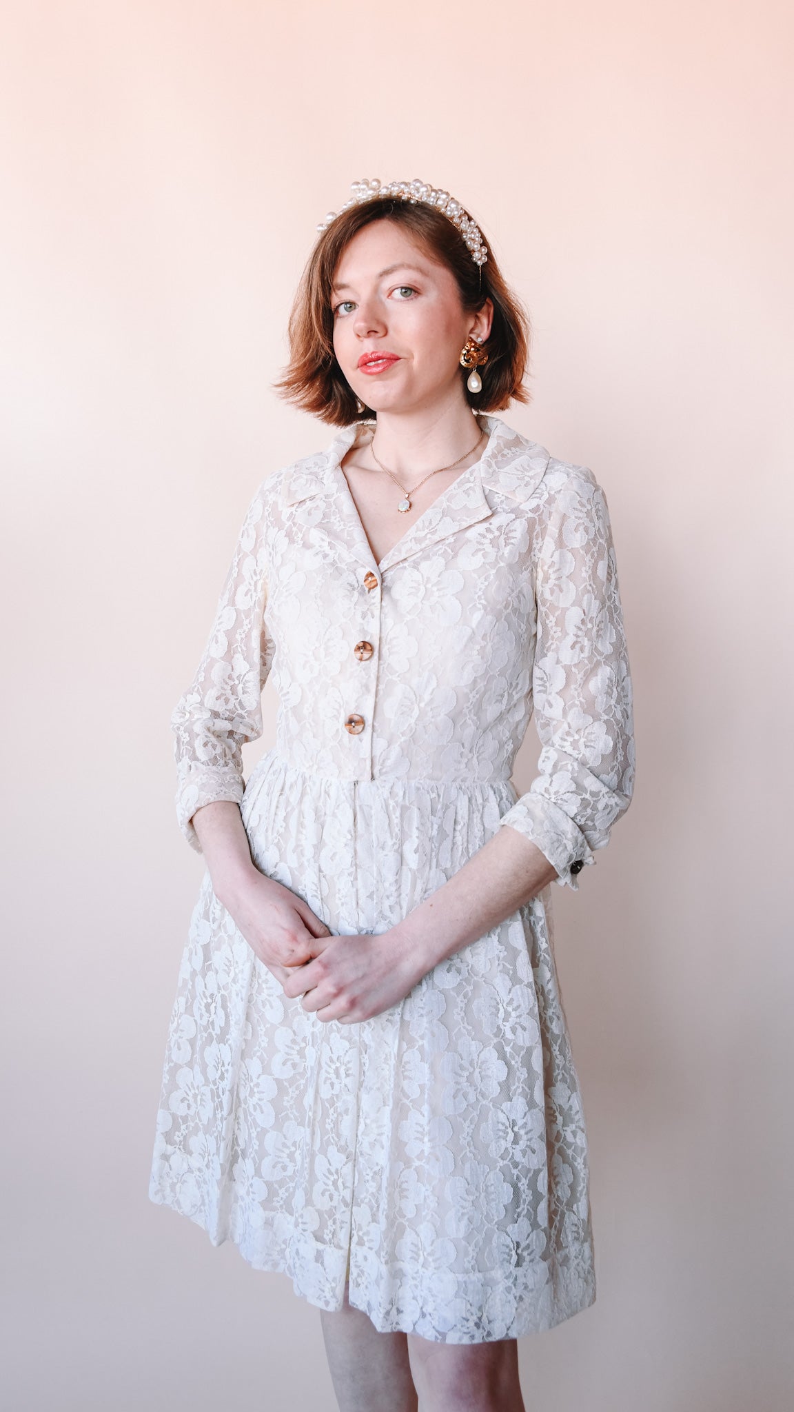 Cream lace knee-length fit-and-flare dress featuring wooden buttons. Collared. French cuffs. Lined. Slip zips up the front.