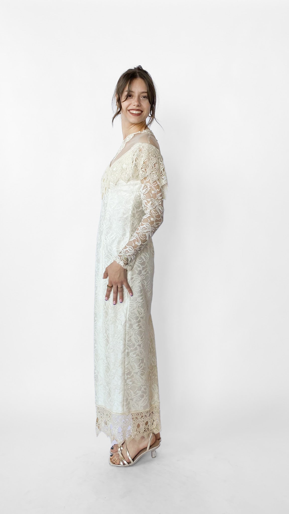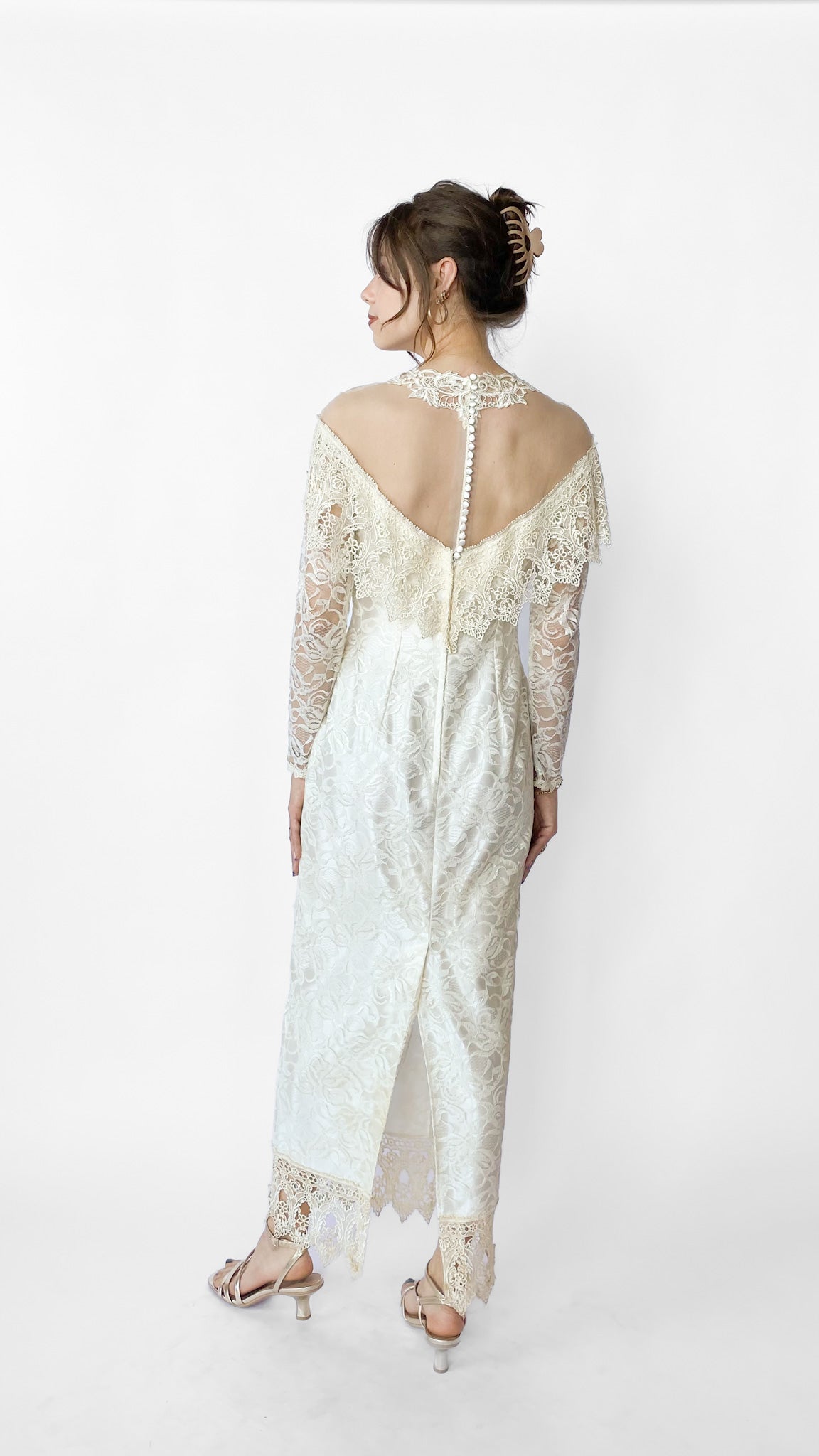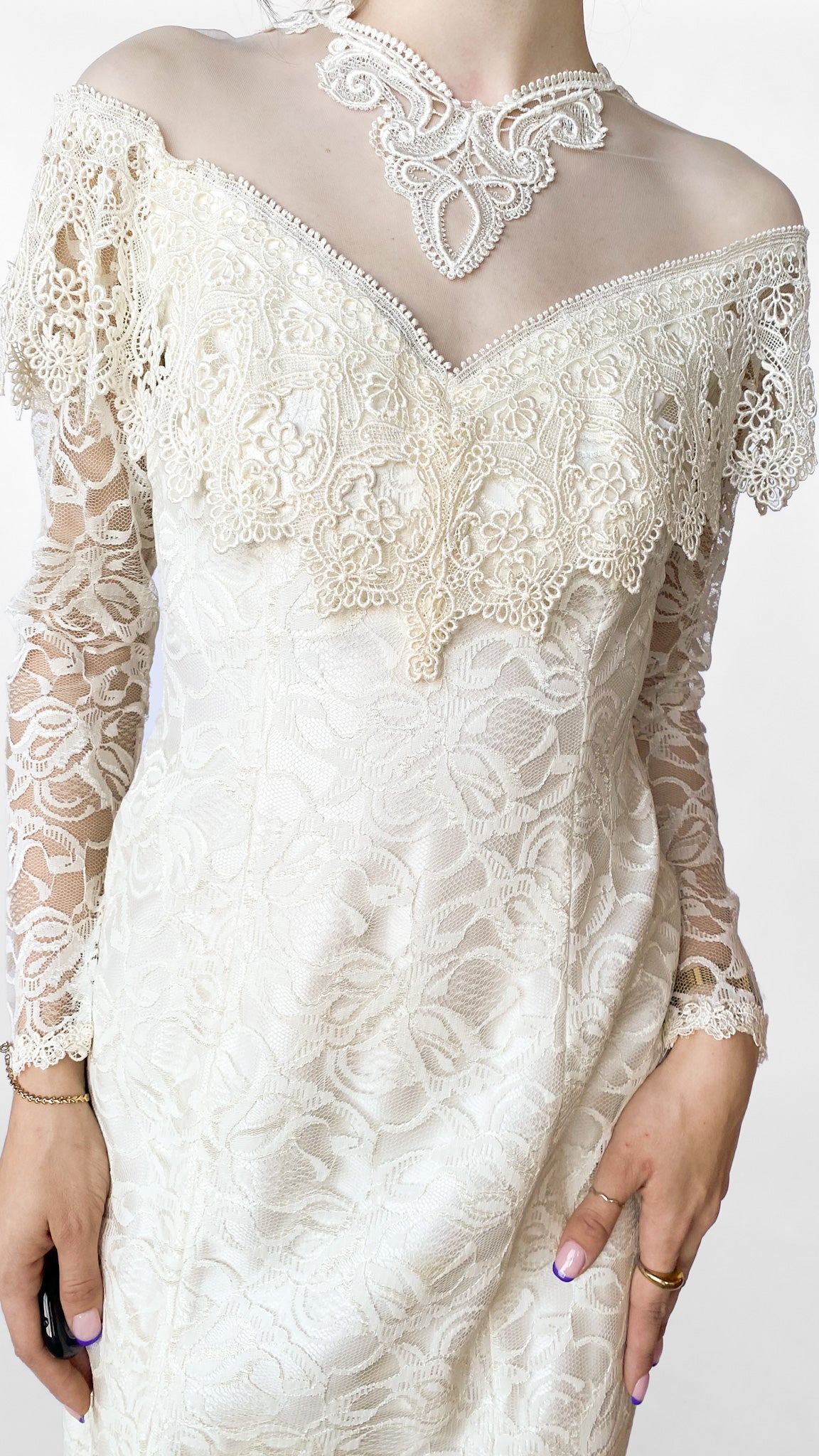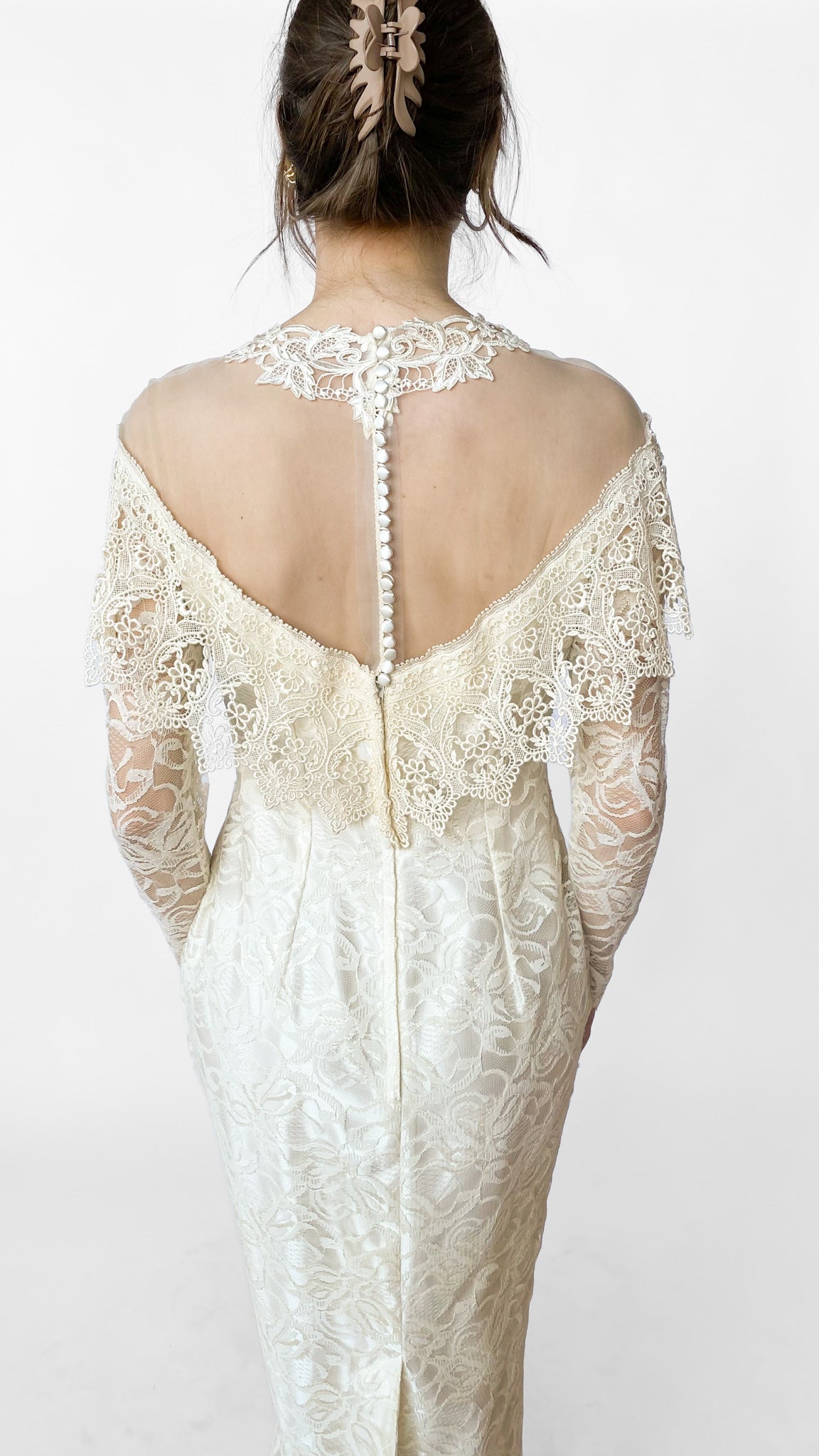 Description: Long sleeve ivory lace wedding dress with gorgeous satin buttons going up back. The dress has a more detailed lace overlay that sits on the collarbone and hem of dress. Part of neck is mesh with lace design around the opening.