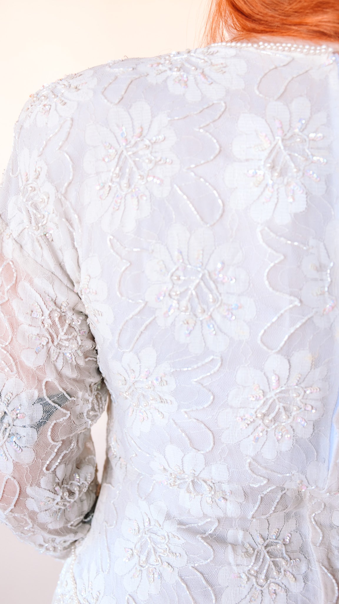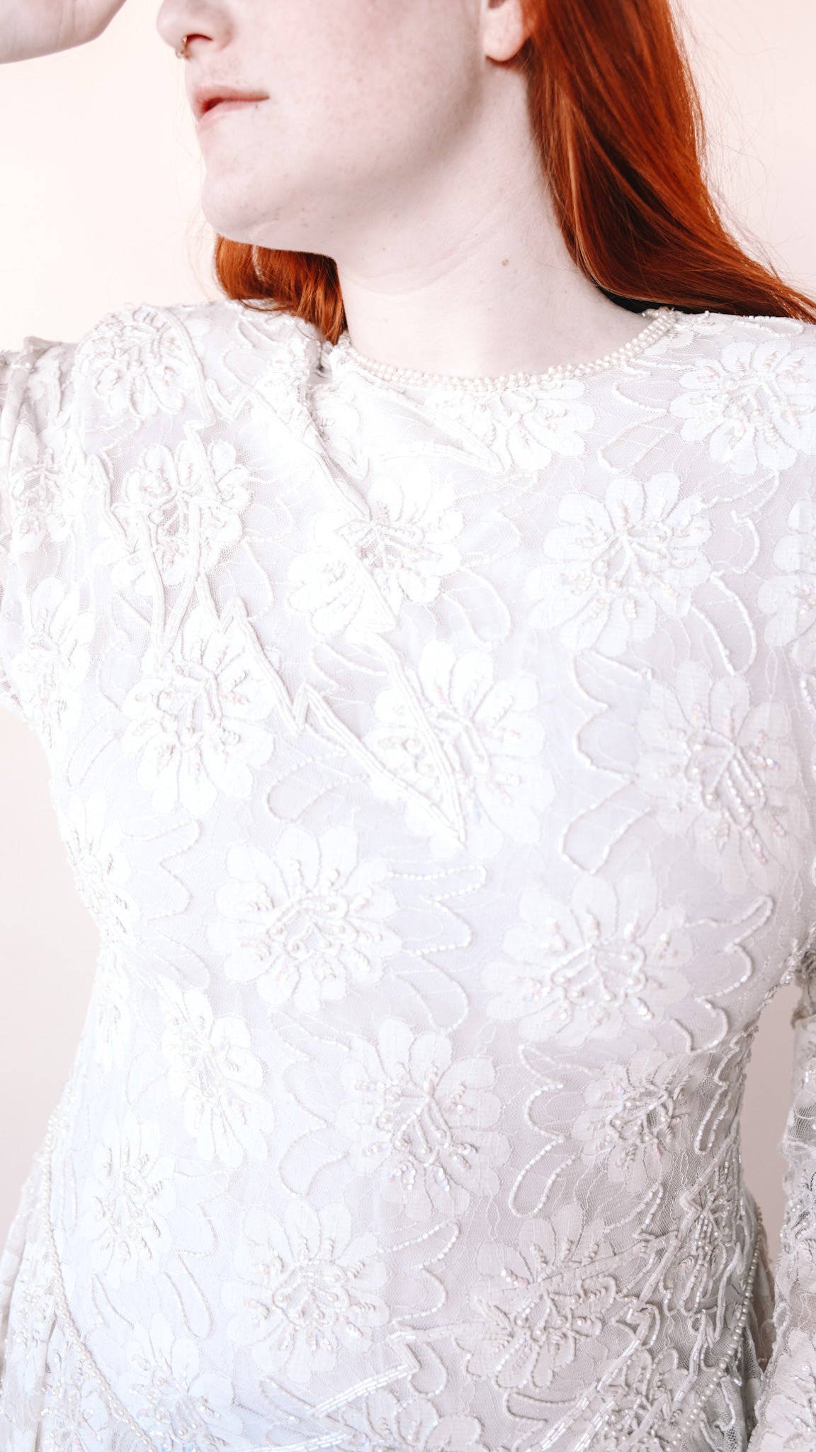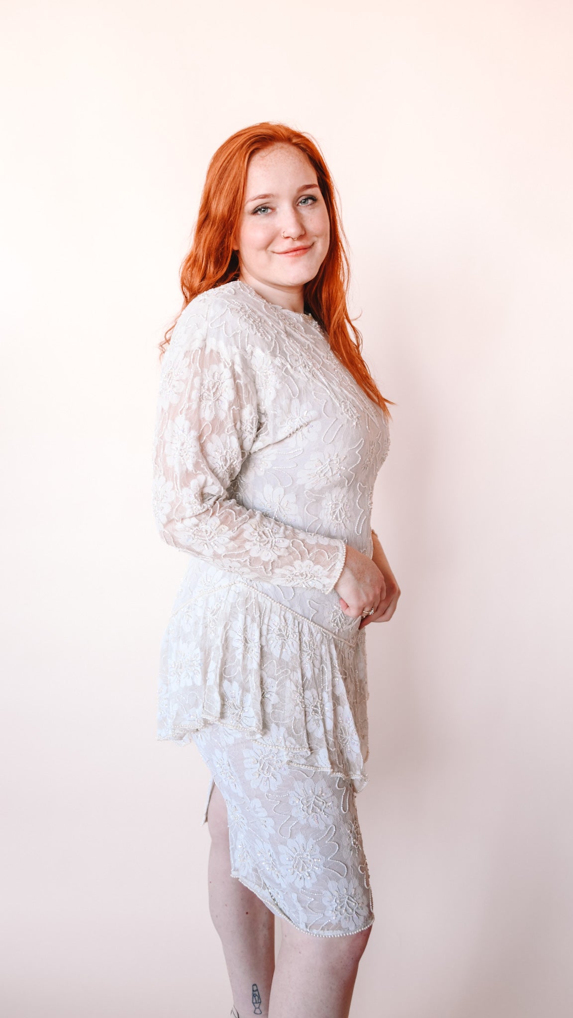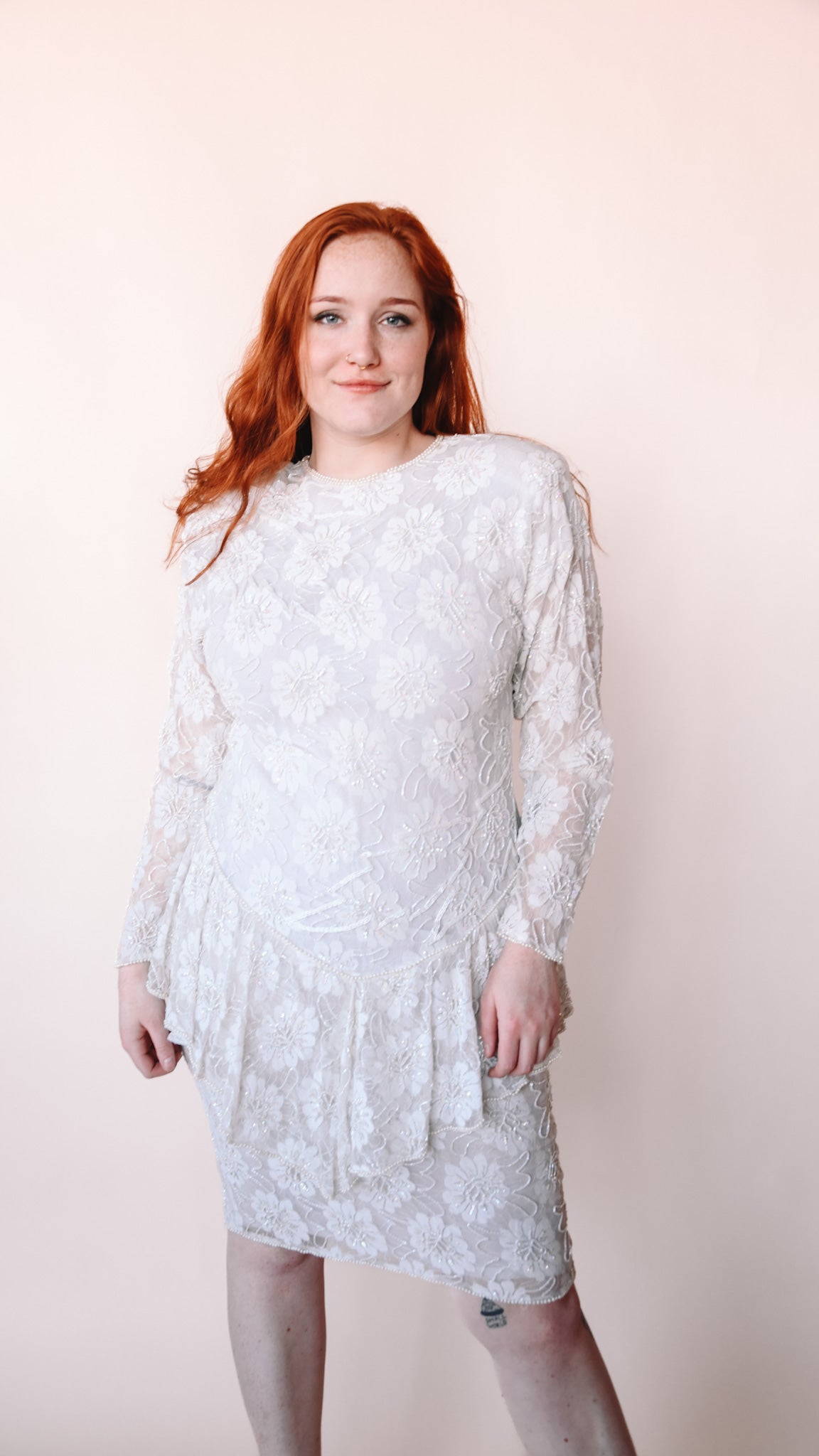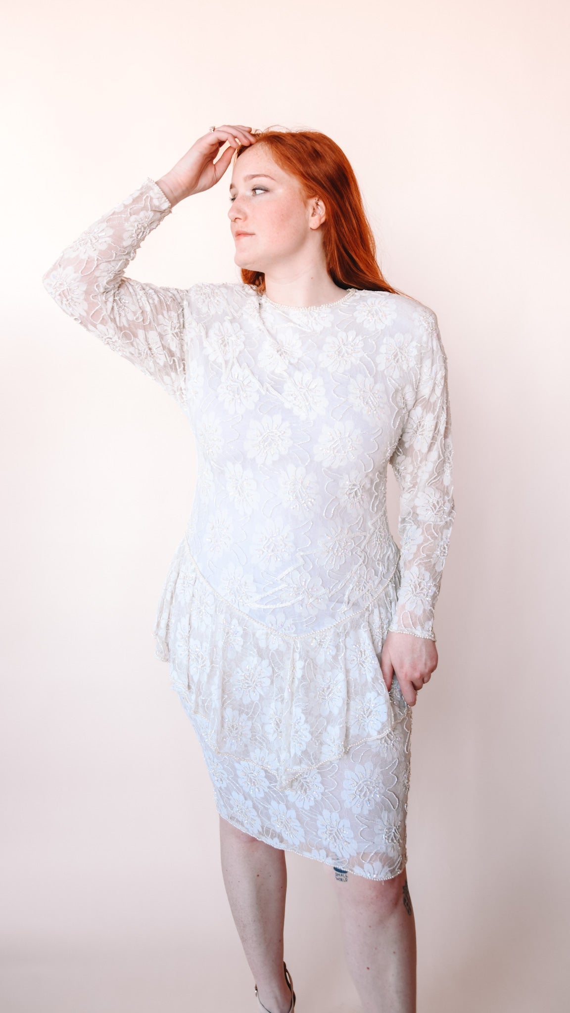 White mid-length lace dress with long sleeves. Drop waist. Peplum detail at the hip. Beads and sequins in a floral pattern. Shoulder pads. Lined. Zips up the back.