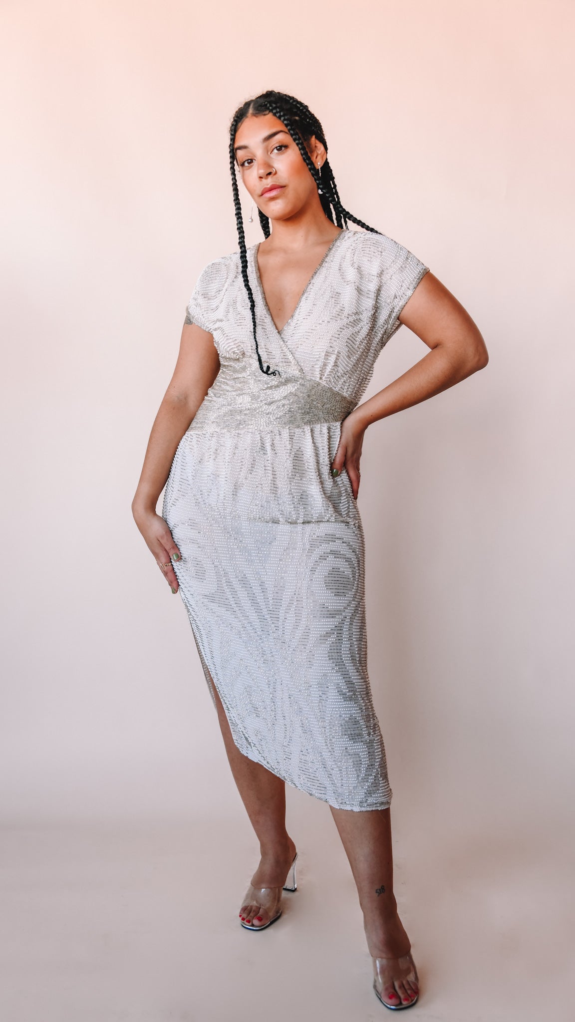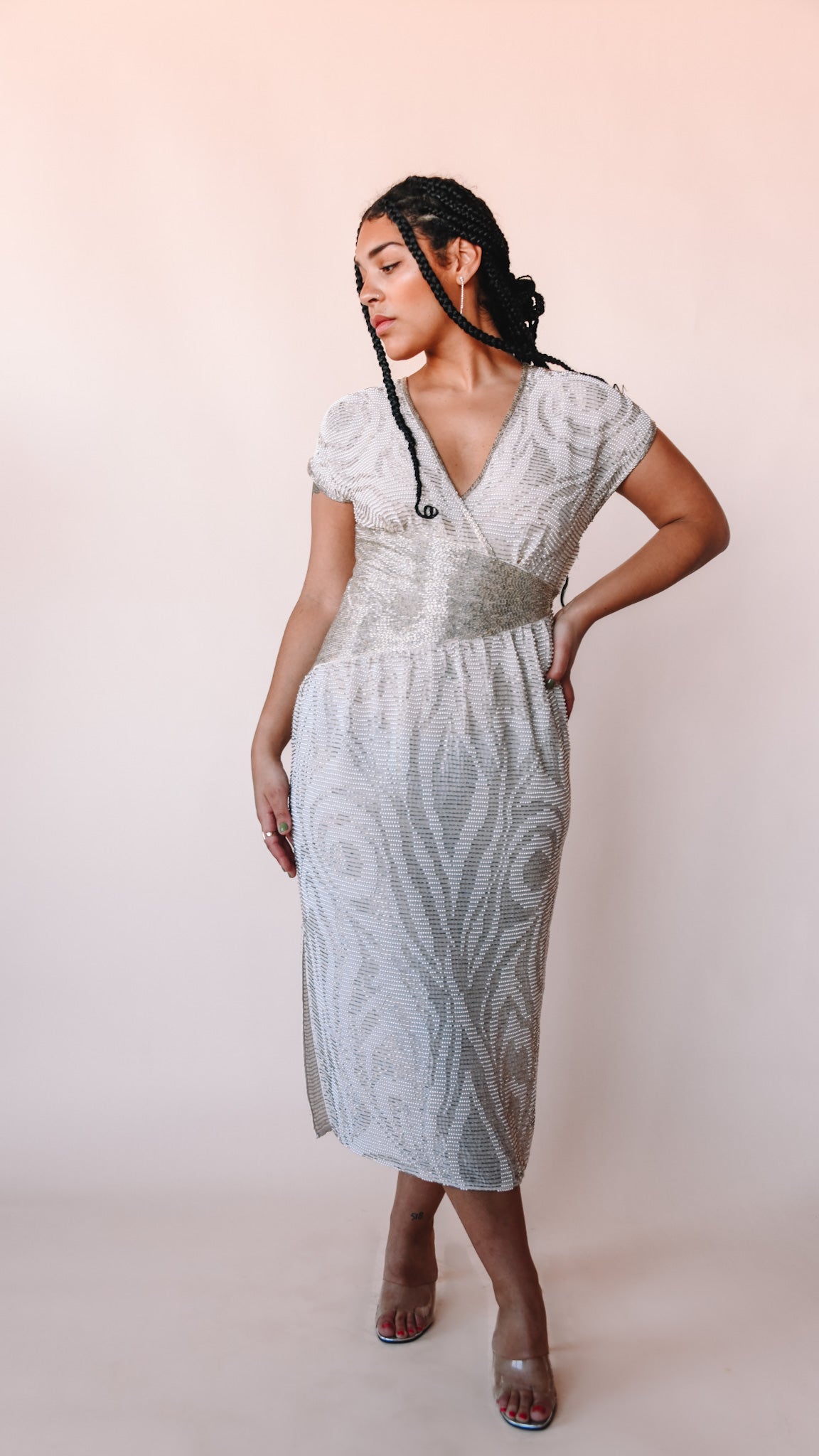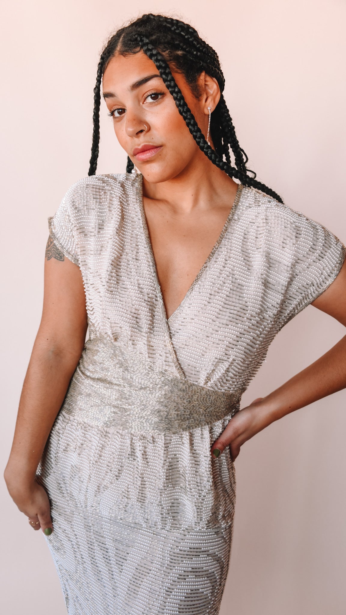 Description: Beaded pearl dress with wavy pattern; faux wrap dress style with deep v neckline & asymmetrical beaded waistband. Two slits in either side of hem, side zipper. Drapes so beautifully!