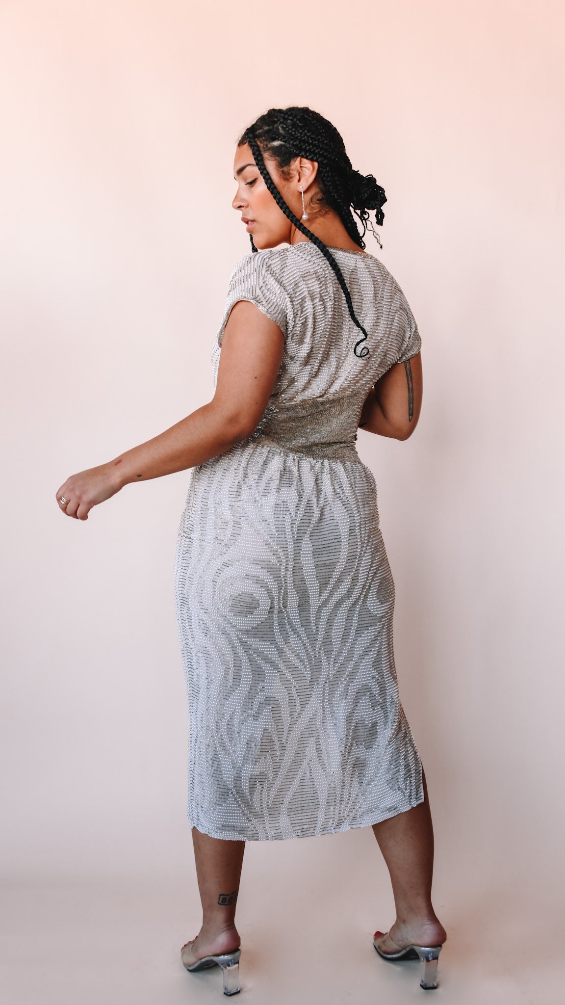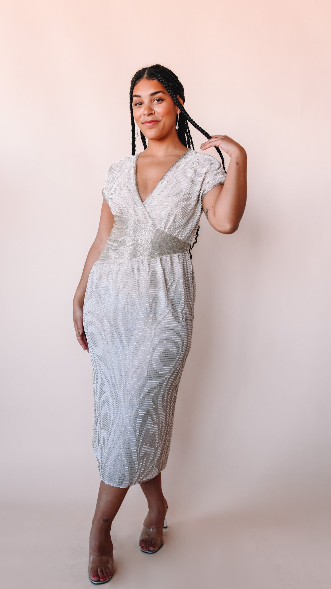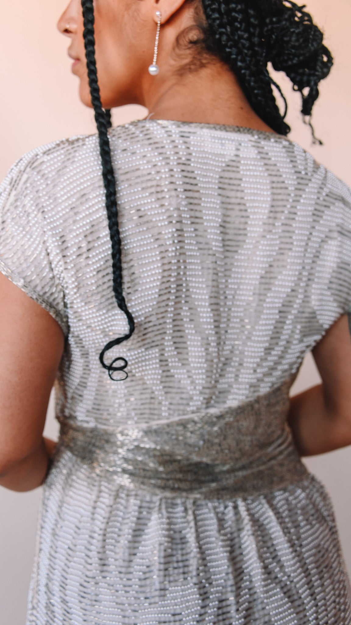 Description: Beaded pearl dress with wavy pattern; faux wrap dress style with deep v neckline & asymmetrical beaded waistband. Two slits in either side of hem, side zipper. Drapes so beautifully!