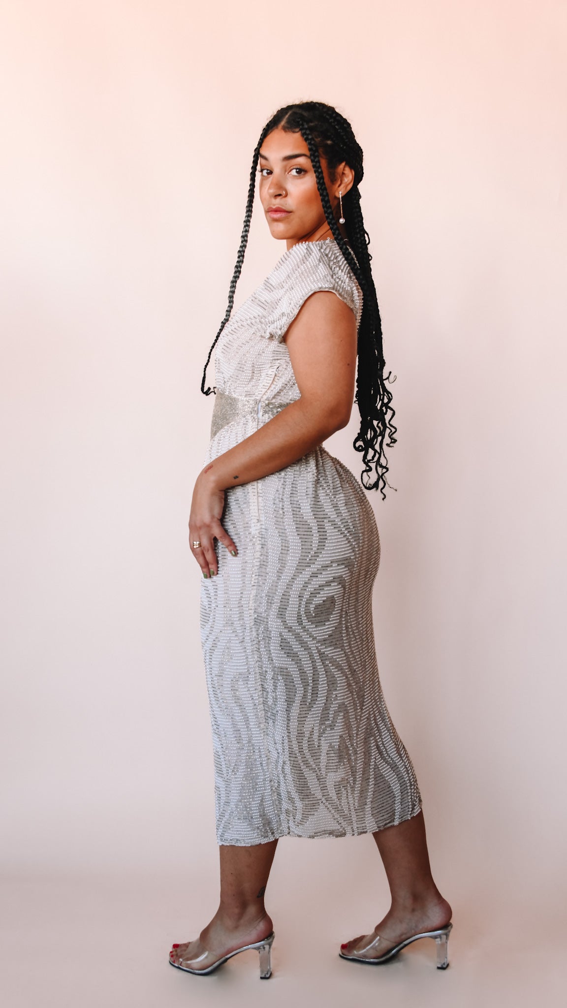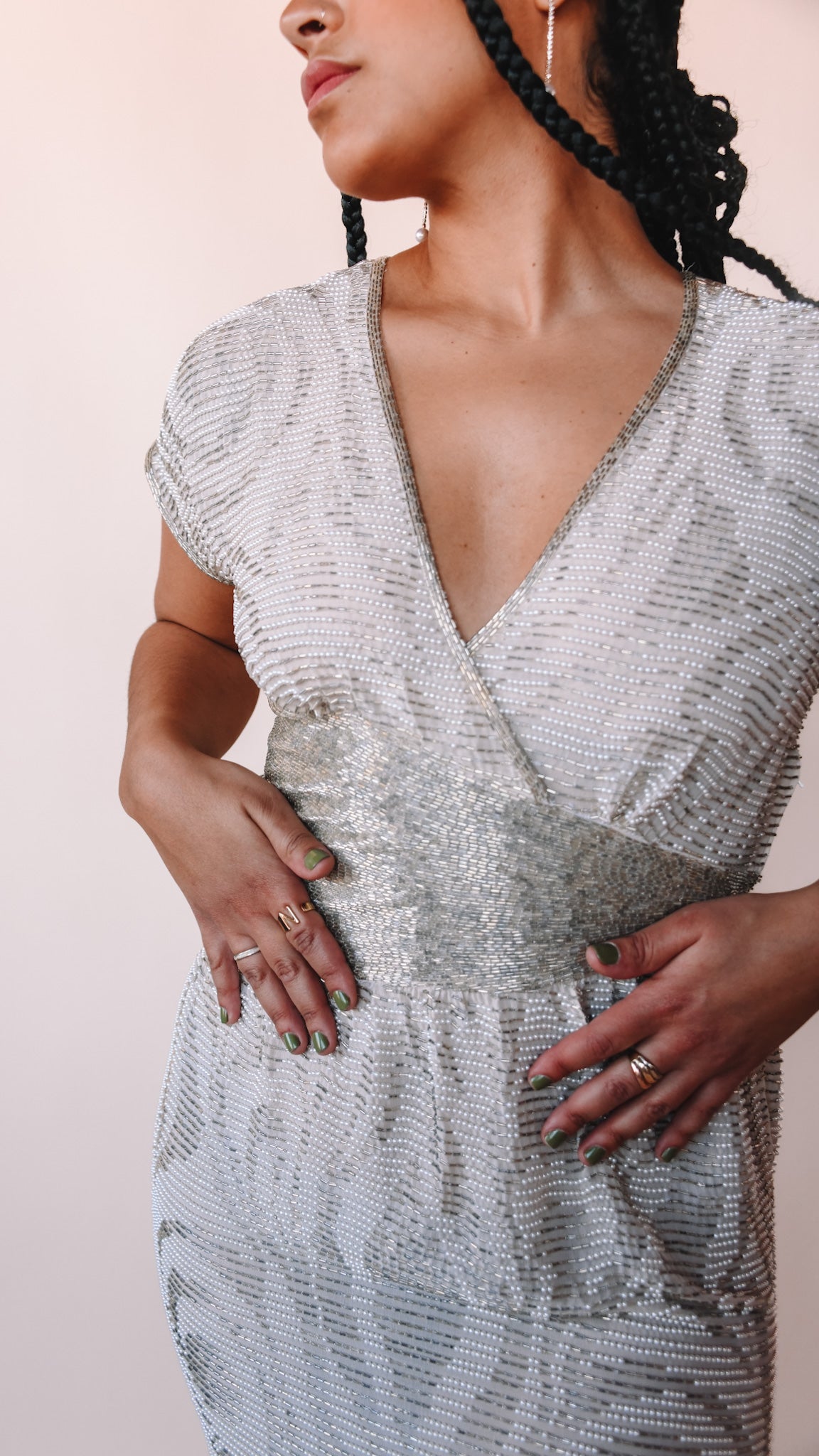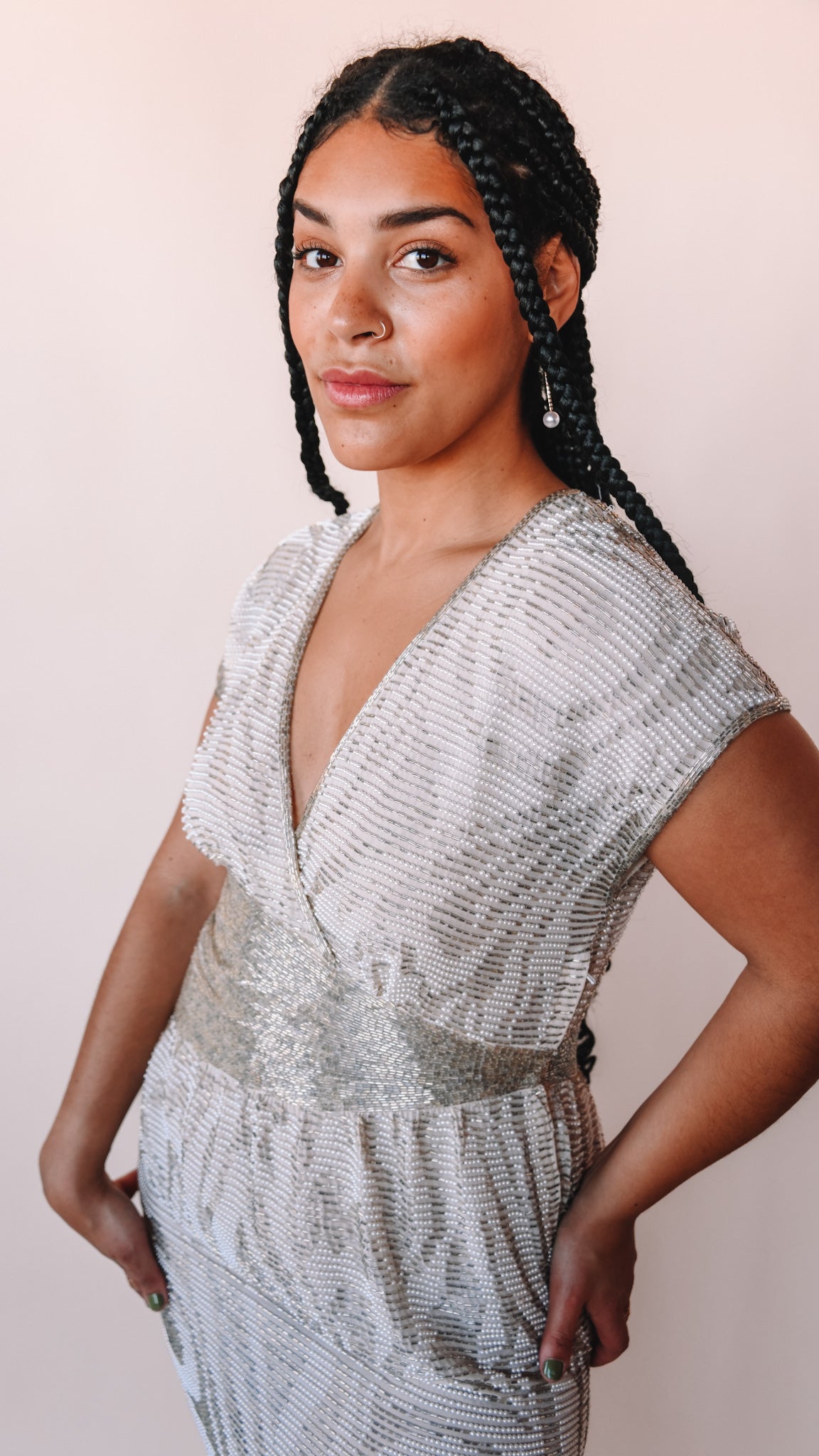 1980s Silver Beaded Art Deco Wedding Dress, sz. L