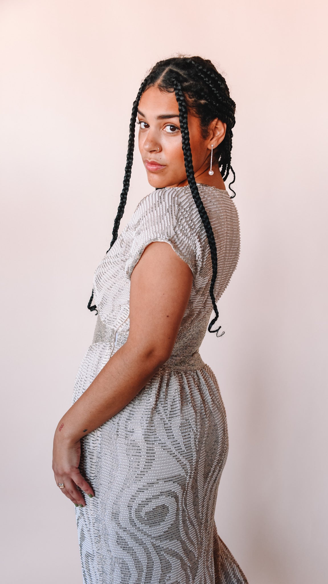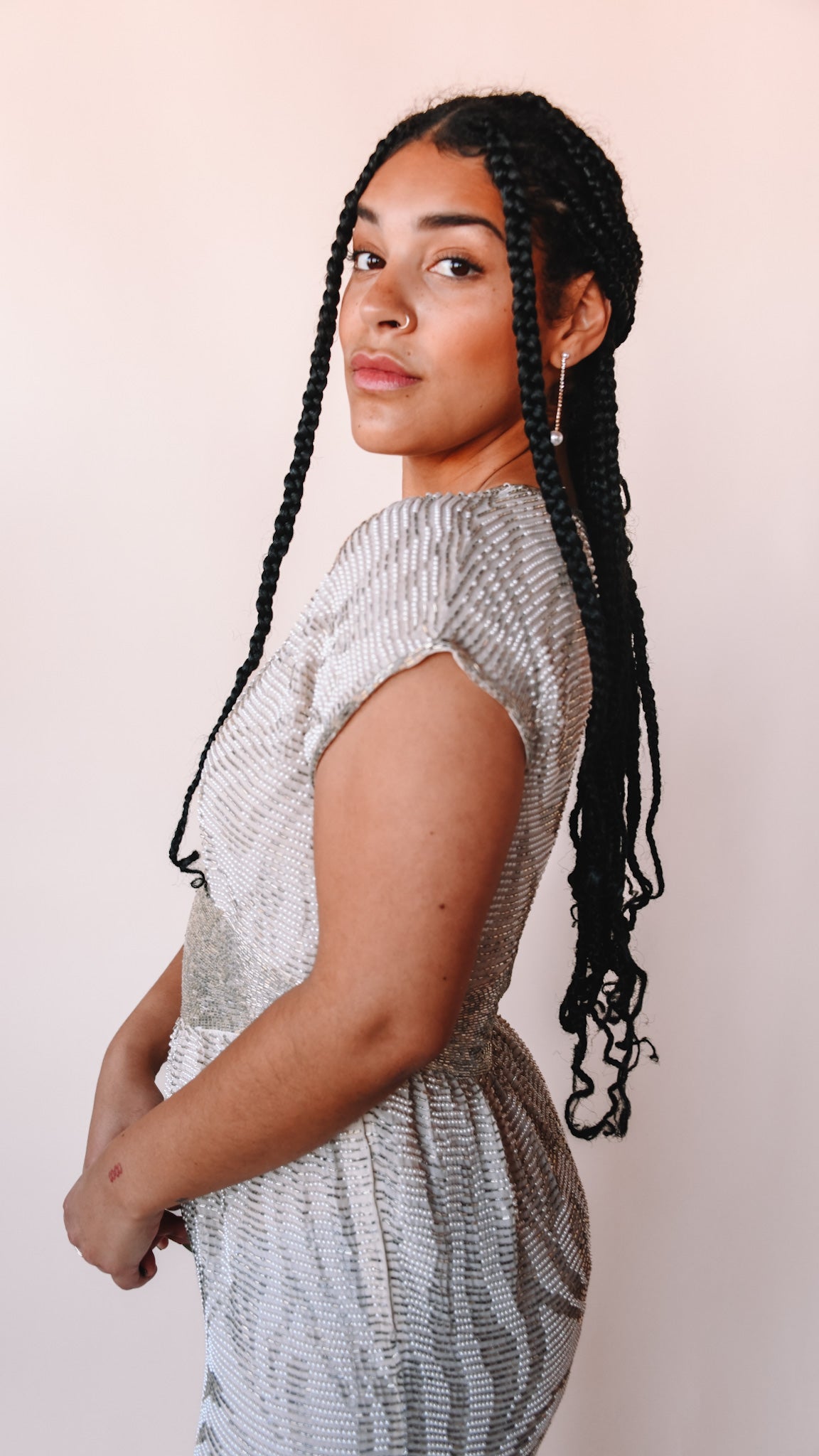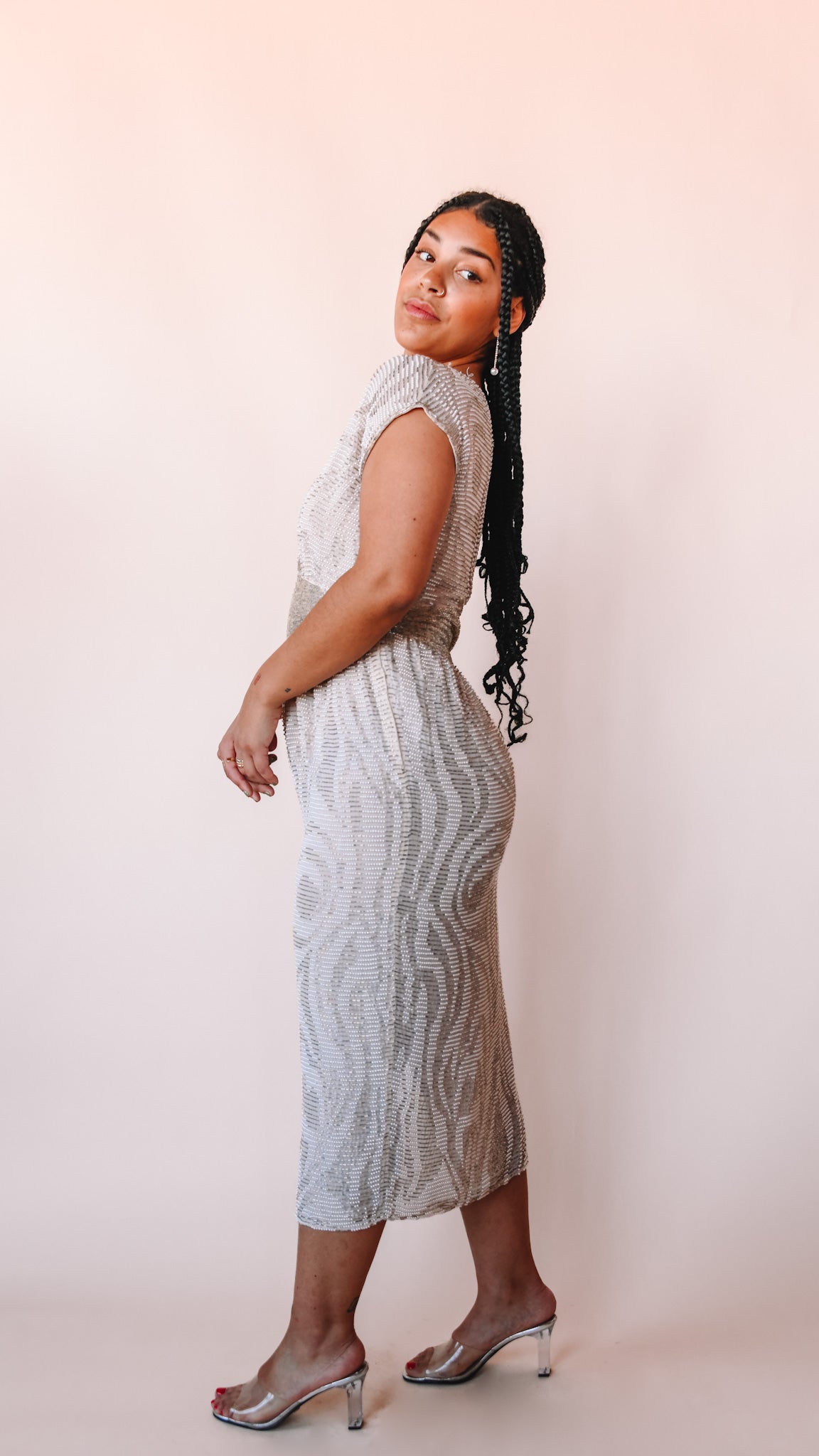 1980s Silver Beaded Art Deco Wedding Dress, sz. L