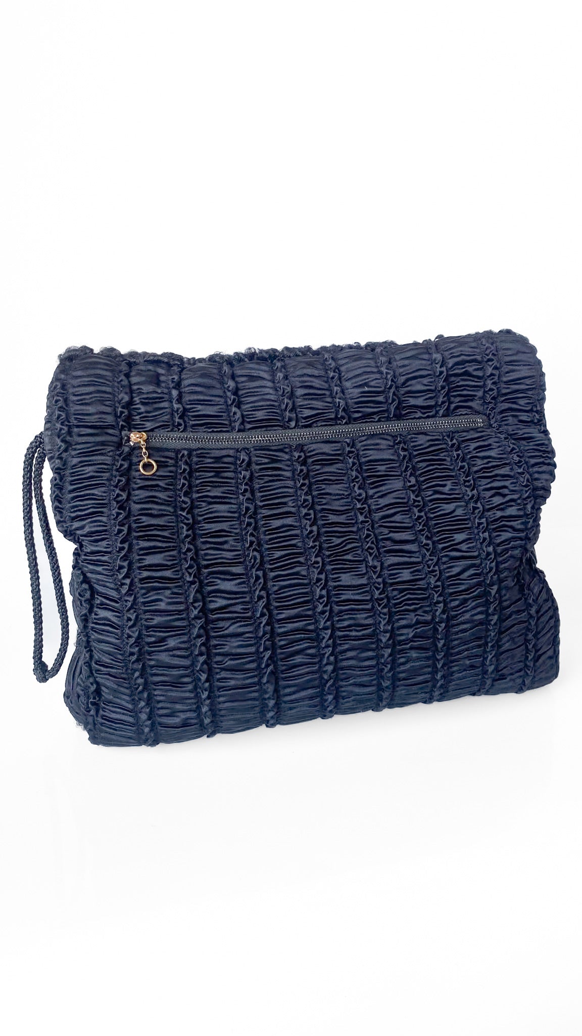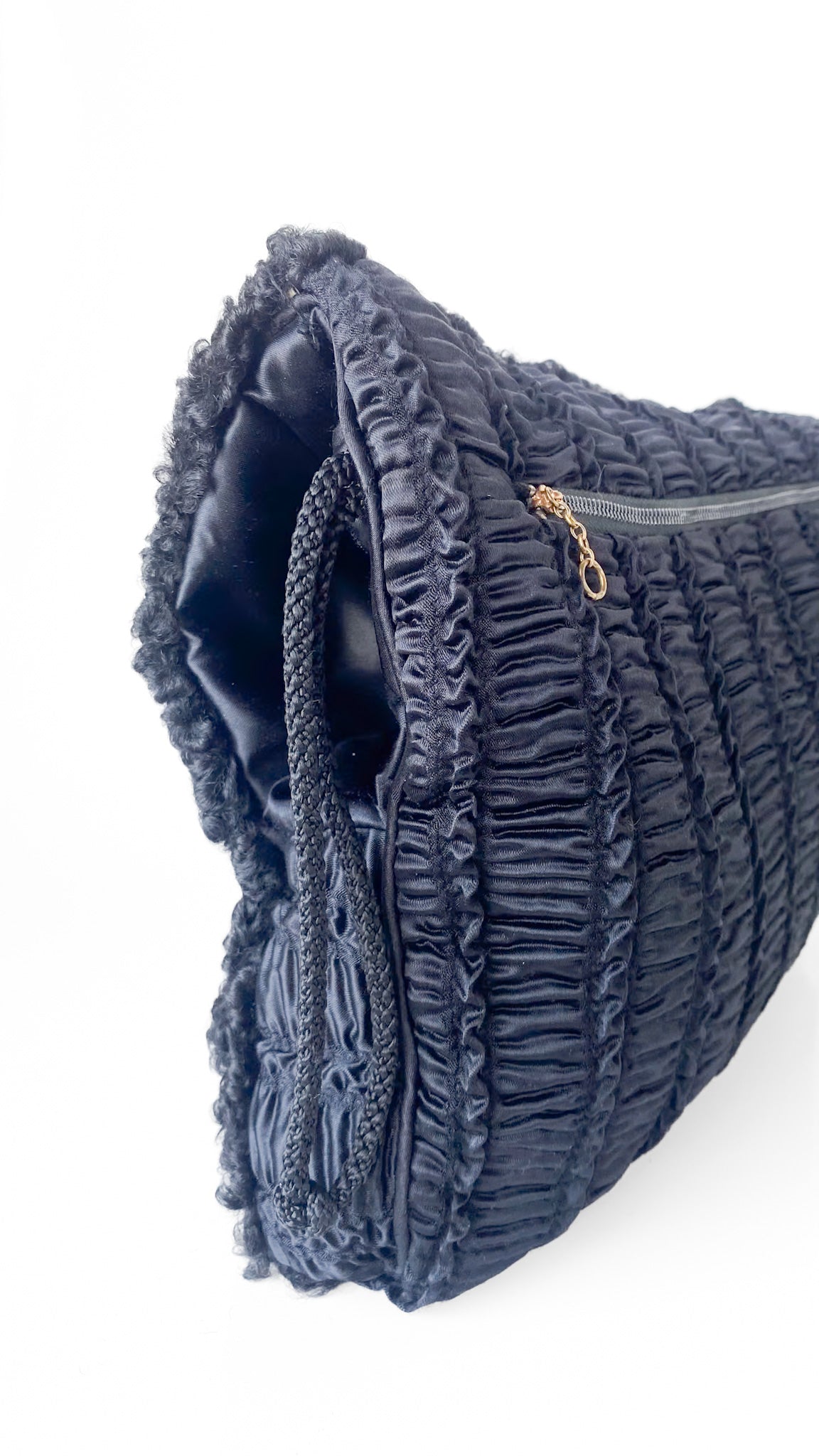 Description: Black muff purse with Persian lamb exterior. Openings on the sides for hands. Satin lining. Braided strap handle. Zippered pouch on the backside.