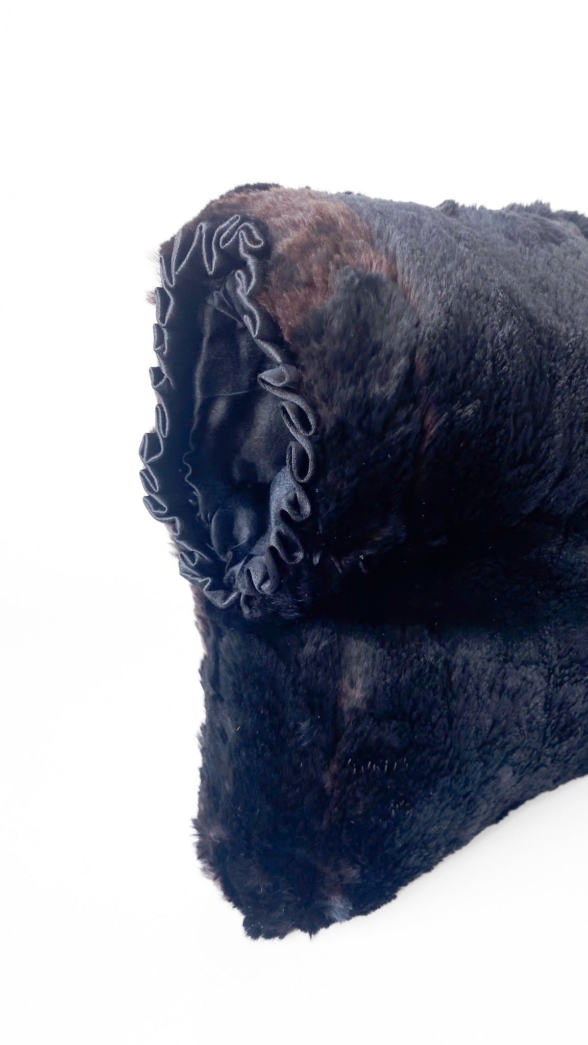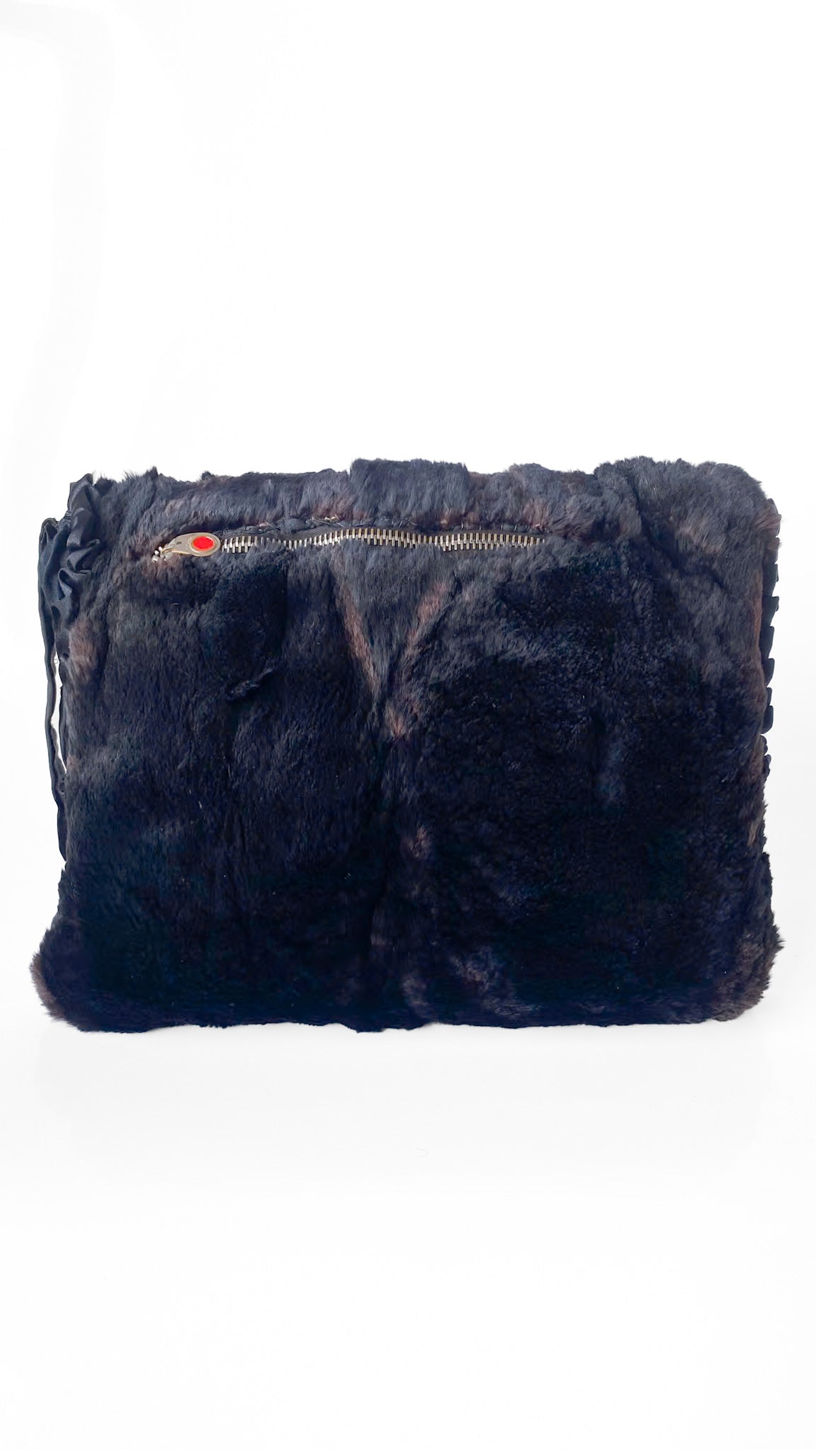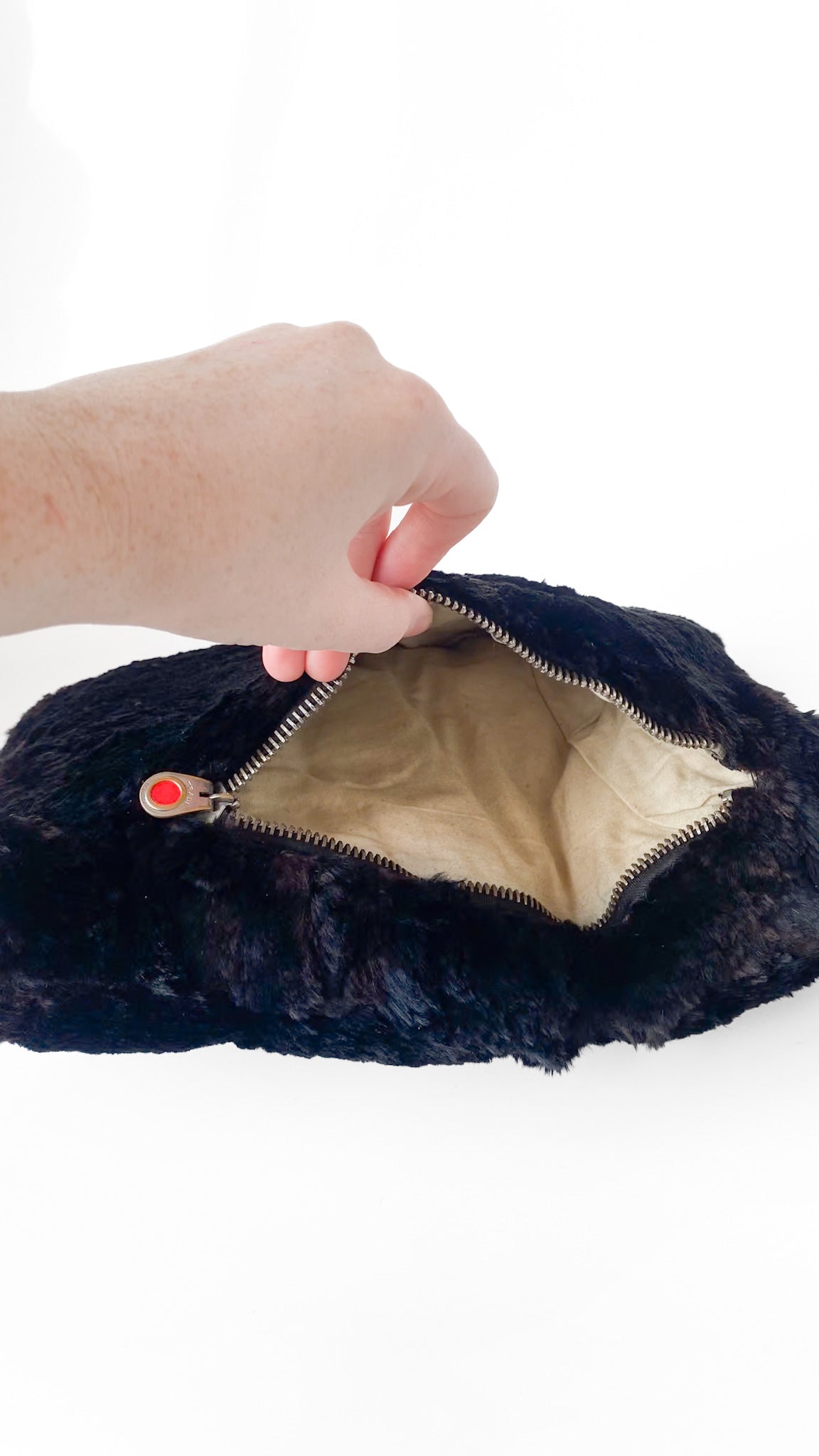 Description: Black muff purse with fur exterior. Openings on sides for hands. Satin lining. Small fabric handle on side. Zippered pouch on the backside.