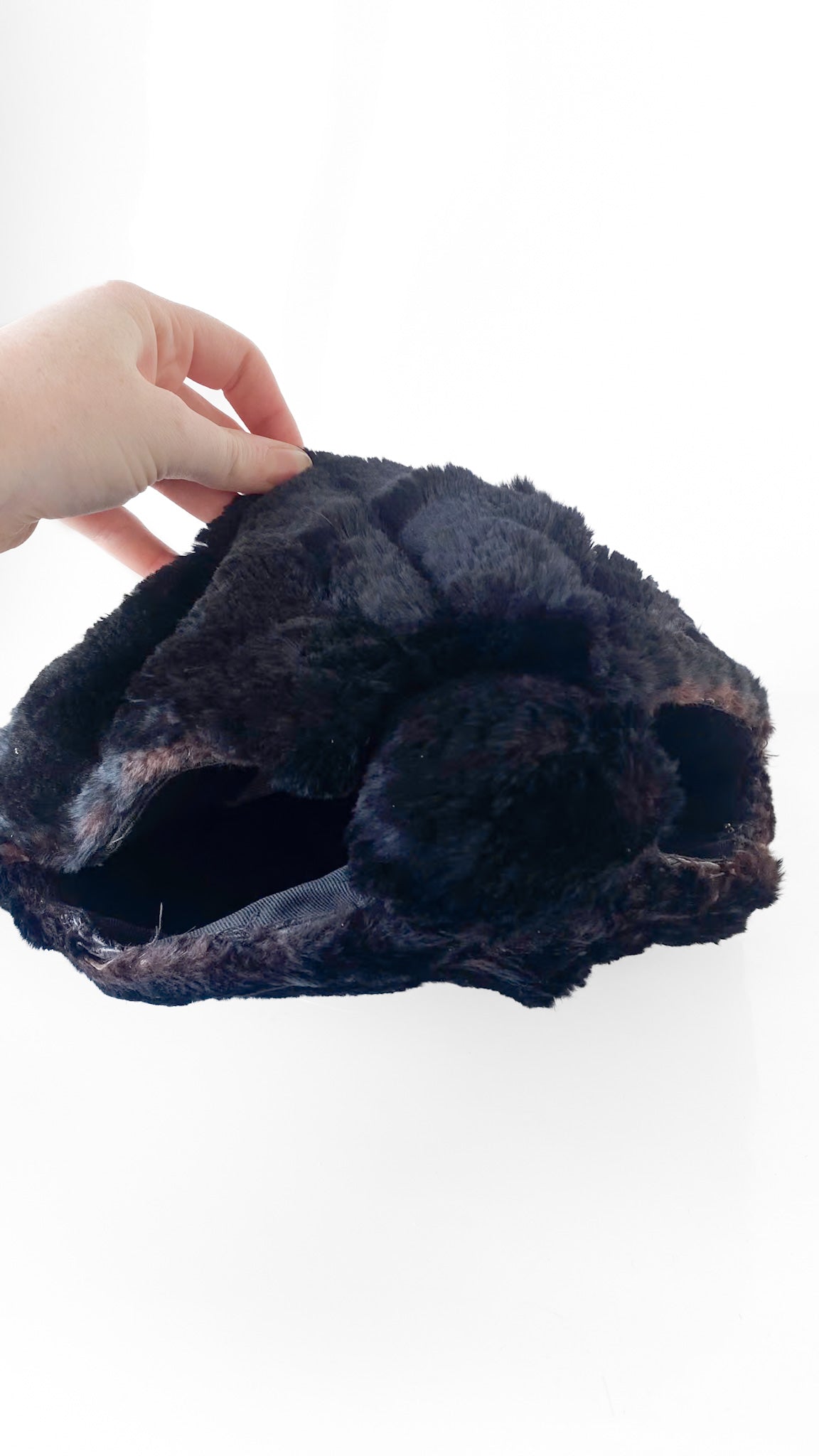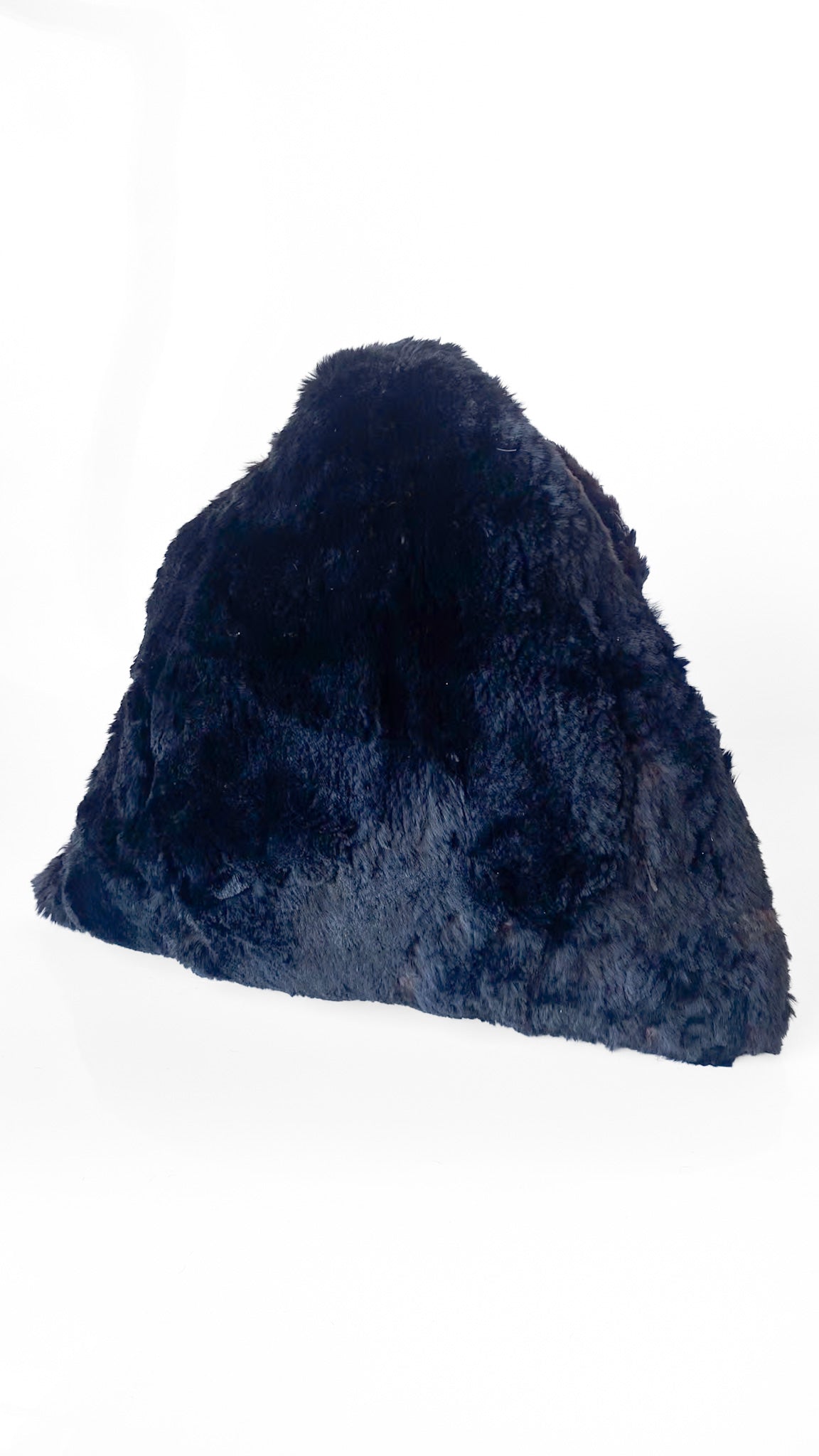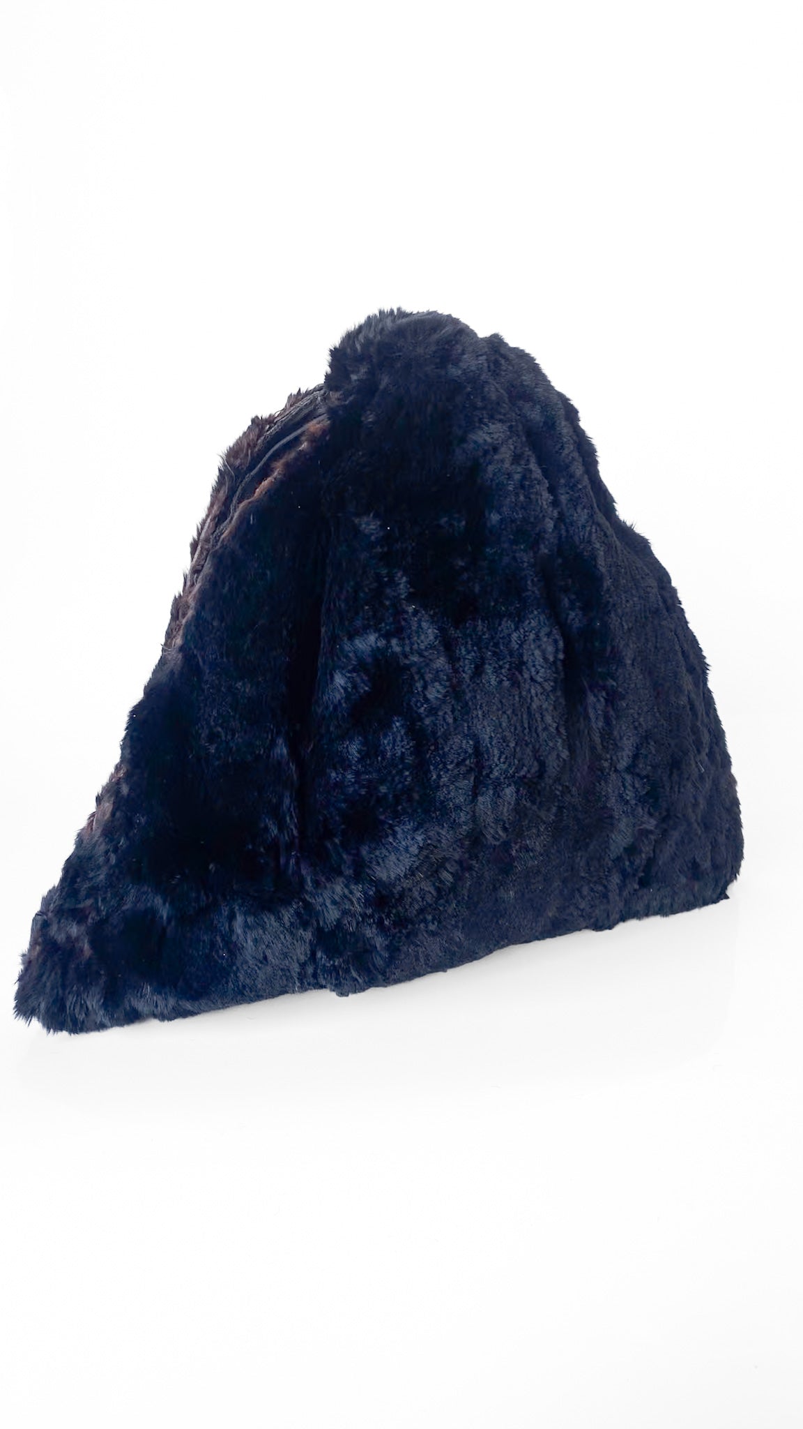 Description: Black triangular muff purse with fur exterior. Cotton lining. Triangular body with an opening on each side for hands to enter or can hold top point as a handle.