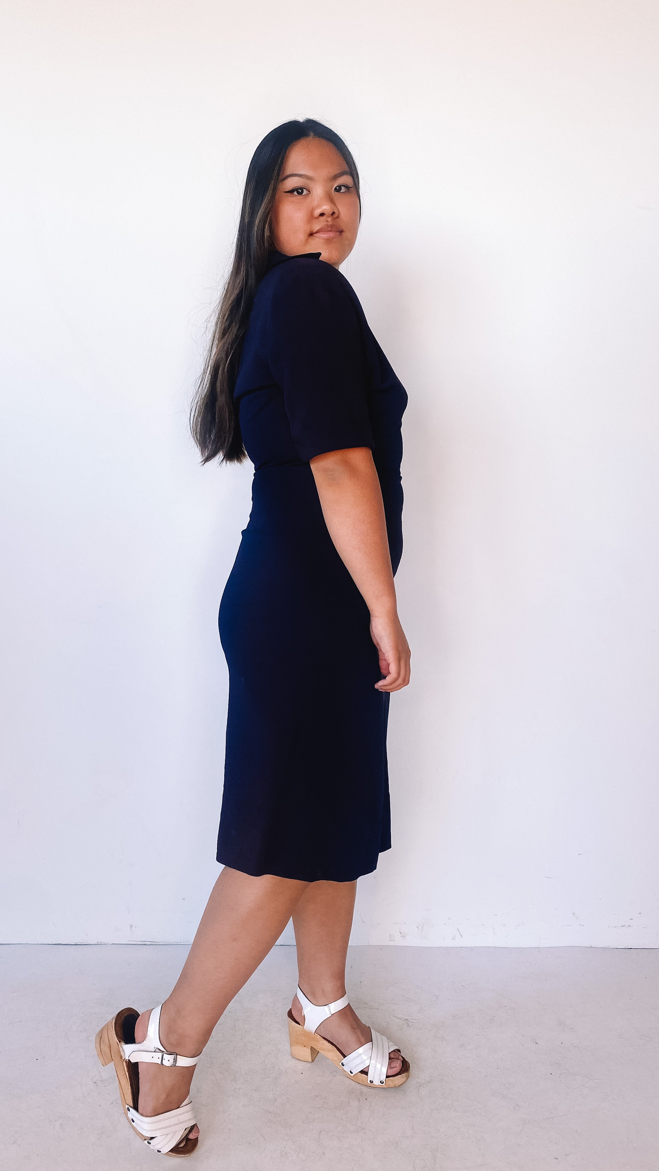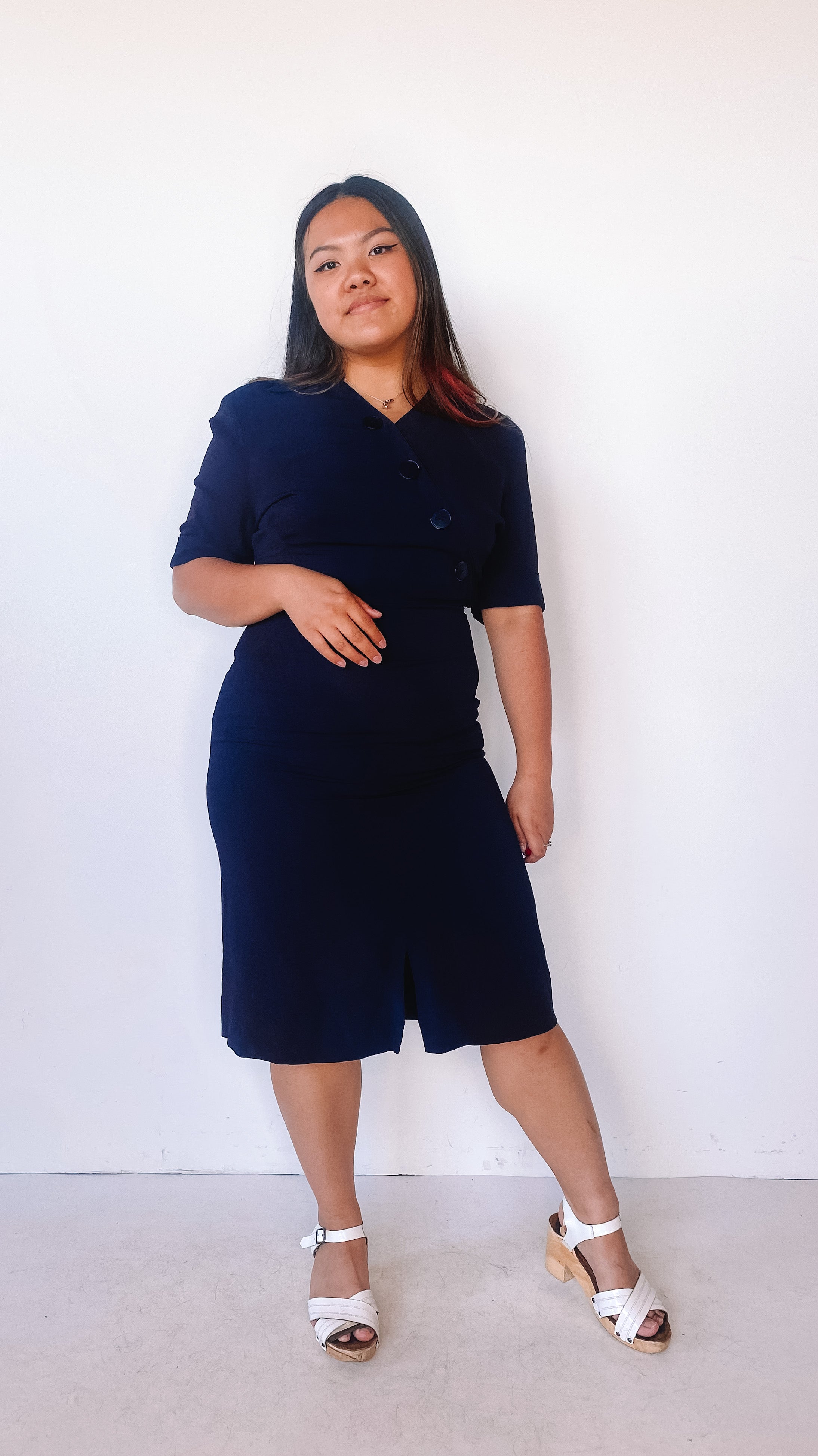 Navy blue dress with buttons diagonally across the bust. Shoulder pads. Zipper on side. Good vintage condition - spots of discoloration on back near collar.