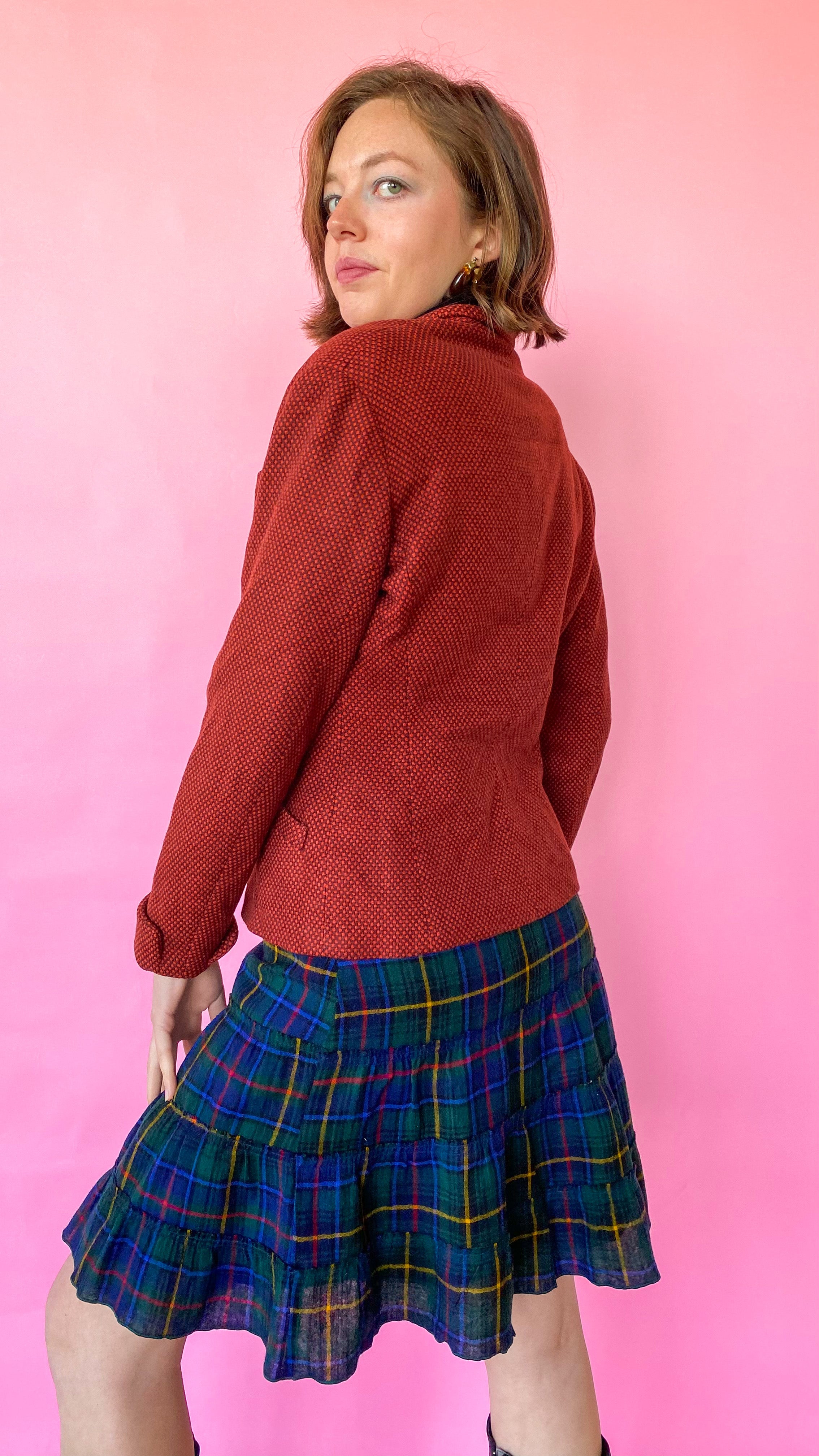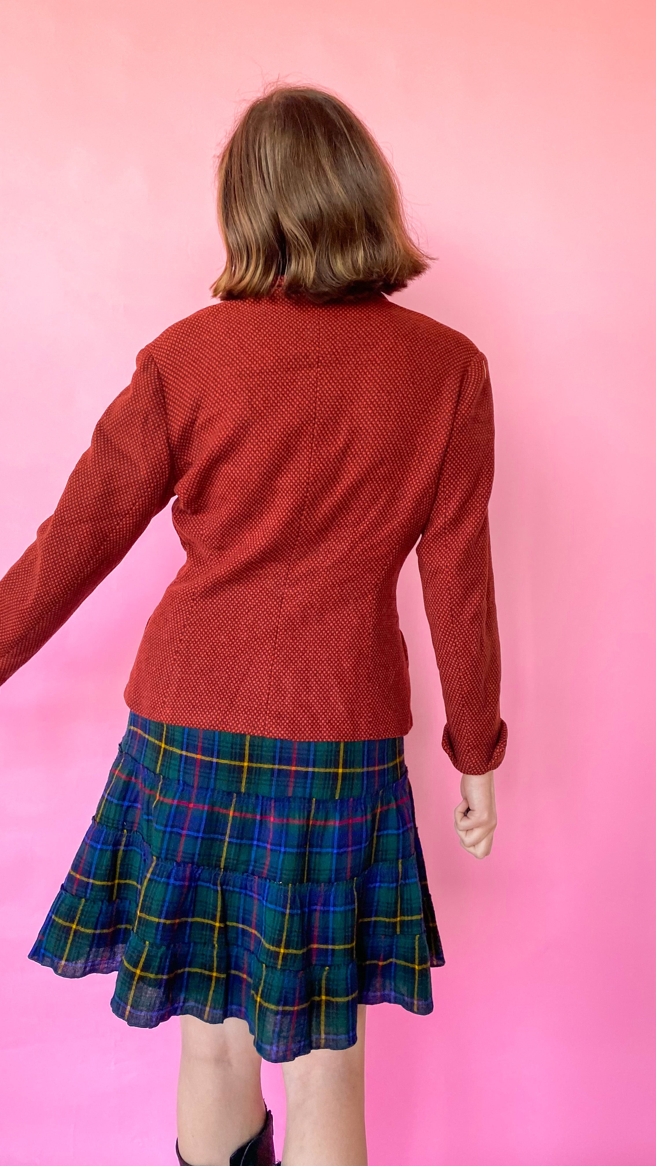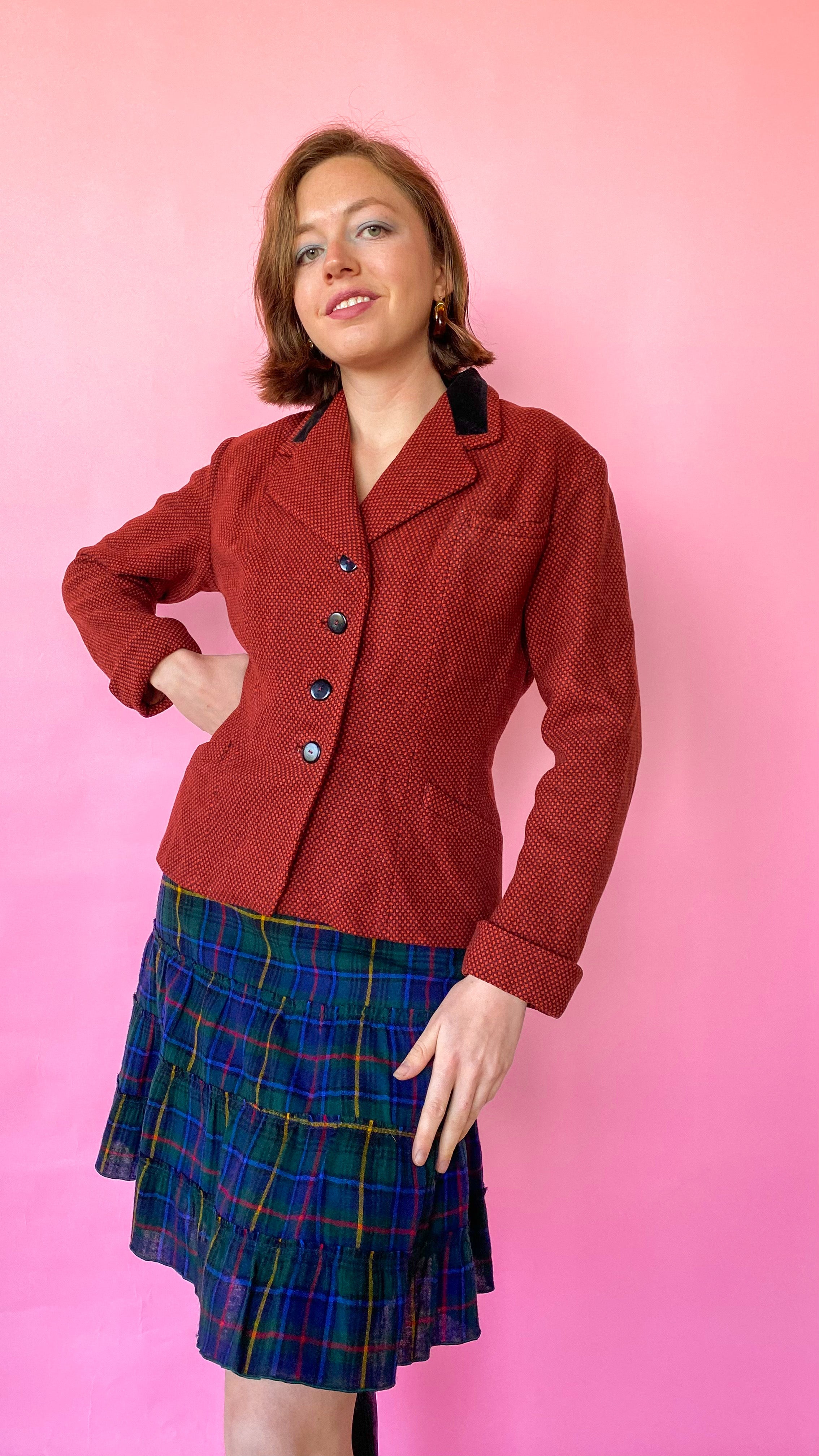 Red and black patterned jacket. Buttons up the front. Black velvet on the collar. Lined. Three small pockets on the front.