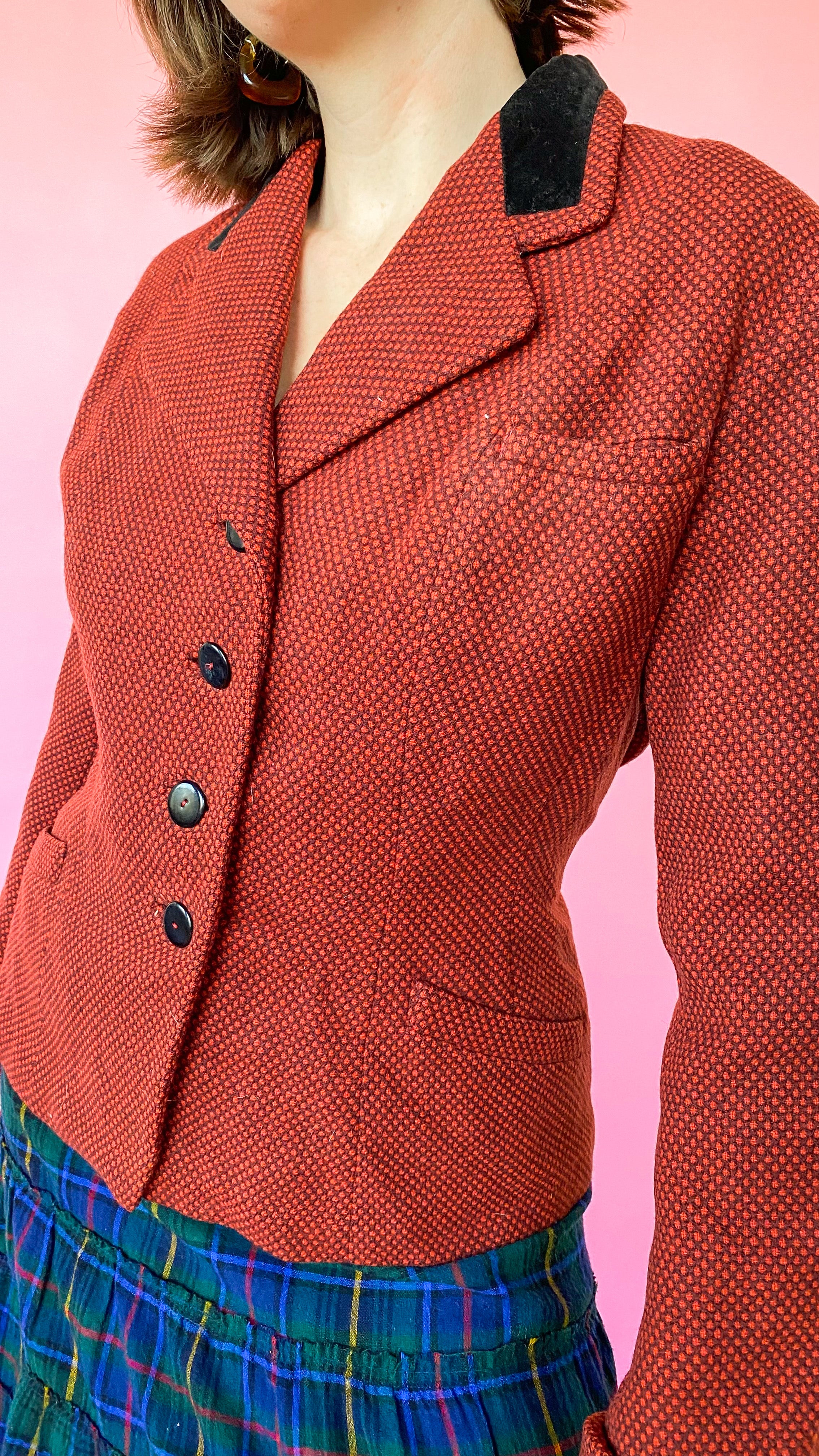 1940s Red and Black Velvet Collar Jacket, sz. S/M